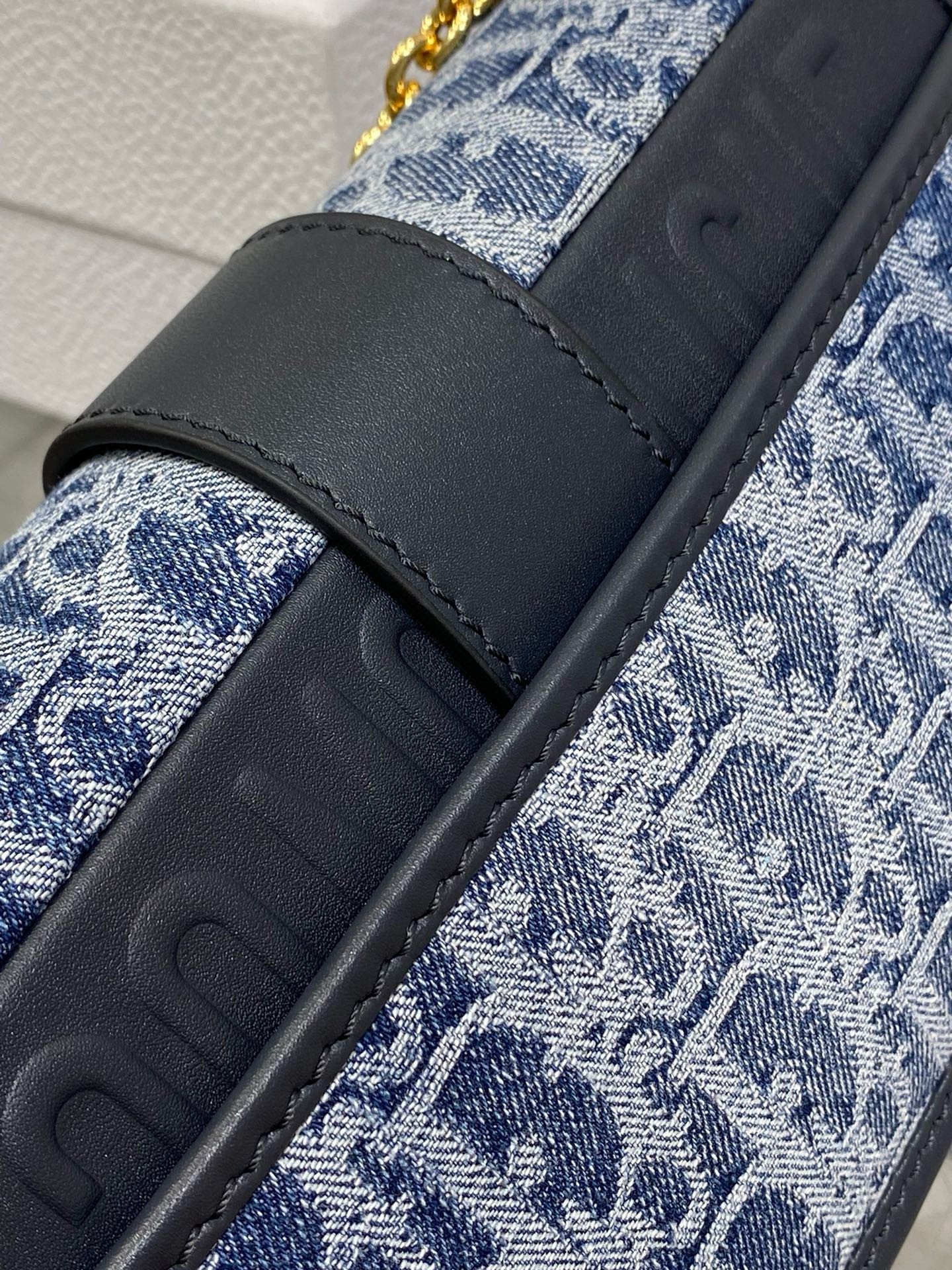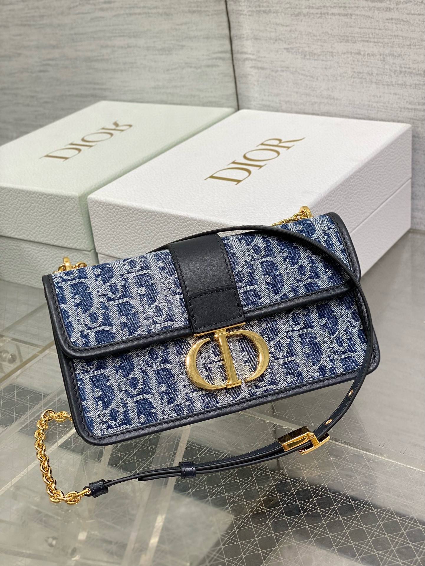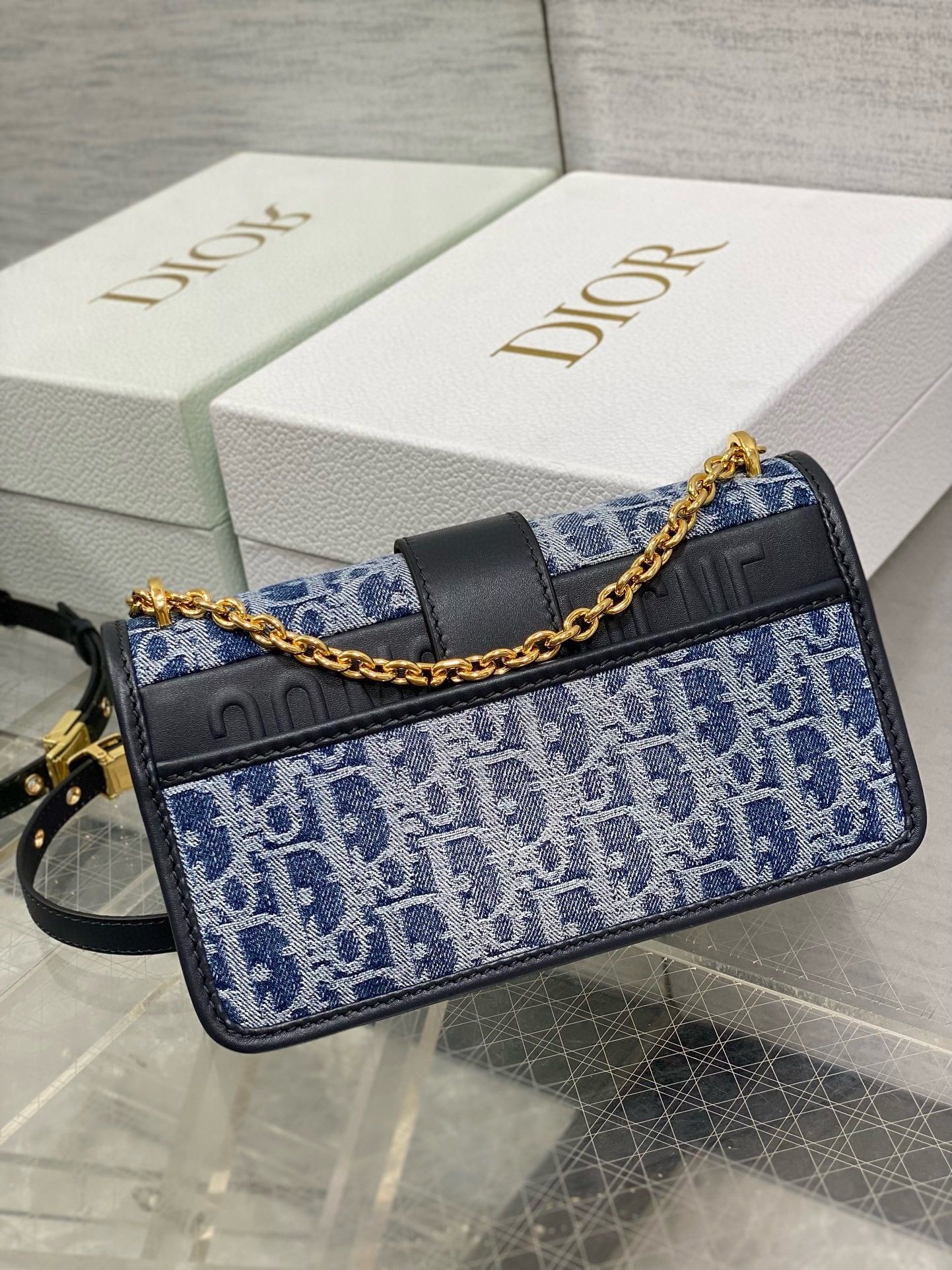 Dior 30 Montaigne East-West Bag with Chain in Blue Denim Oblique Jacquard