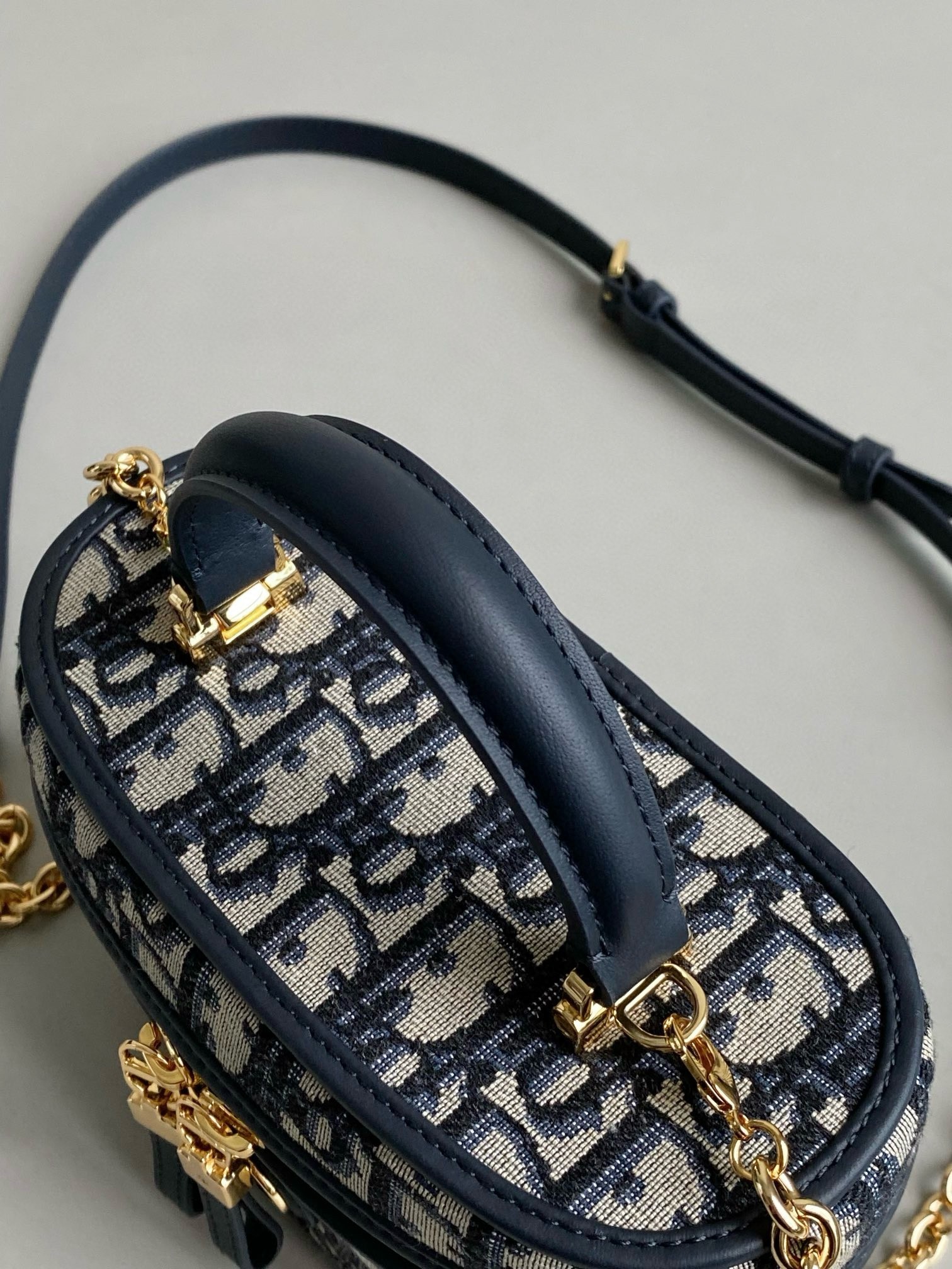 The 30 Montaigne mini vanity case expands the line with a compact design that is both functional and refined. Constructed in blue Dior Oblique jacquard, it is accented by a CD signature on the front. The vanity case will accommodate all the essentials and is completed by an interior pocket and mirror. It can be carried by hand with the handle or worn over the shoulder or crossbody using the adjustable shoulder strap that alternates between gold-finish metal and blue enamel links with a leather insert for added comfort.