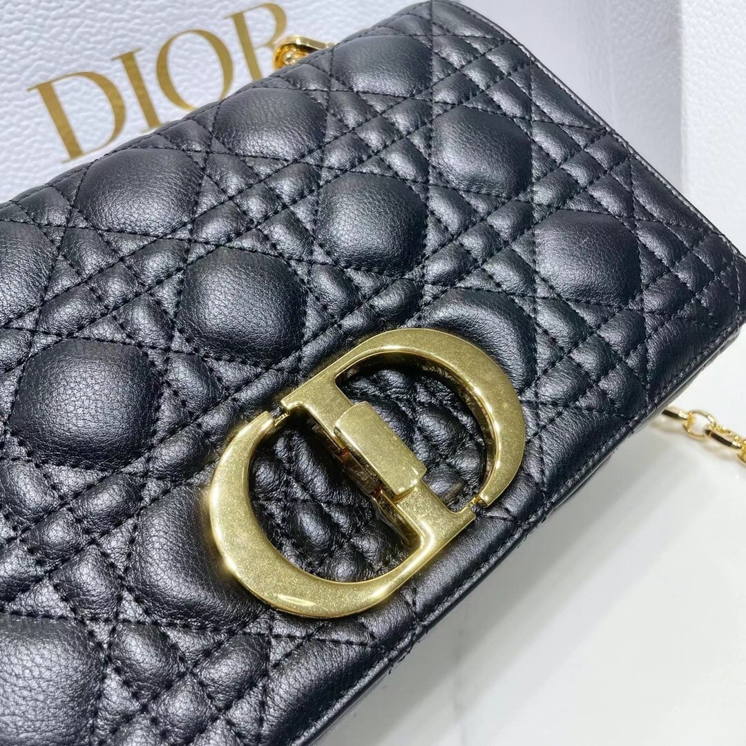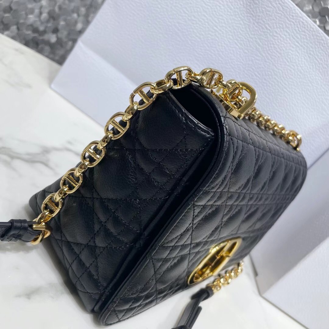 The Dior Caro bag combines modernity with timeless elegance. The design is crafted in black calfskin with Cannage stitching. The supple bag features a flap adorned with an antique gold-finish metal 'CD' twist clasp, inspired by the seal of a Christian Dior perfume bottle. The detachable chain shoulder strap with 'CD' signature links allows the medium bag to be carried by hand or worn over the shoulder and may be replaced by one of the House's wide embroidered straps for day or evening attire.