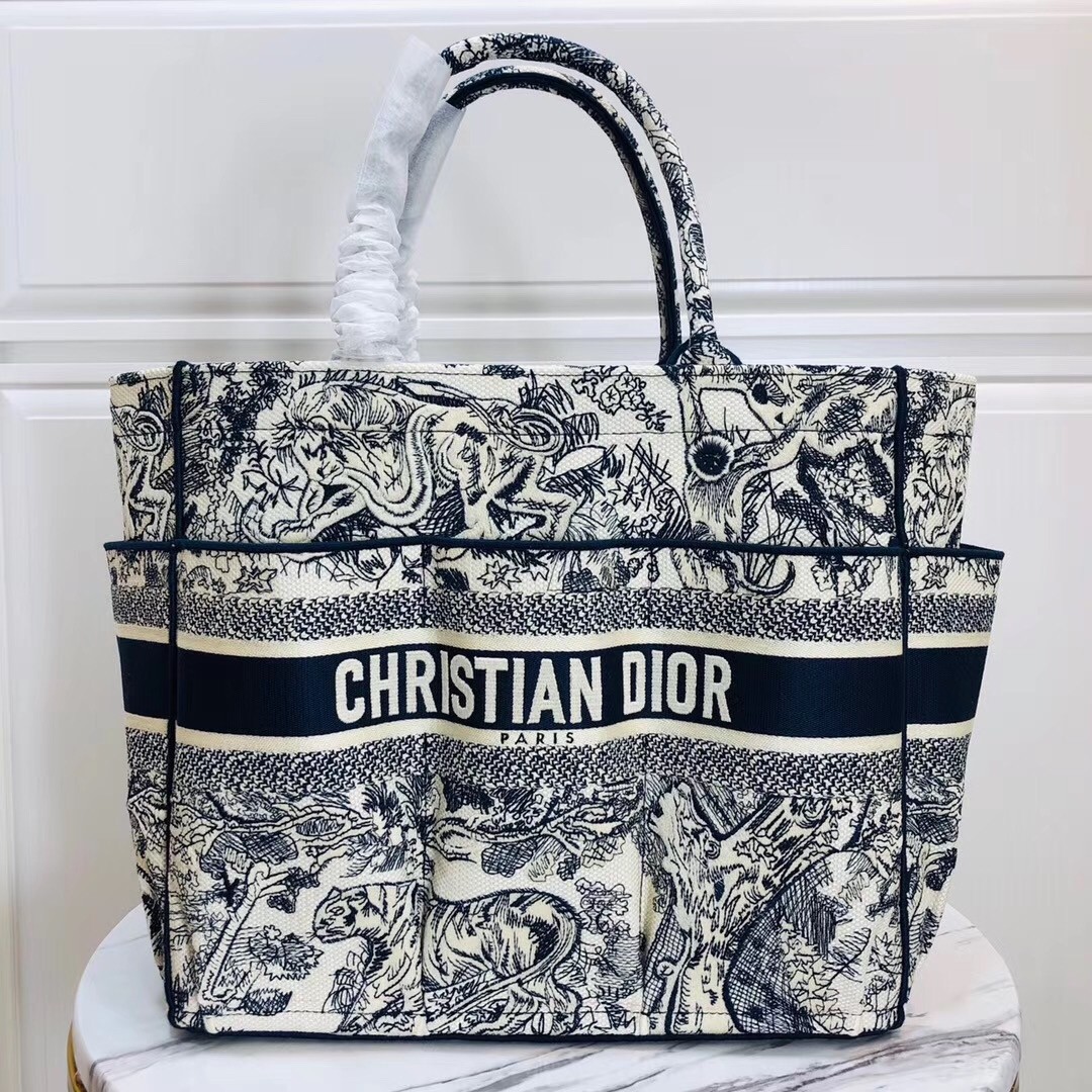 The Catherine Tote is an original style introduced by Maria Grazia Chiuri, inspired by Christian Dior's sister and her love of the garden. Ideally designed to carry every daily essential, the bag features eight exterior pockets and is fully embroidered with the blue Toile de Jouy pattern. Featuring the 'Christian Dior' signature on the front, this carryall is a perfect example of the Dior savoir-faire.