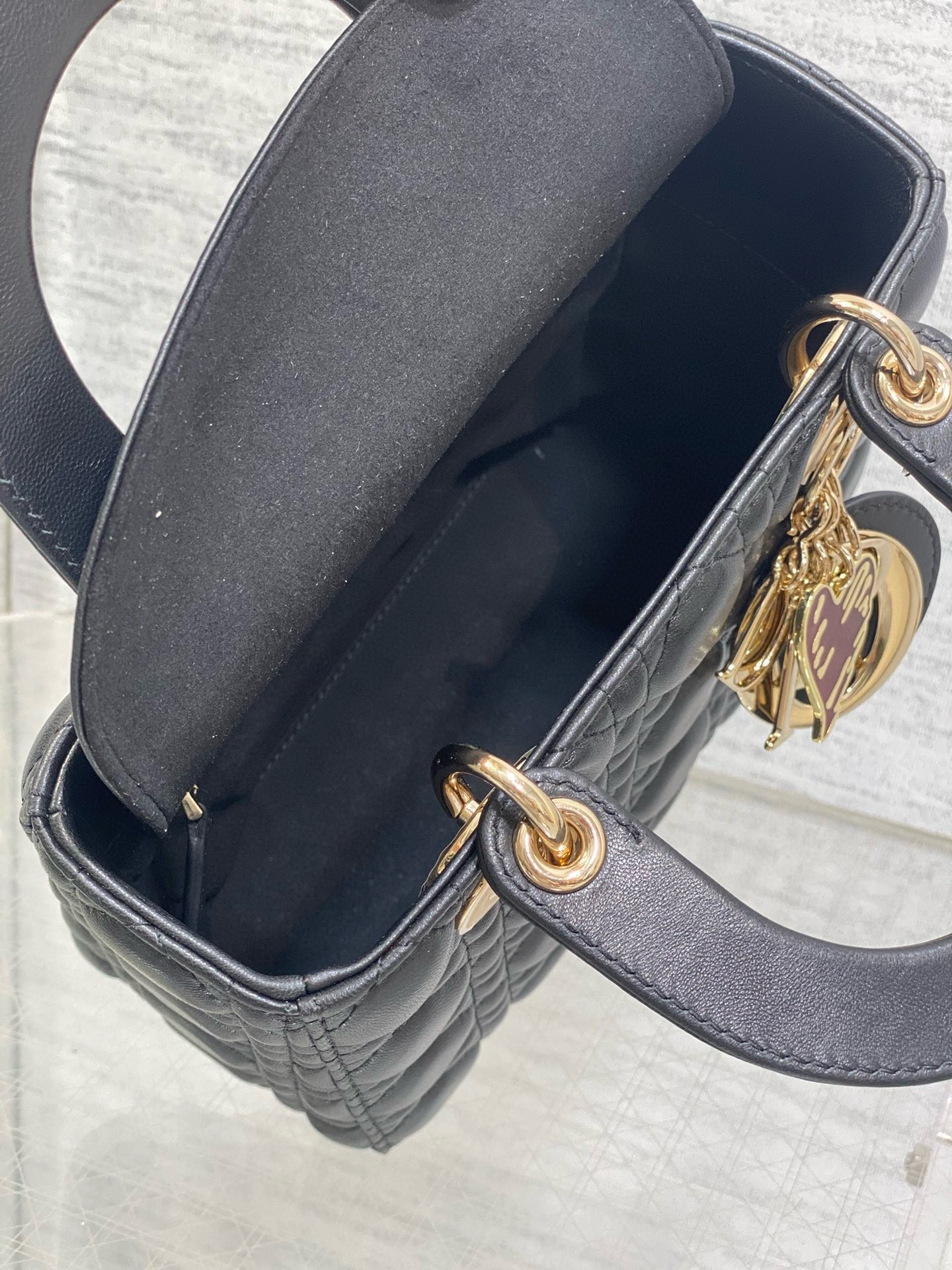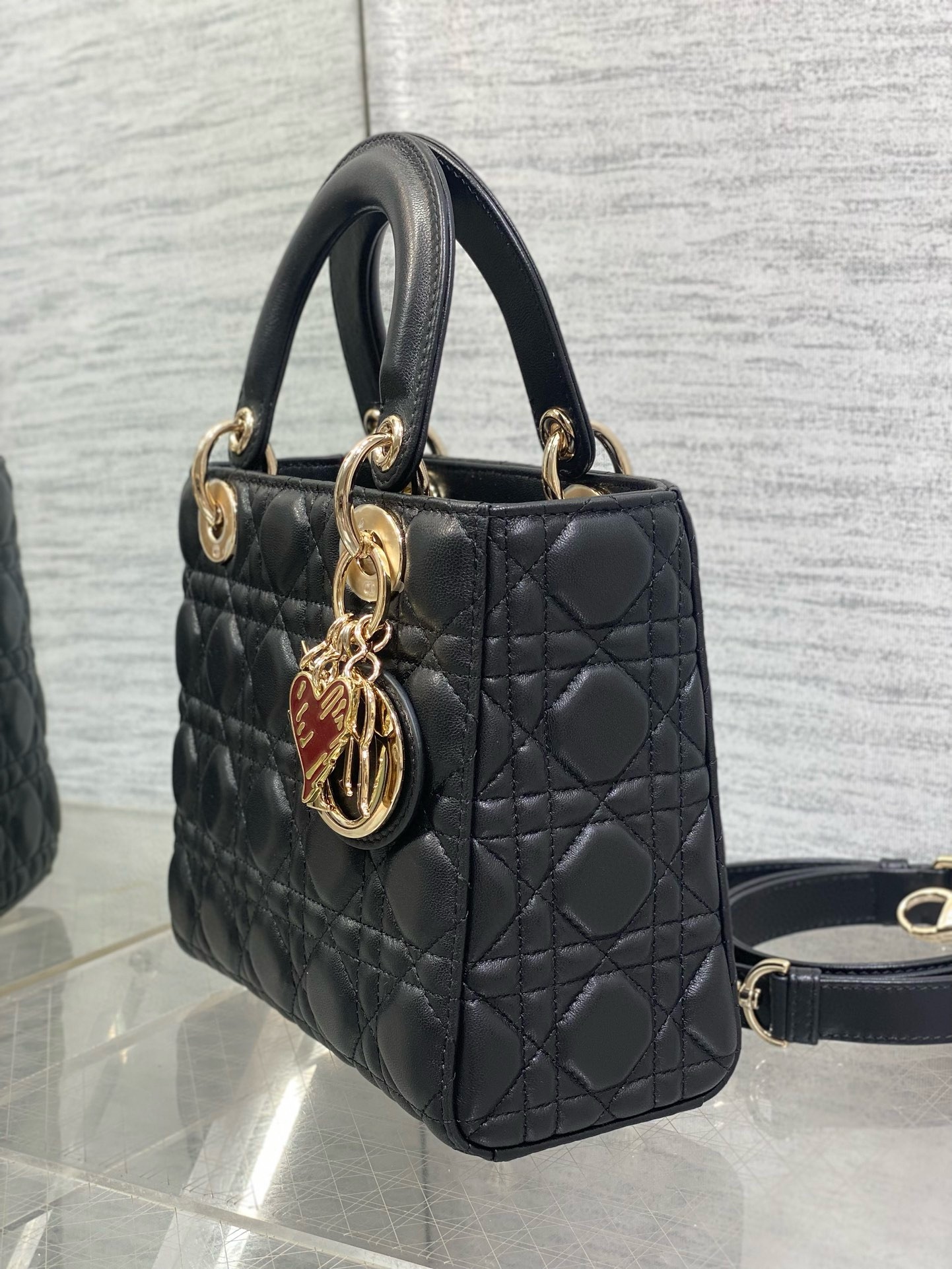 Part of the Dioramour capsule, the Lady Dior bag embodies the House's vision of elegance and beauty. Refined and sophisticated, the timeless style is crafted in lambskin with Cannage stitching, creating the instantly recognizable quilted texture. The silhouette is elevated by pale gold-finish metal D.I.O.R. charms and a red enamel heart charm. The small Lady Dior bag has a thin, removable leather strap, allowing it to be carried by hand or worn crossbody. It can be coordinated with other Dioramour creations.