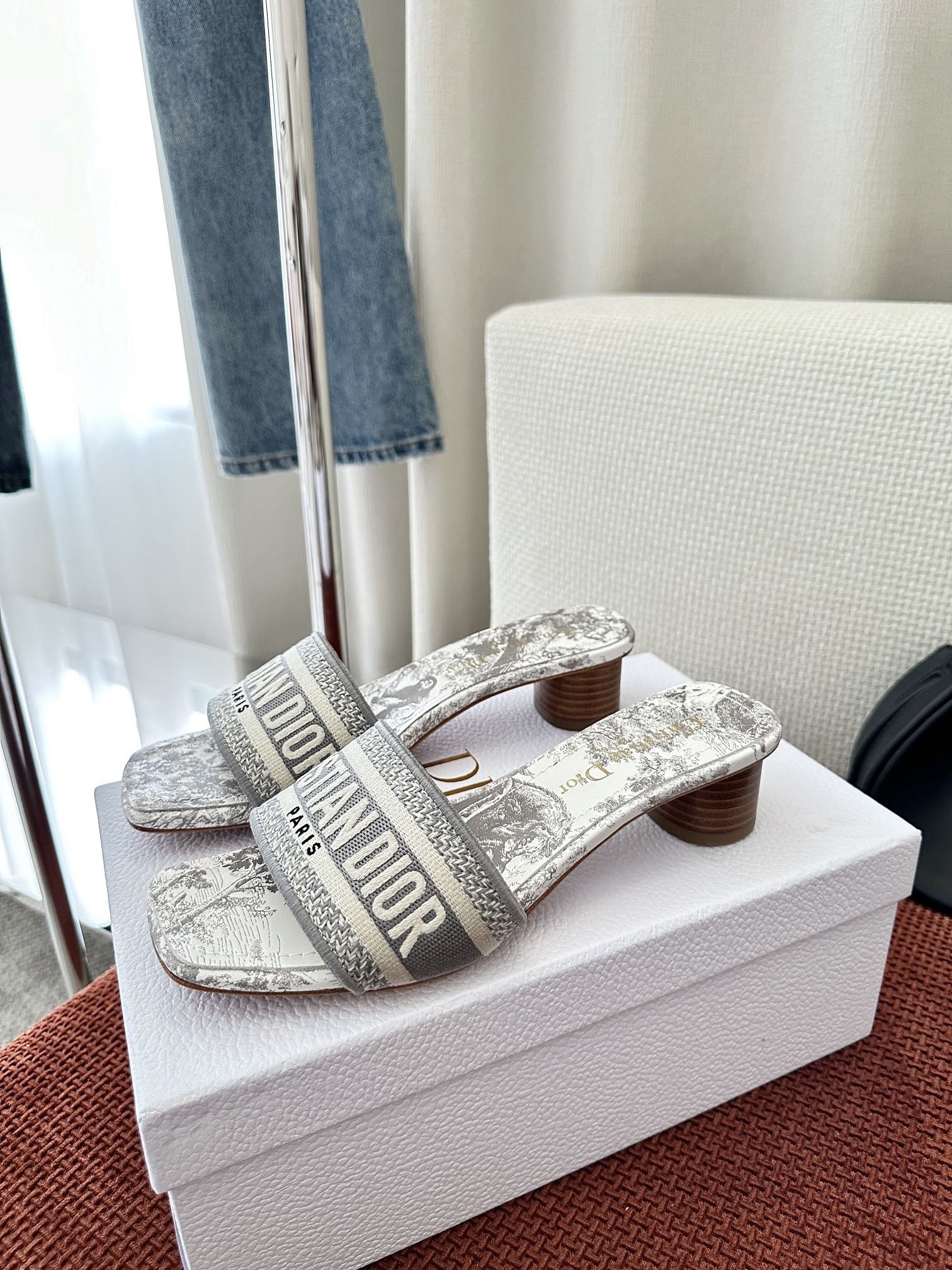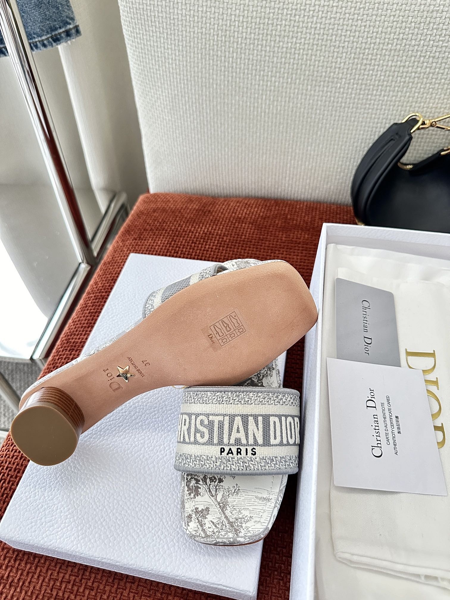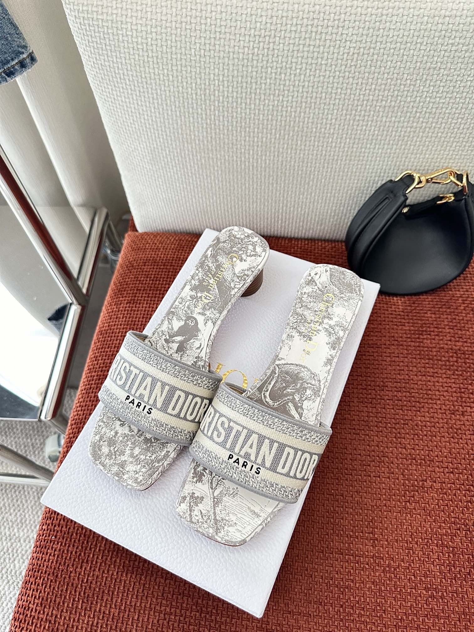 art of the Dioriviera capsule, the hallmark Dway heeled slide honors the Toile de Jouy Sauvage motif. The gray upper is embroidered with the Christian Dior Paris signature for an instantly recognizable touch, while the square toe adds modern appeal. Completed by a 3.5-cm (1.5) cylindrical heel, the slide will bring a contemporary twist to outfits and can be coordinated with other pieces from the Dioriviera capsule.