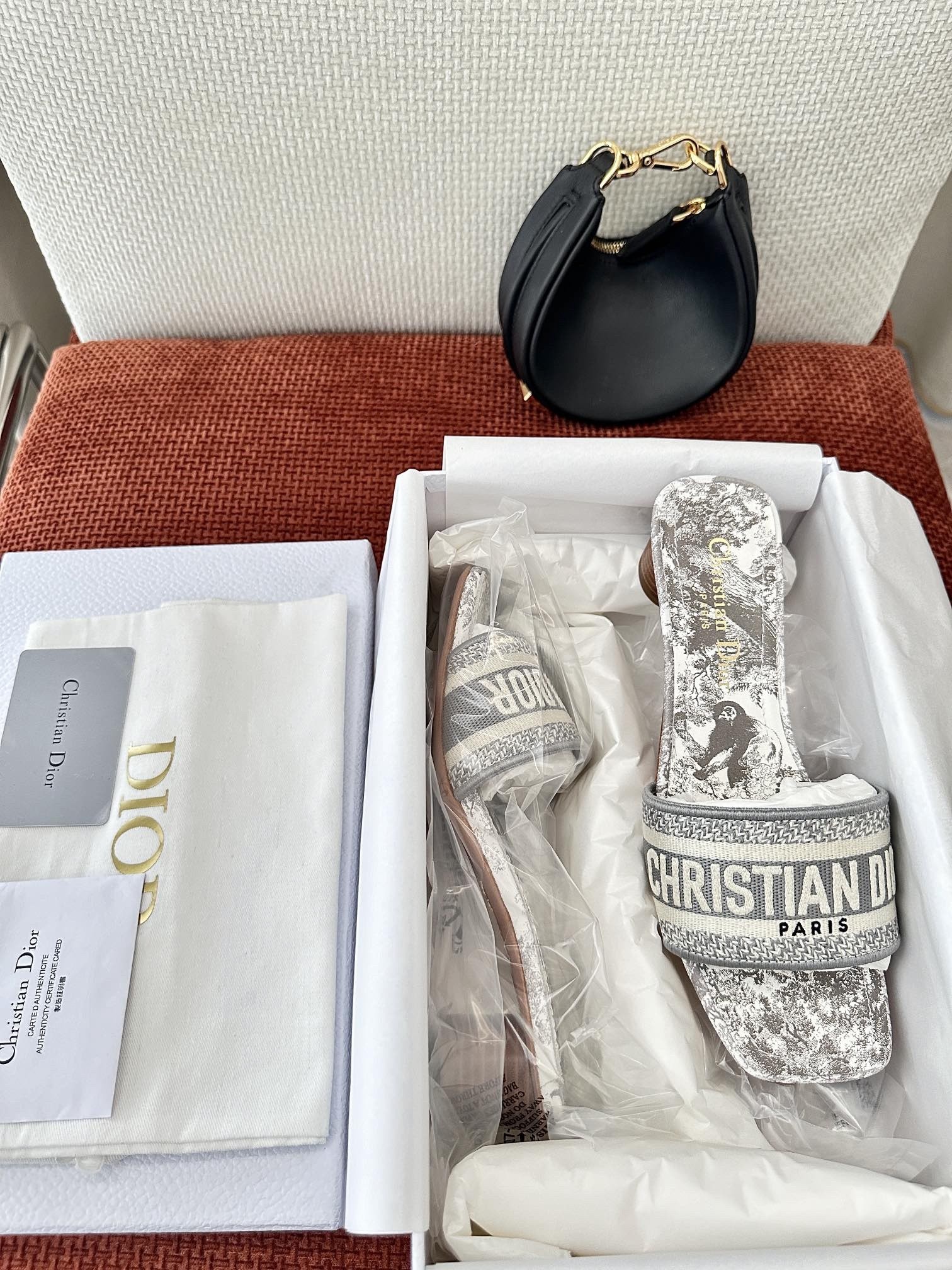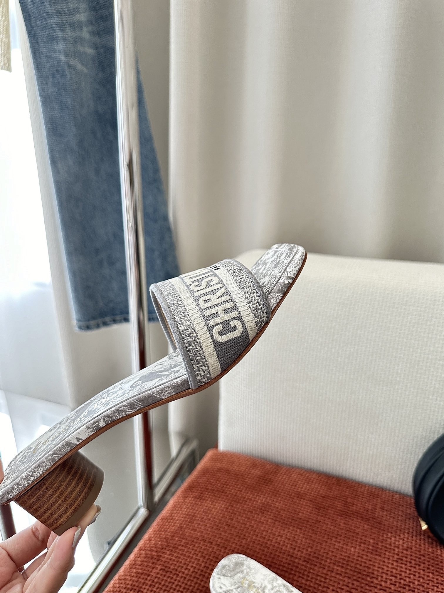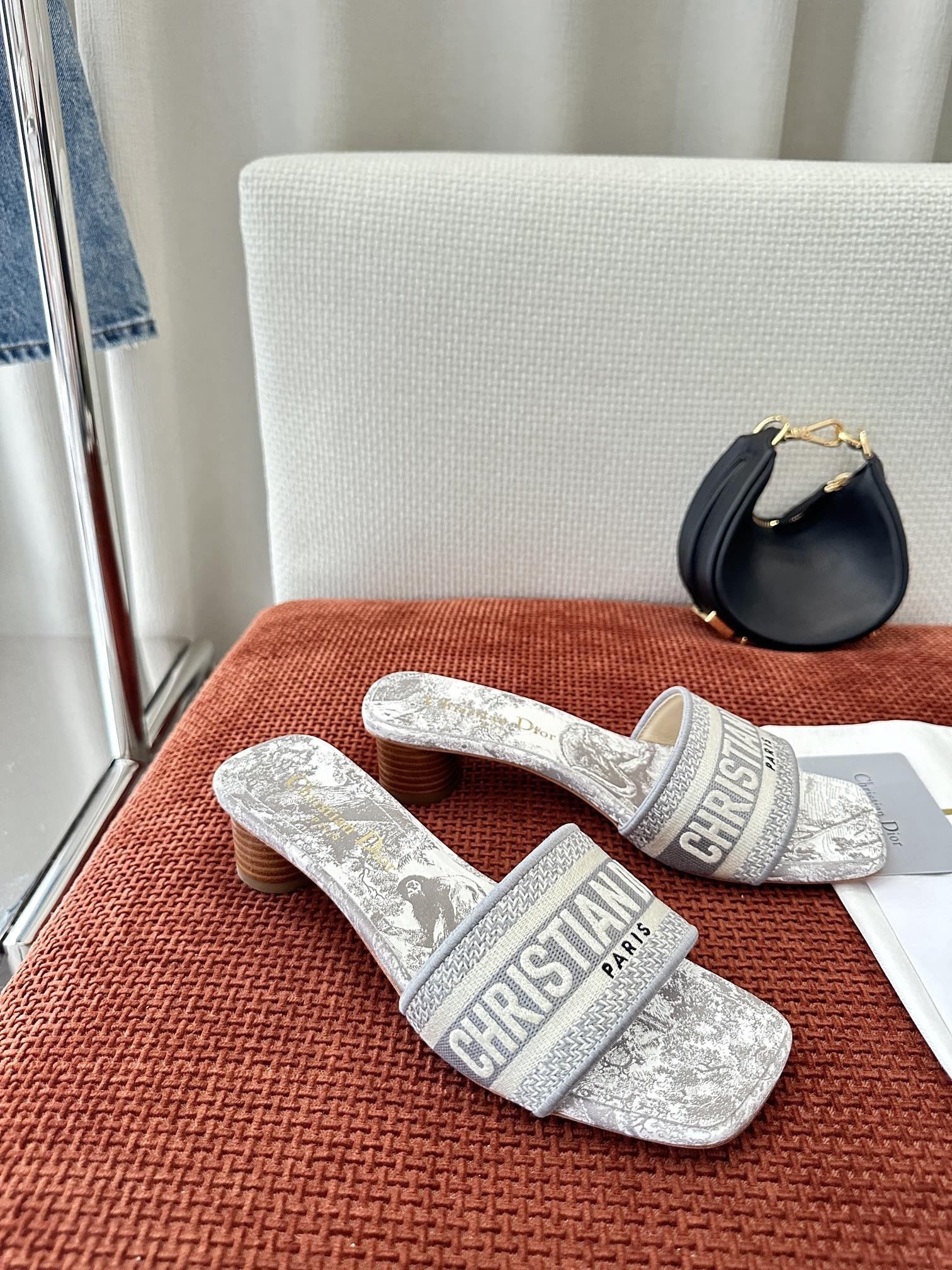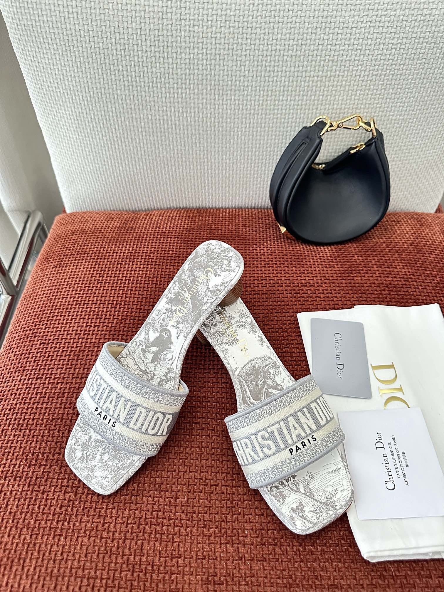 art of the Dioriviera capsule, the hallmark Dway heeled slide honors the Toile de Jouy Sauvage motif. The gray upper is embroidered with the Christian Dior Paris signature for an instantly recognizable touch, while the square toe adds modern appeal. Completed by a 3.5-cm (1.5) cylindrical heel, the slide will bring a contemporary twist to outfits and can be coordinated with other pieces from the Dioriviera capsule.