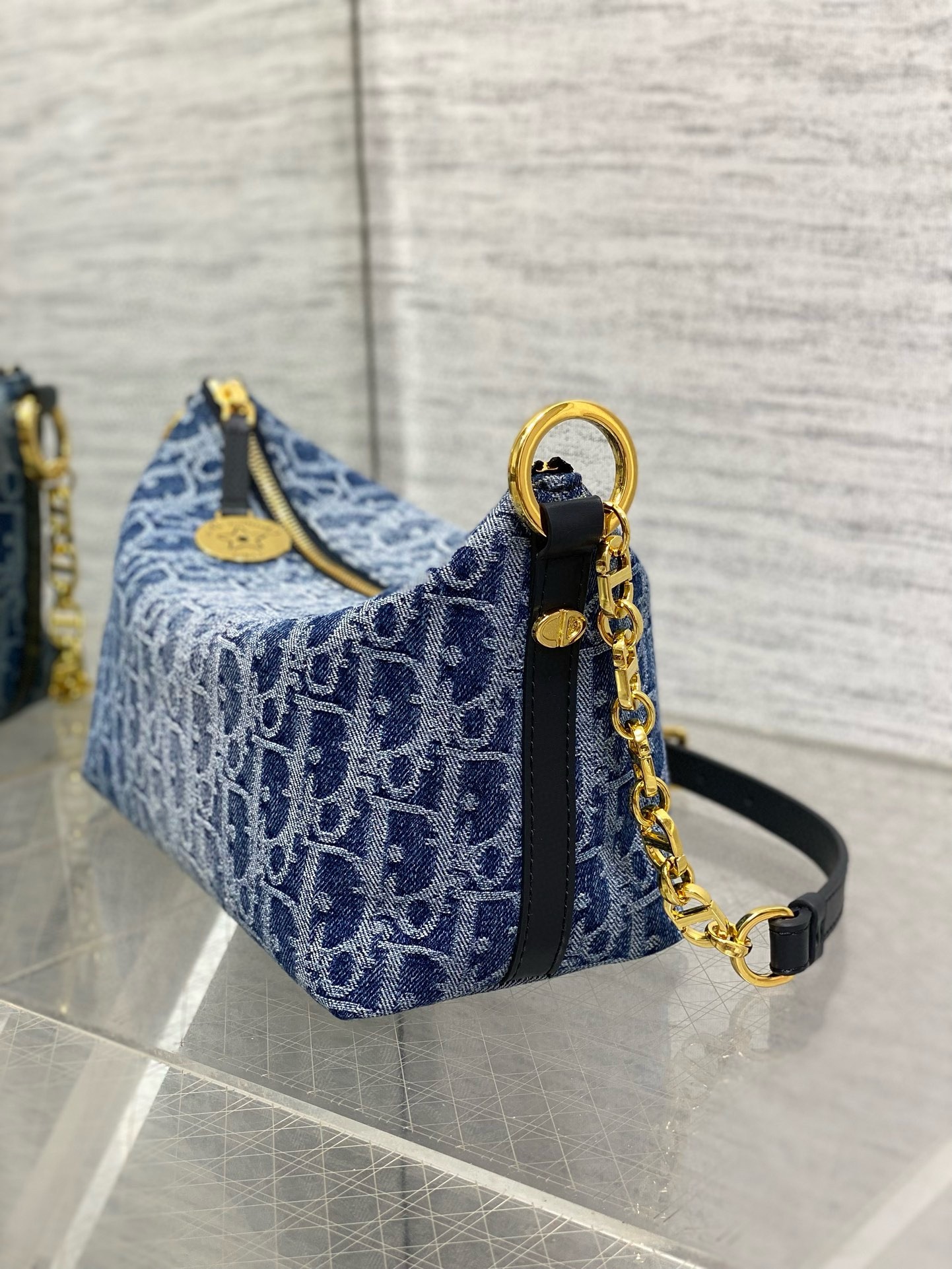 The Diorstar hobo bag with chain has a practical, modern look. Crafted in blue Denim Dior Oblique jacquard offering a new take on the iconic House motif with the modern appeal of an irregular stonewashed effect, it features a supple silhouette and spacious compartment. Its design is enhanced by a zip closure embellished with a medallion engraved with the Christian Dior Paris signature and a star, the House's flagship symbol, while discreet CD studs adorn the sides. The interior is lined with suede calfskin and includes card slots. A leather insert on the adjustable CD chain link shoulder strap allows the bag to be worn comfortably over the shoulder.