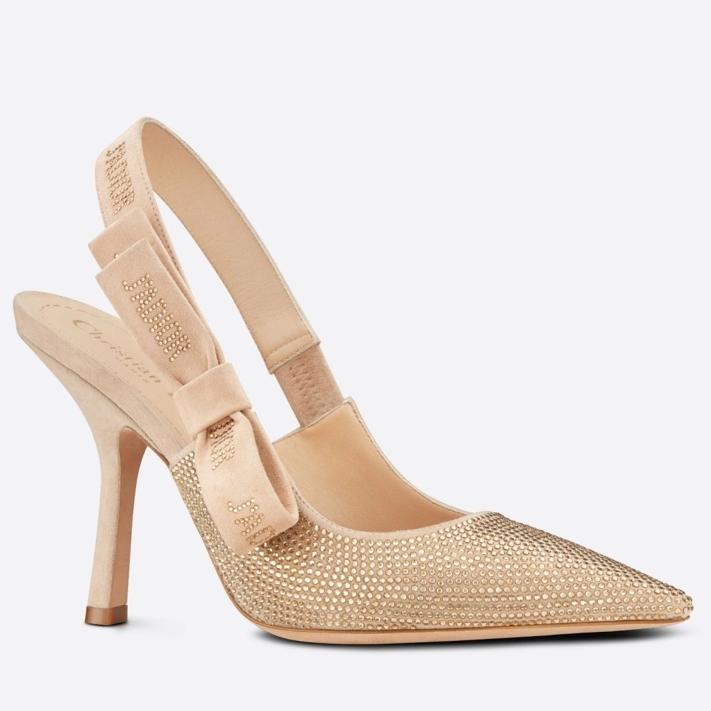 The J'Adior slingback pump is a prime example of Dior's savoir-faire. The luminous style is crafted in nude suede calfskin entirely covered in gold strass. The signature strass 'J'Adior' motif adorns the suede calfskin ribbon and flat bow and combines with the 10 cm comma heel for an elegant and refined evening look.