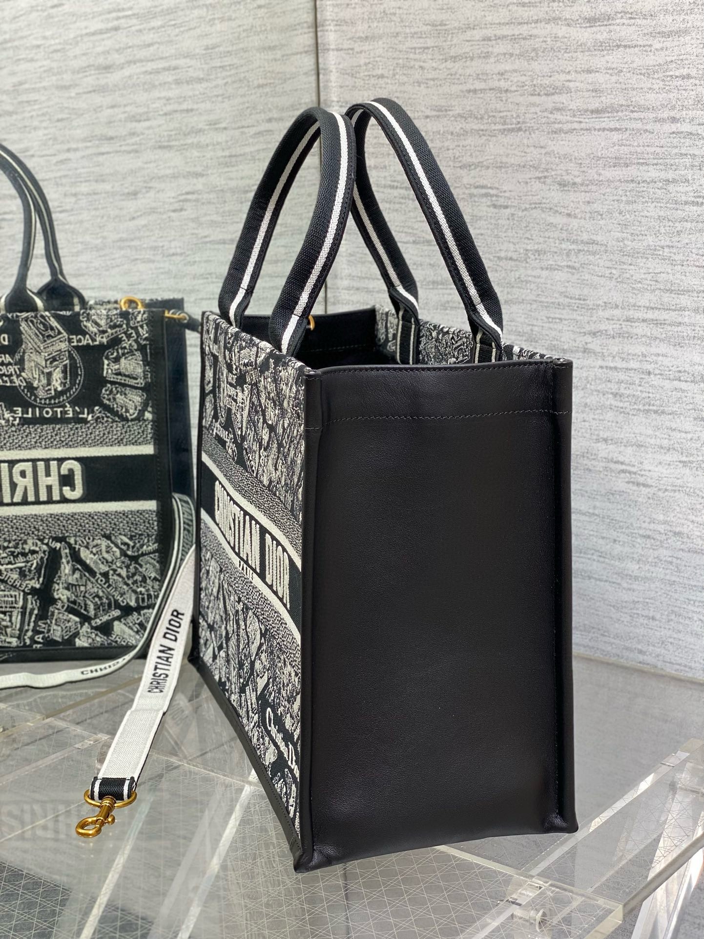 Dior Medium Book Tote Bag with Strap in Plan de Paris Embroidery and Black Calfskin