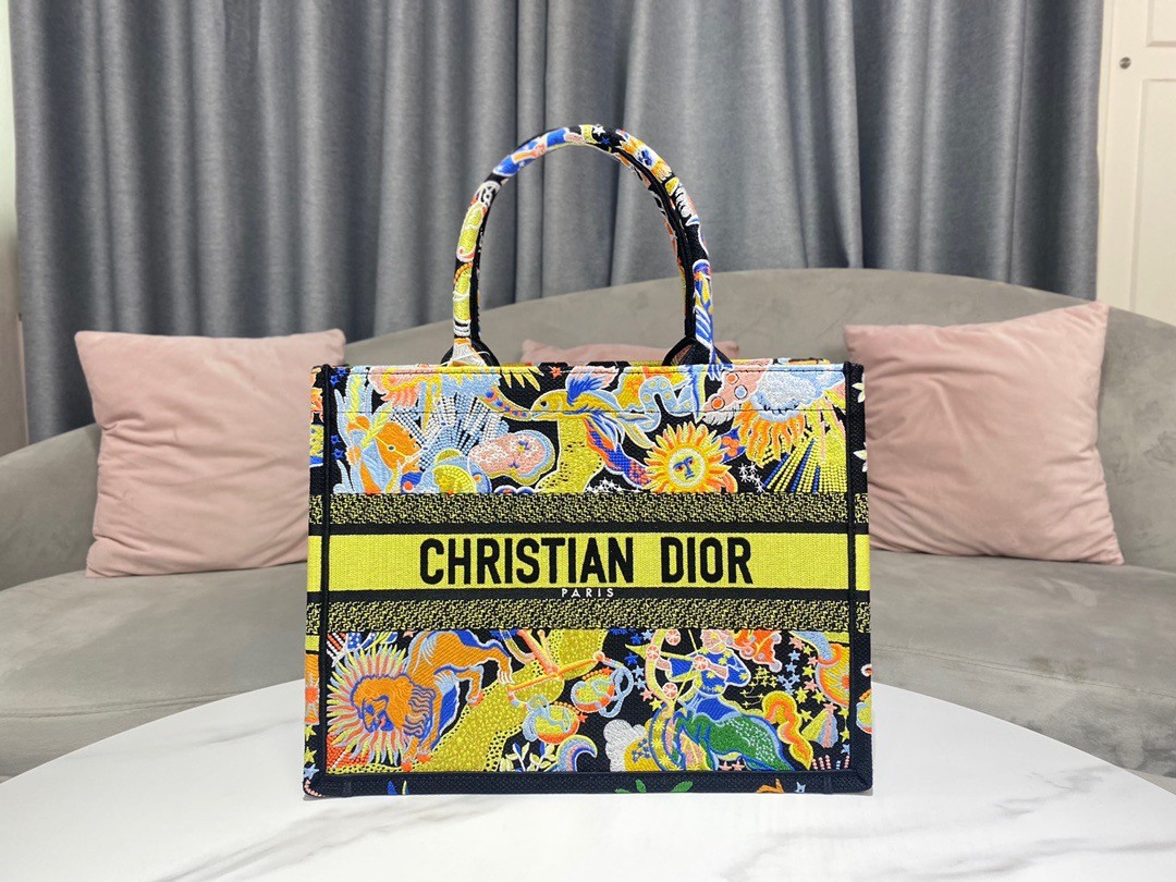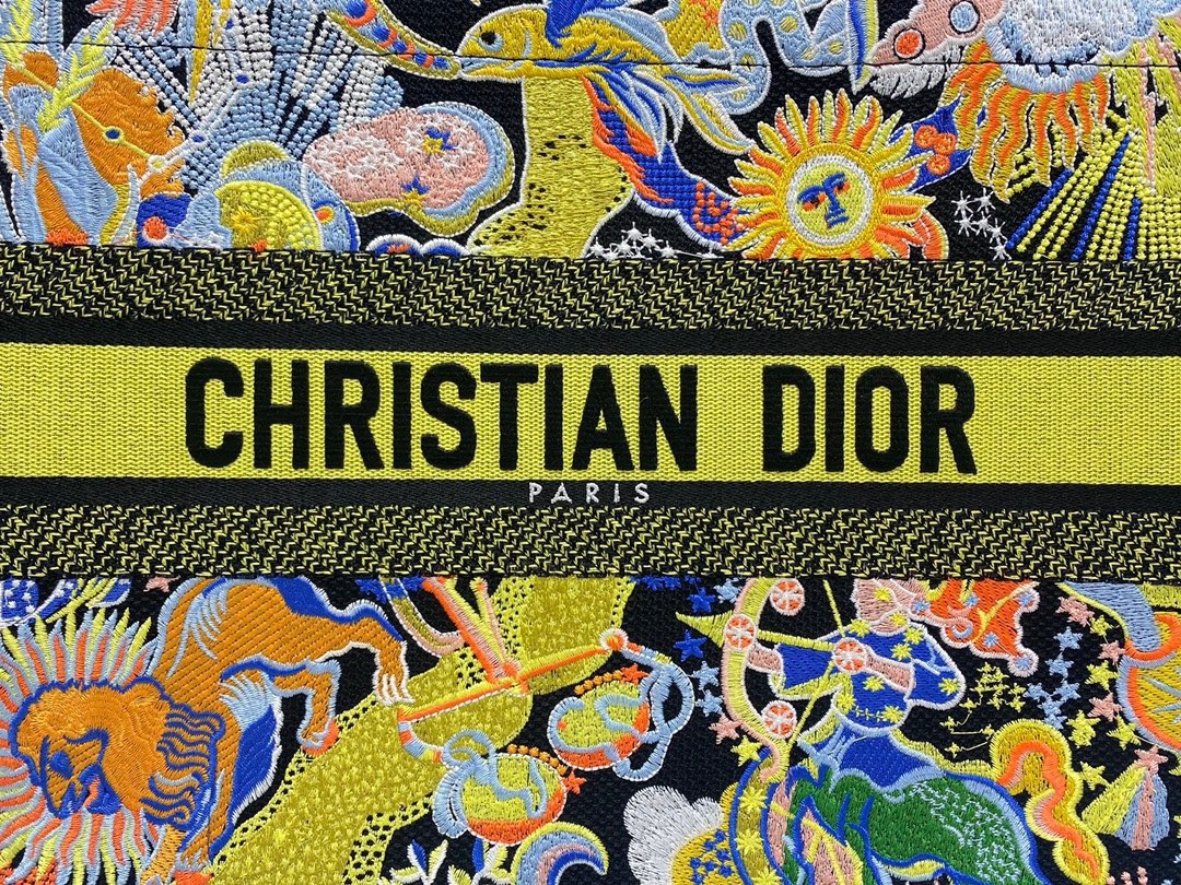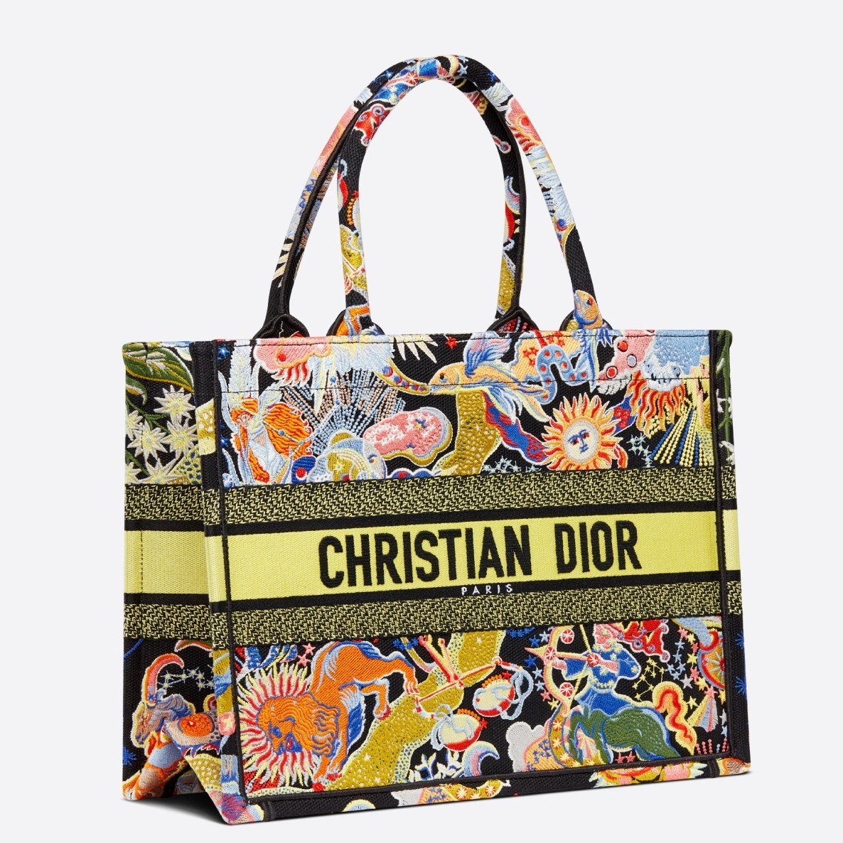 The Dior Book Tote is an original creation introduced by Maria Grazia Chiuri, Dior's Creative Director, and has become a staple of the Dior aesthetic. Designed to hold the daily essentials, the style is fully embroidered with the black multicolor Dior Zodiac Fantastico motif by Pietro Ruffo, inspired by Mr. Dior's fascination with astrology in a pastoral spirit. Adorned with the 'CHRISTIAN DIOR PARIS' signature on the front, the medium tote exemplifies the House's signature savoir-faire and may be carried by hand or worn over the shoulder.
