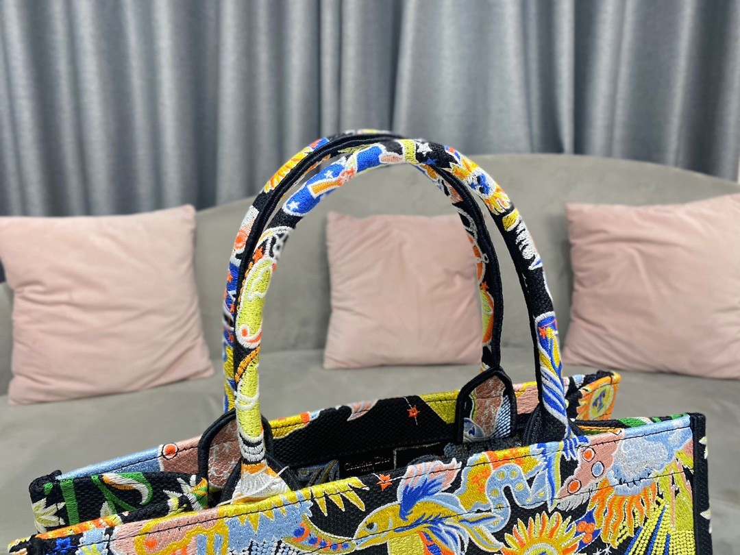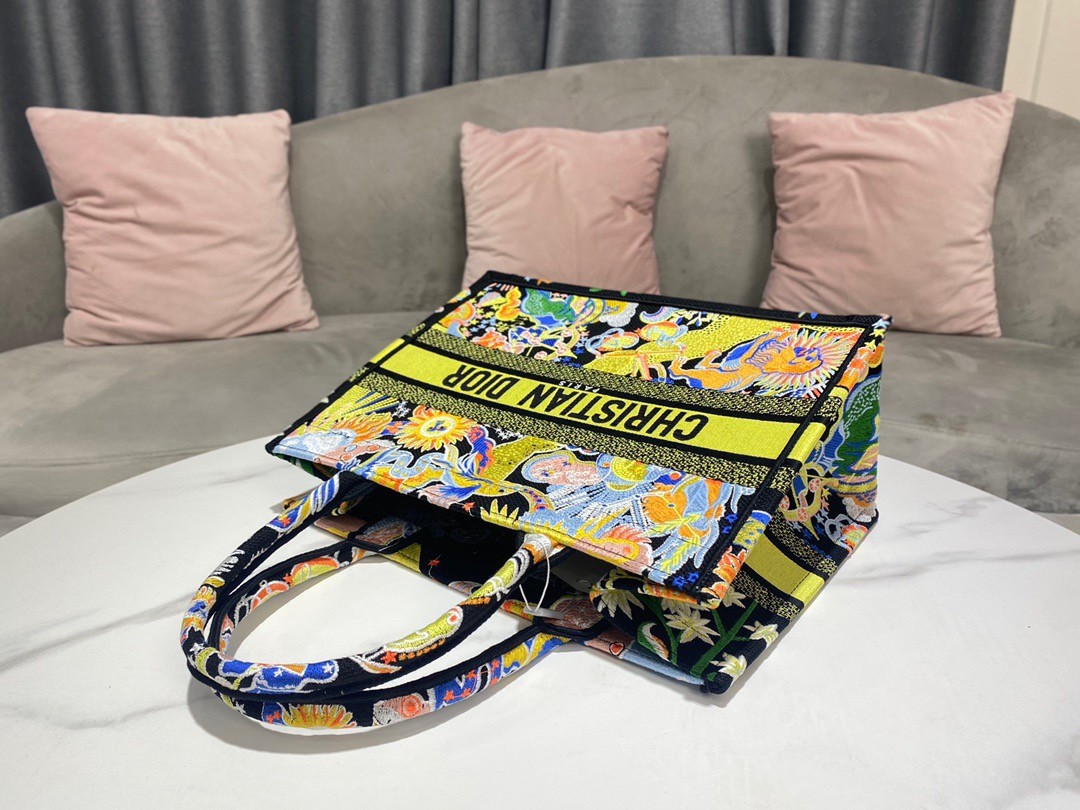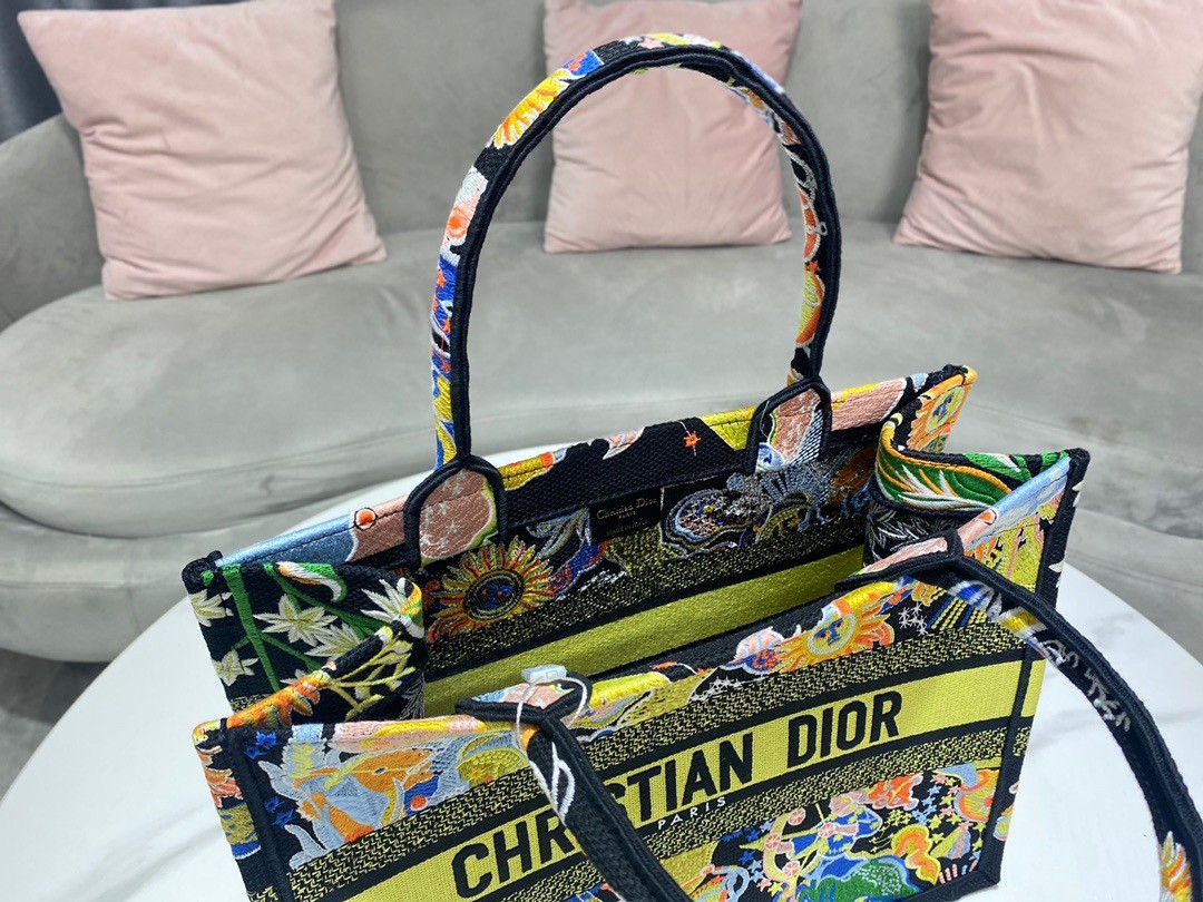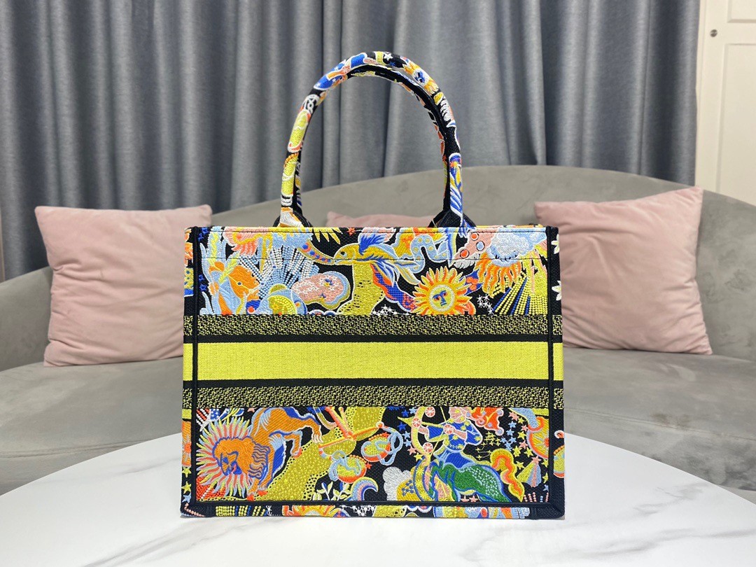 The Dior Book Tote is an original creation introduced by Maria Grazia Chiuri, Dior's Creative Director, and has become a staple of the Dior aesthetic. Designed to hold the daily essentials, the style is fully embroidered with the black multicolor Dior Zodiac Fantastico motif by Pietro Ruffo, inspired by Mr. Dior's fascination with astrology in a pastoral spirit. Adorned with the 'CHRISTIAN DIOR PARIS' signature on the front, the medium tote exemplifies the House's signature savoir-faire and may be carried by hand or worn over the shoulder.