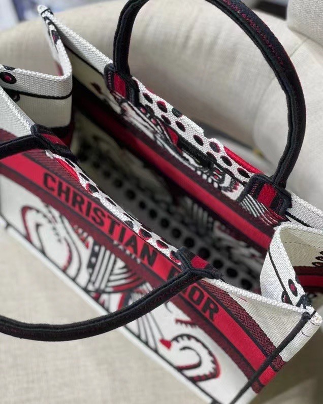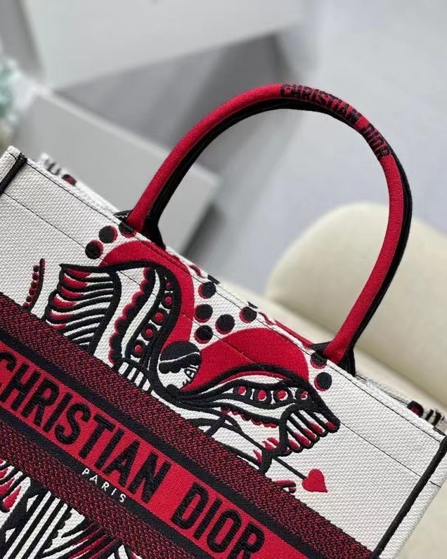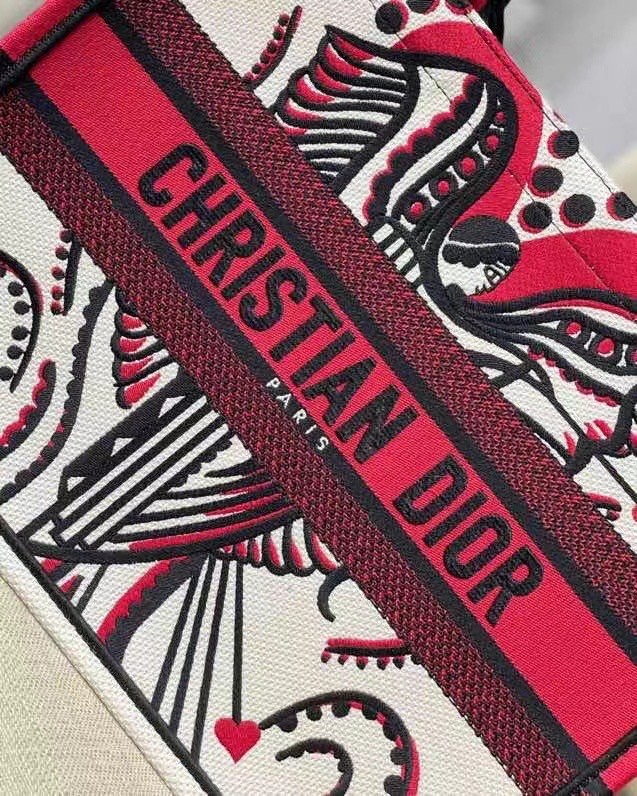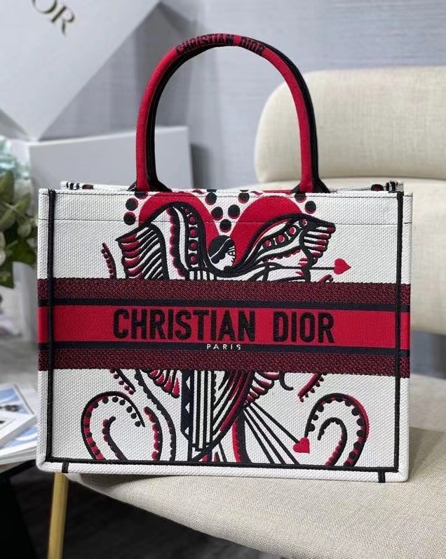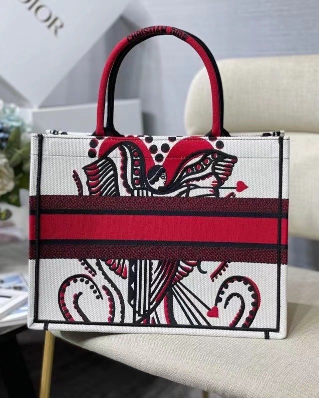 he Dior Book Tote is an original creation introduced by Maria Grazia Chiuri, Dior's Creative Director, and has become a staple of the Dior aesthetic. Designed to hold all the daily essentials, it is fully embroidered with the latte multicolor Cupidon motif, resonating with the Greek inspiration of the collection through a romantic print. Adorned with the 'CHRISTIAN DIOR' signature on the front, the medium tote exemplifies the House's signature savoir-faire and may be carried by hand or worn over the shoulder.