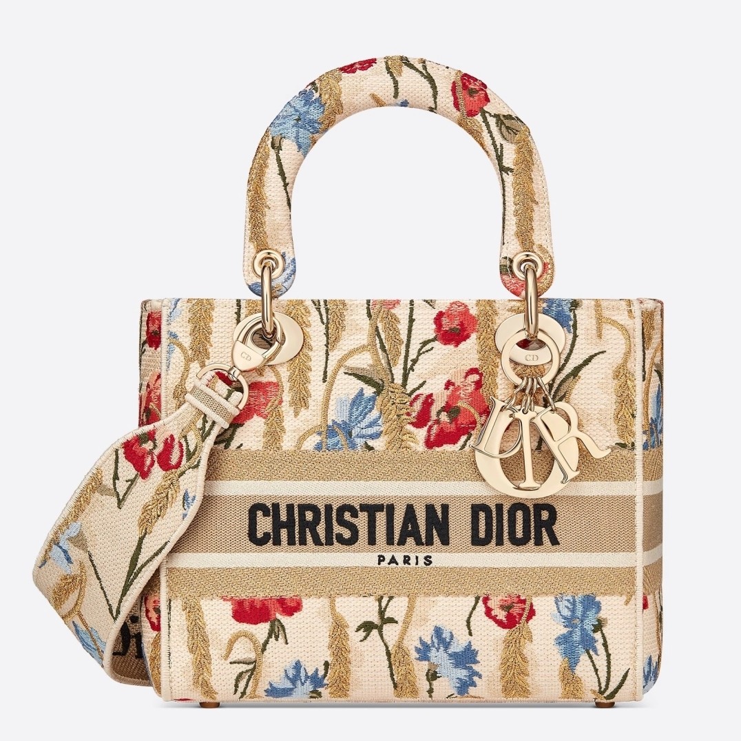 The Lady Dior handbag epitomizes Dior's vision of elegance and beauty. Refined and sophisticated, the timeless yet relevant beige style is embroidered with the multicolor Dior Hibiscus motif accented with metallic thread, which is inspired by bucolic Apulian landscapes, one of the collection's central themes. Along with the 'Christian Dior' signature, it features thick pale gold-finish metal 'D.I.O.R.' charms as well as a removable leather shoulder strap. The medium bag can be paired with the collection's other Dior Hibiscus creations.
