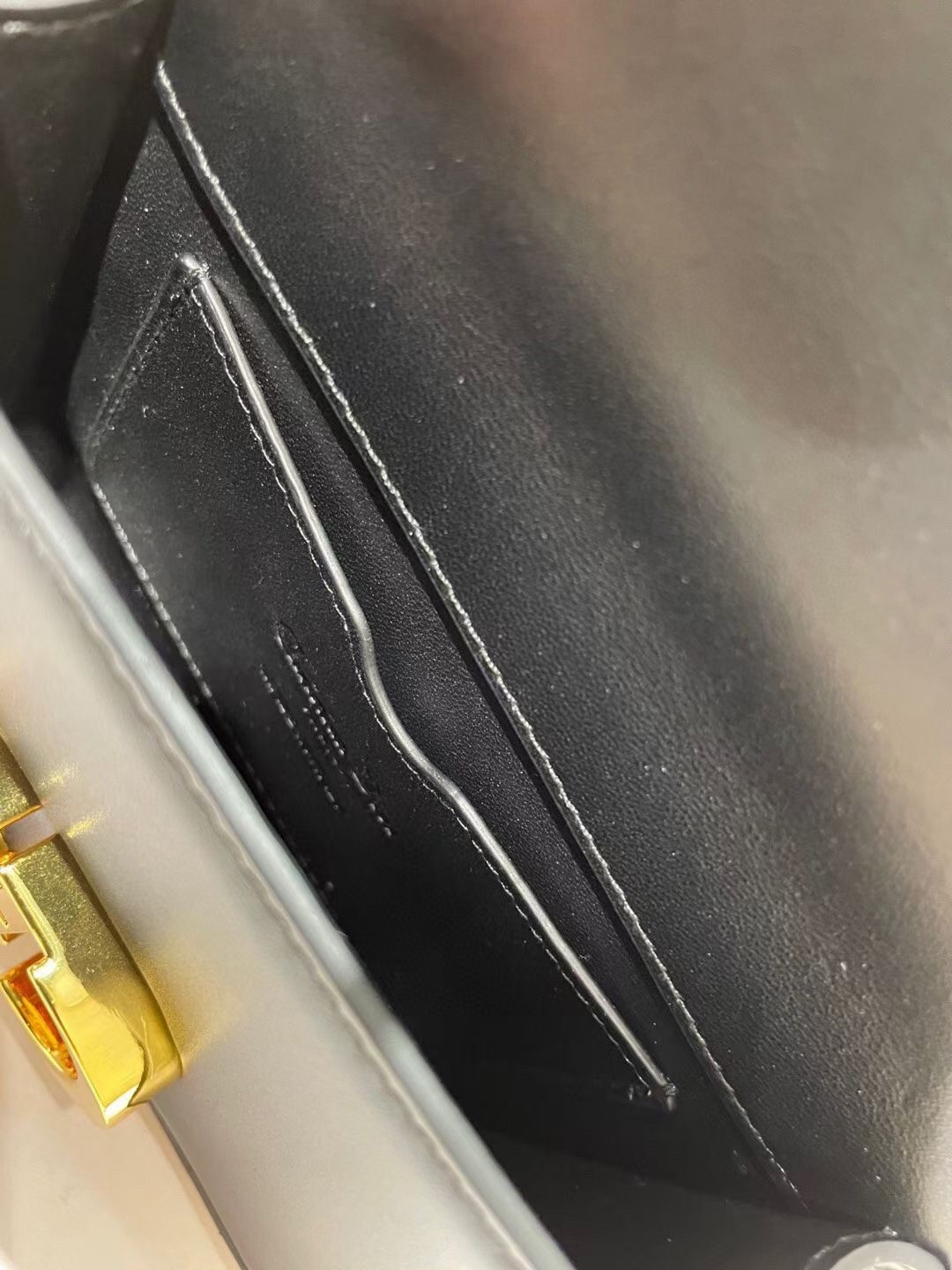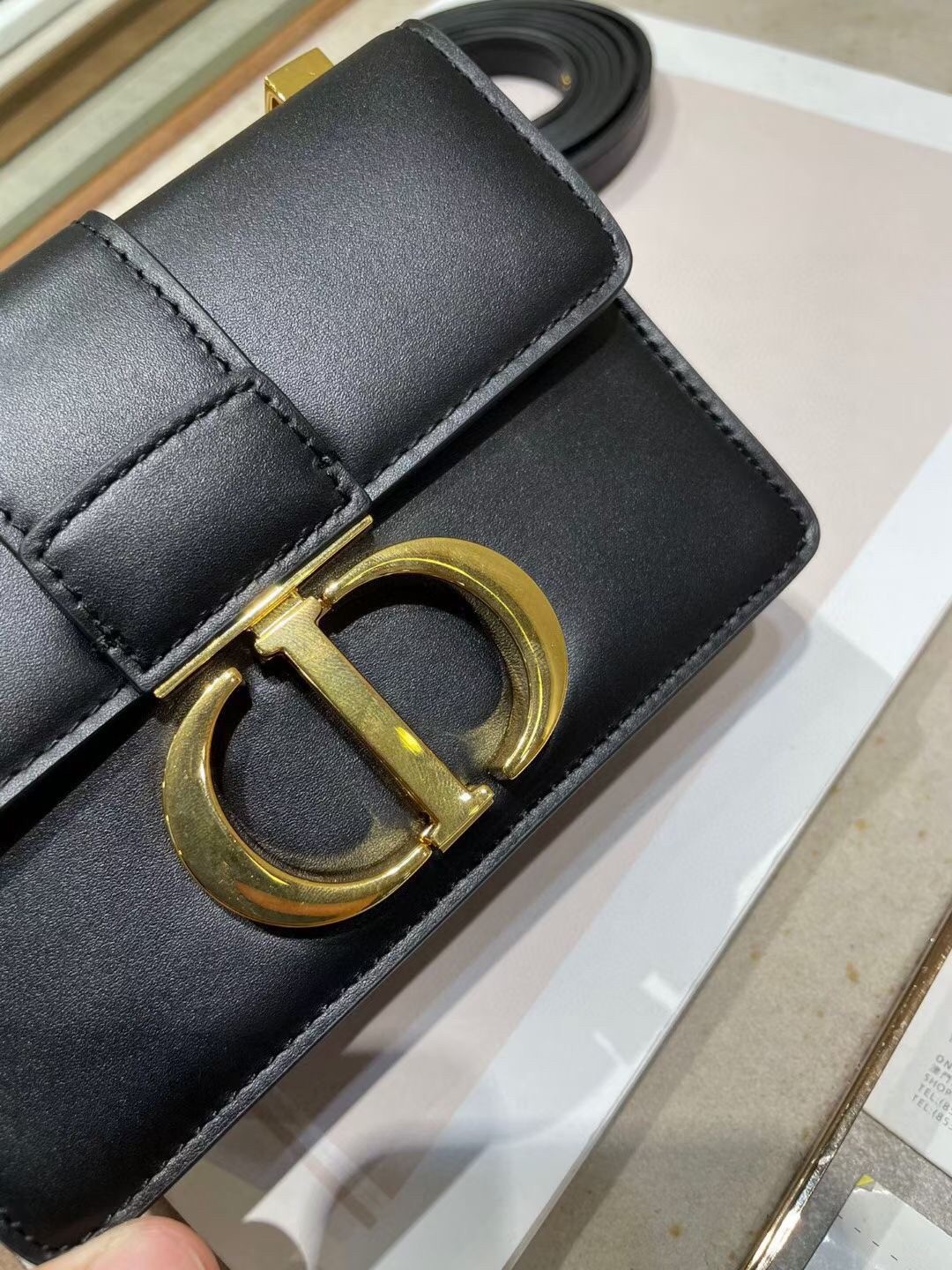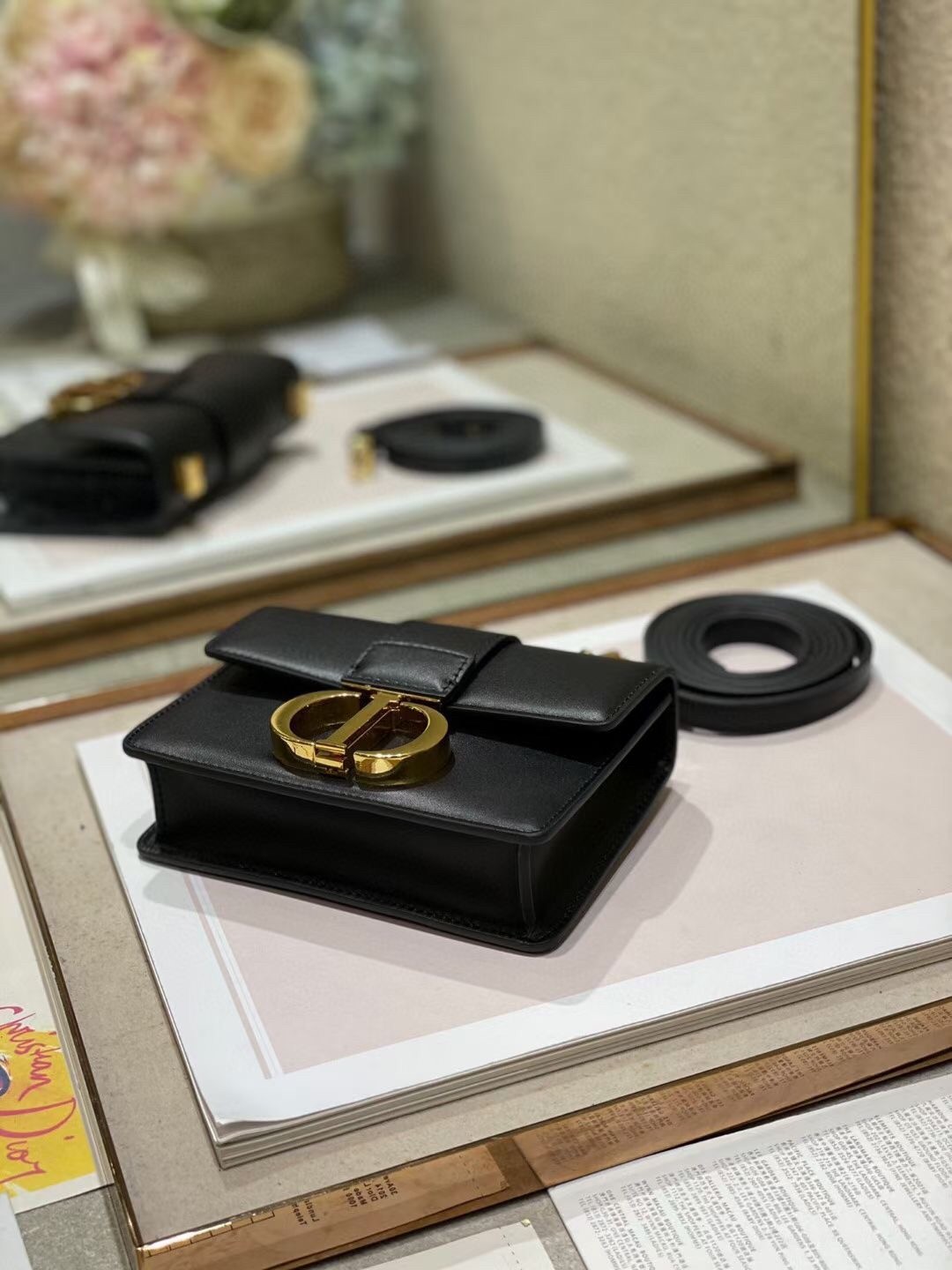 The 30 Montaigne line, inspired by the hallmark address, offers essential pieces that embody the House's iconic codes. The handbag is crafted in box calfskin and embellished with a flap with an antique gold-finish metal 'CD' clasp, inspired by the seal of a Christian Dior perfume bottle. The miniature style has an adjustable leather shoulder strap and can be worn over the shoulder or crossbody.
