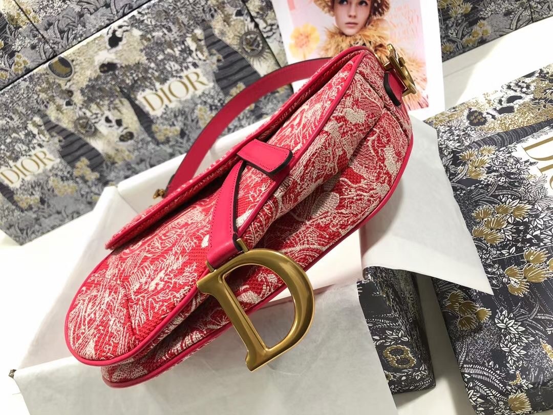 Dior Saddle Bag In Red Toile de Jouy Reverse Jacquard