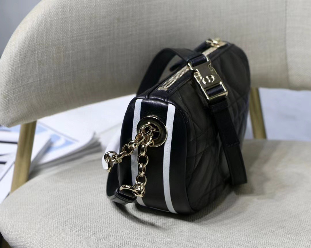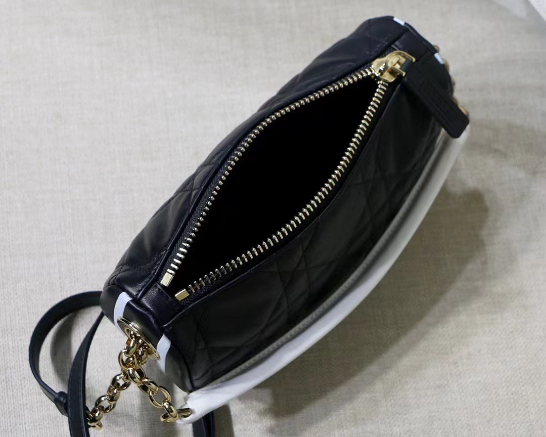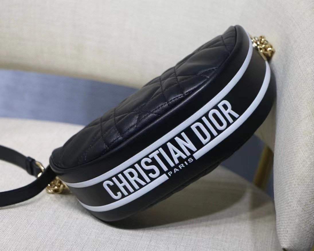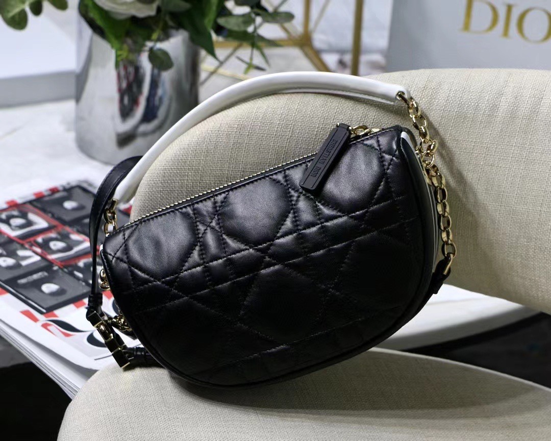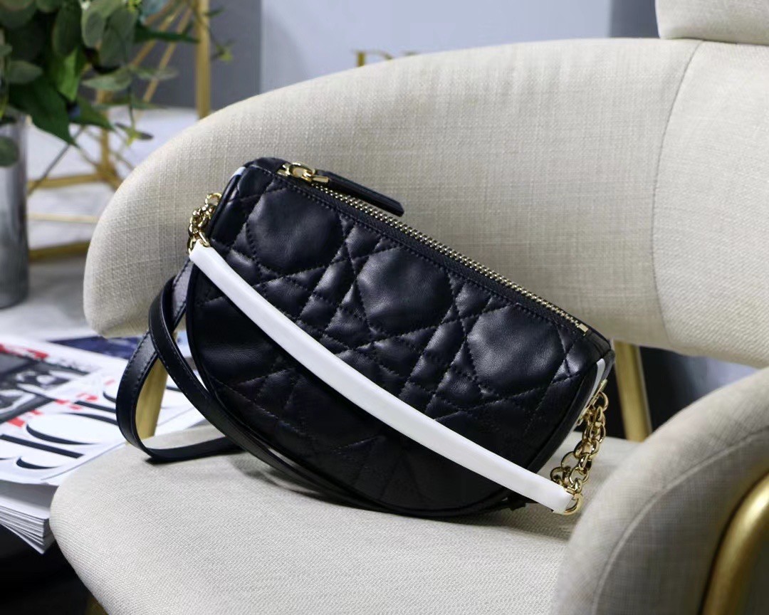 New this season, Maria Grazia Chiuri imagines the Dior Vibe bag with the allure of a Hobo bag showcasing modern lines. The black Cannage lambskin style features a suede interior while a white 'CHRISTIAN DIOR PARIS' signature adorns the bottom of the bag. Featuring a handle in addition to a removable and adjustable shoulder strap with a military-inspired buckle, the small Dior Vibe bag can be carried by hand, worn on the shoulder or crossbody for a sportier look.