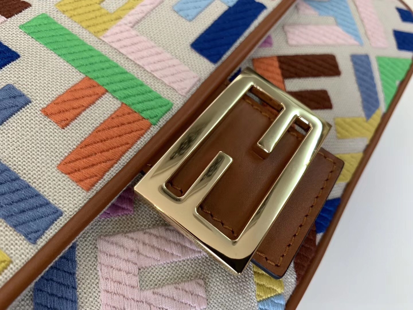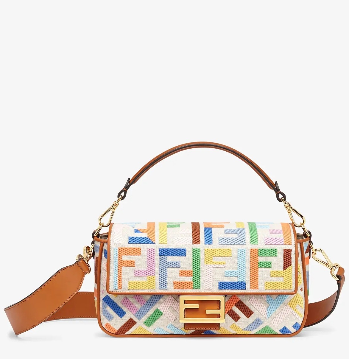 Iconic Baguette bag in medium size, with flap and FF fastening with magnetic clasp. Lining with zip pocket. Can be carried by hand or worn cross-body thanks to the handle and shoulder strap, both detachable. Made of beige canvas. Finished with FF motif embroidered in multicolour thread. Details in brown leather. Gold-finish metalware.