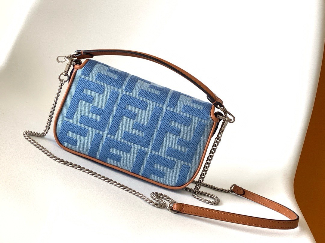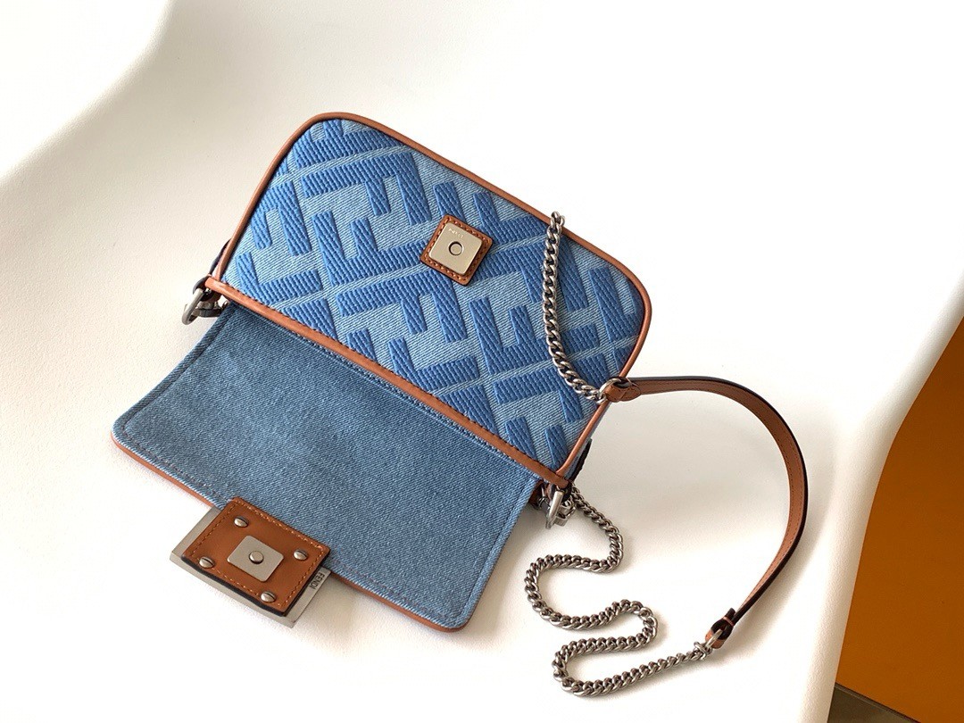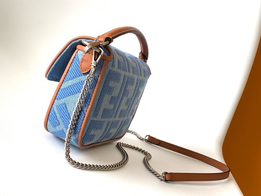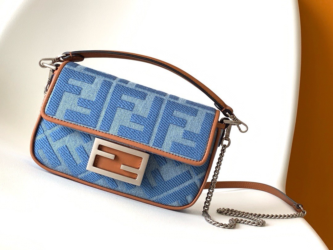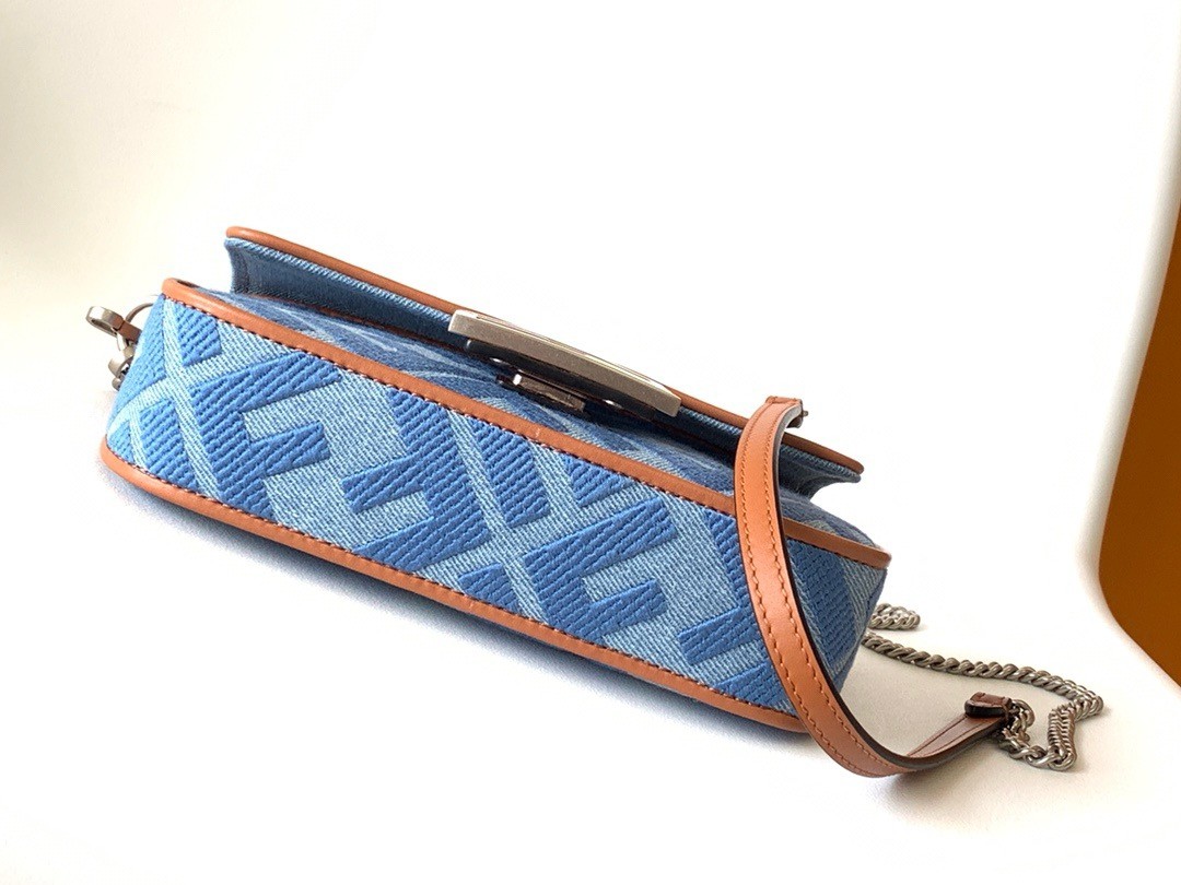 Iconic mini Baguette bag made of light blue denim with a tone on tone FF motif in a raised embroidery. Finished with a brown leather trim and embellished with an FF clasp. Featuring a front flap, magnetic clasp, internal compartment with pocket and palladium-finish metalware. The bag can be carried by hand, or worn either on the shoulder or cross-body thanks to the handle and chain shoulder strap, both detachable.