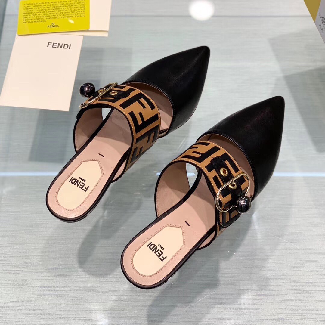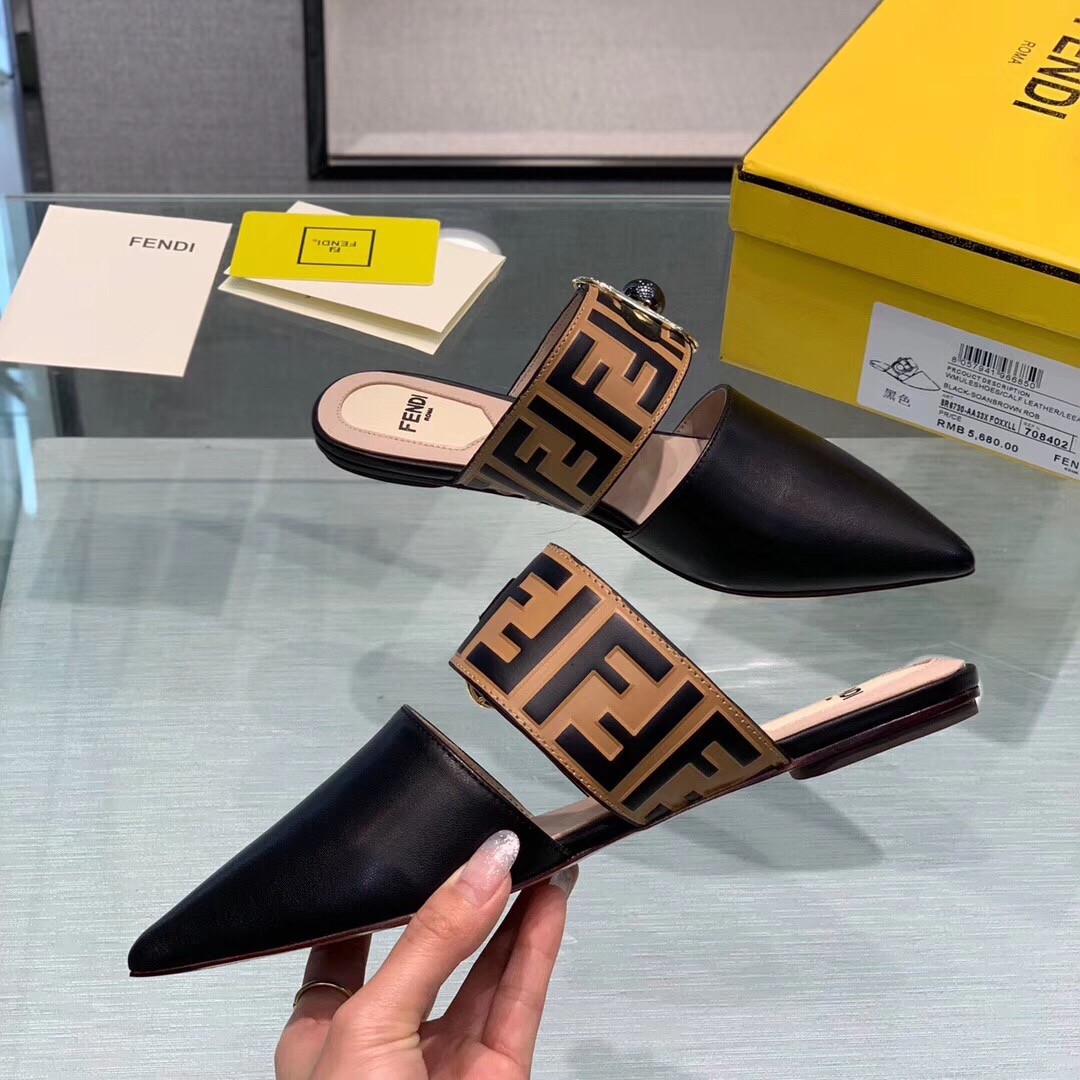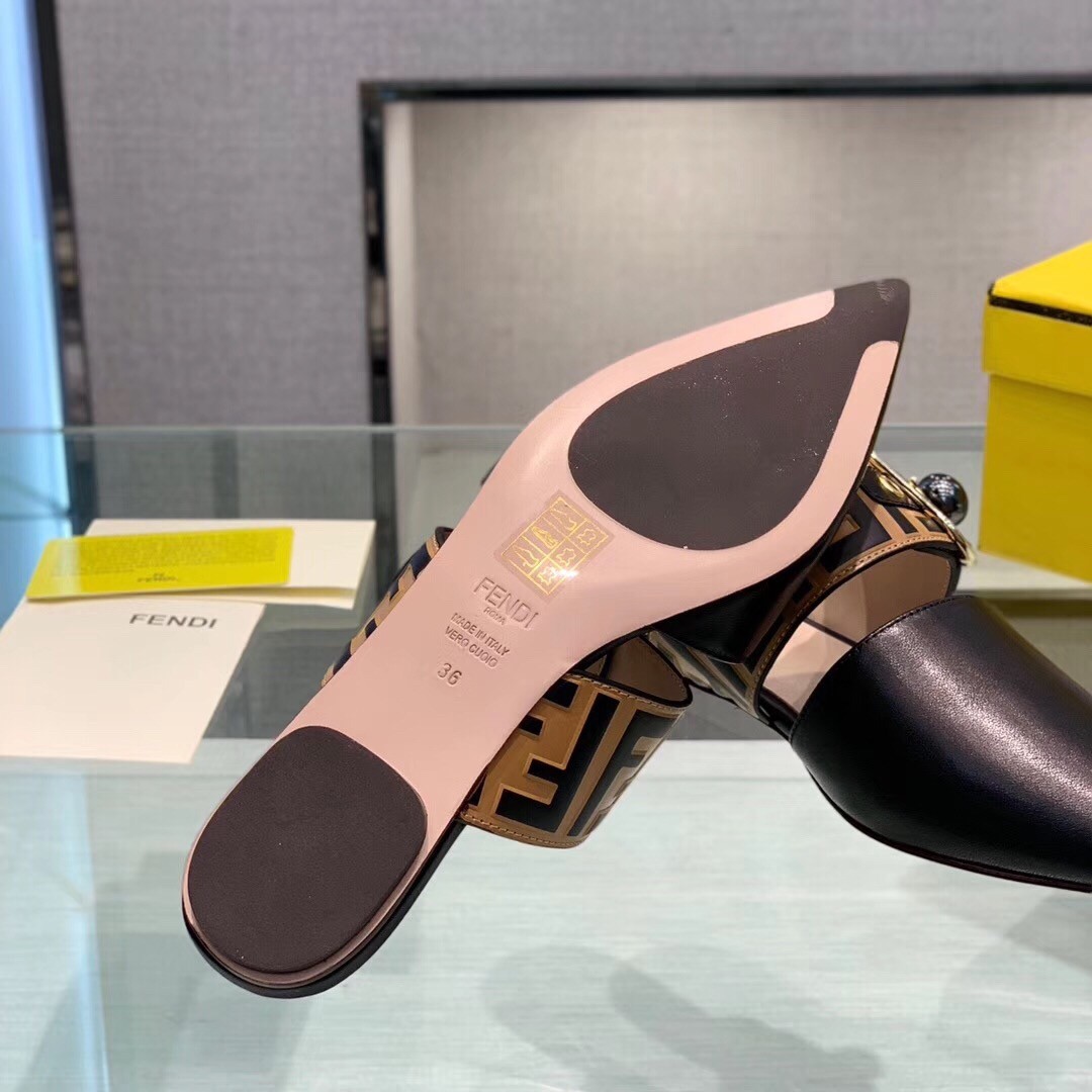 Sabots with pointed toe featuring a wide band that wraps around the ankle. Made of black leather. The band is hand painted with the iconic FF pattern in shades of brown and decorated with a maxi buckle and metal-plated pearl.