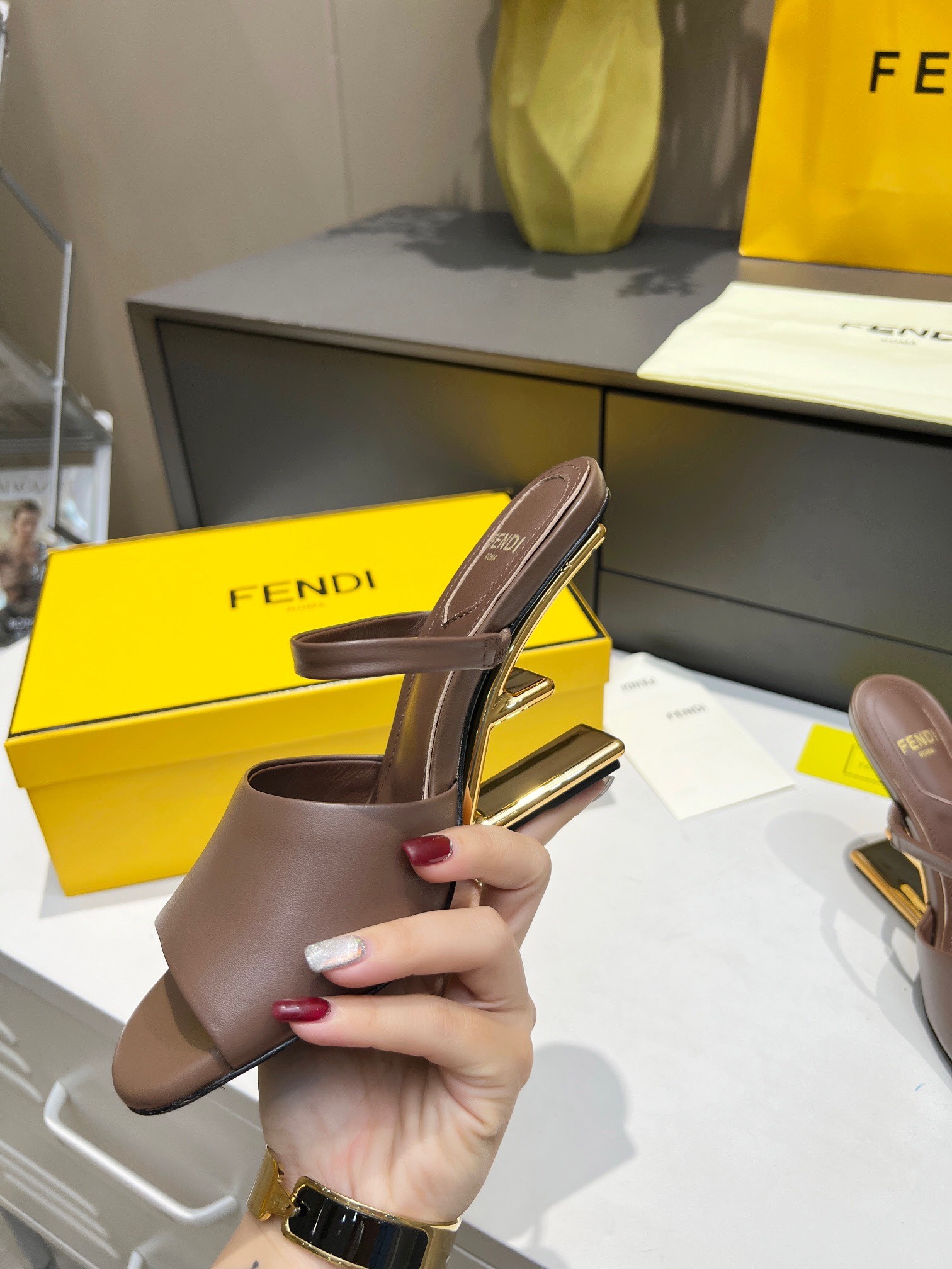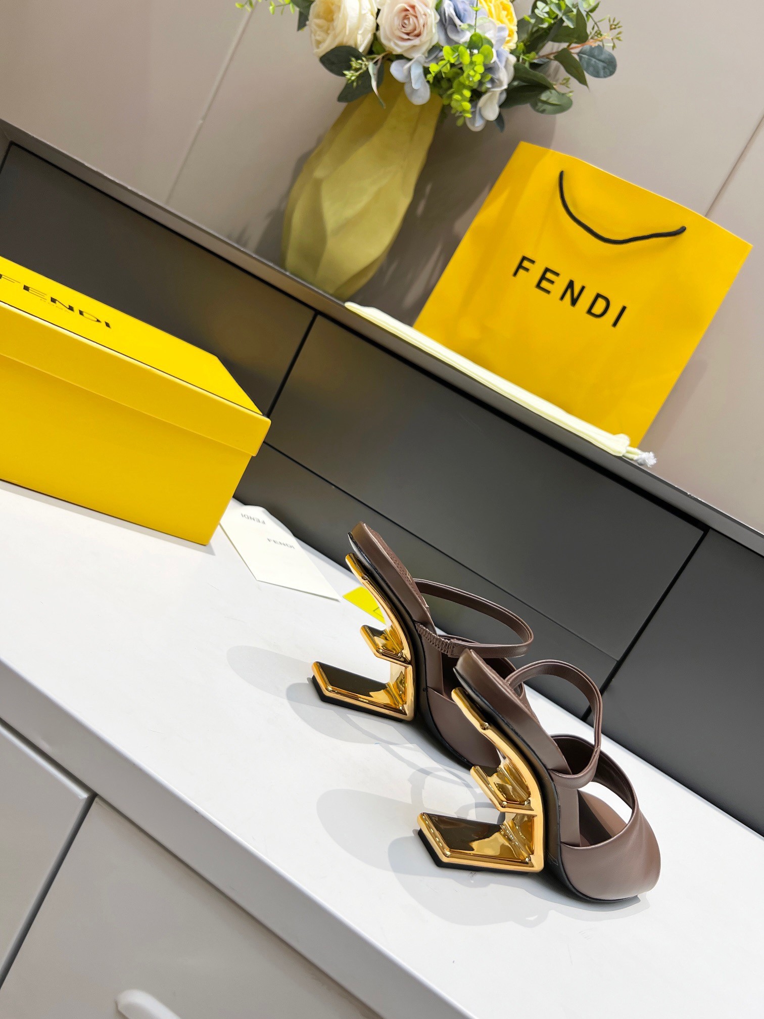 - Diagonal F-shaped sculpted heel in gold-colored metal