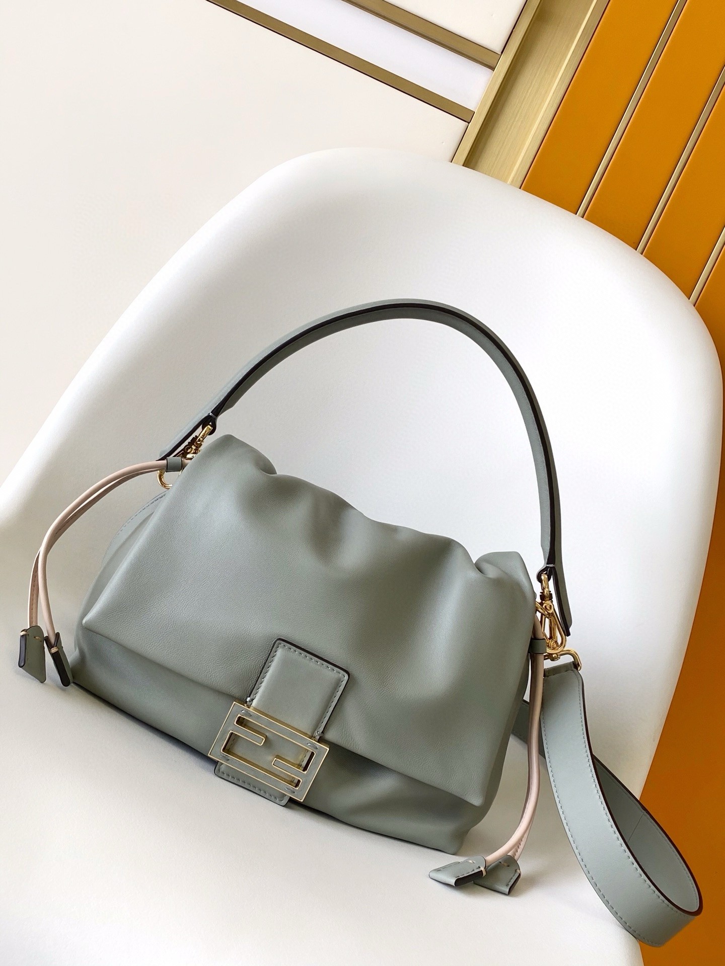 - Metal FF clasp with tone-on-tone leather insert