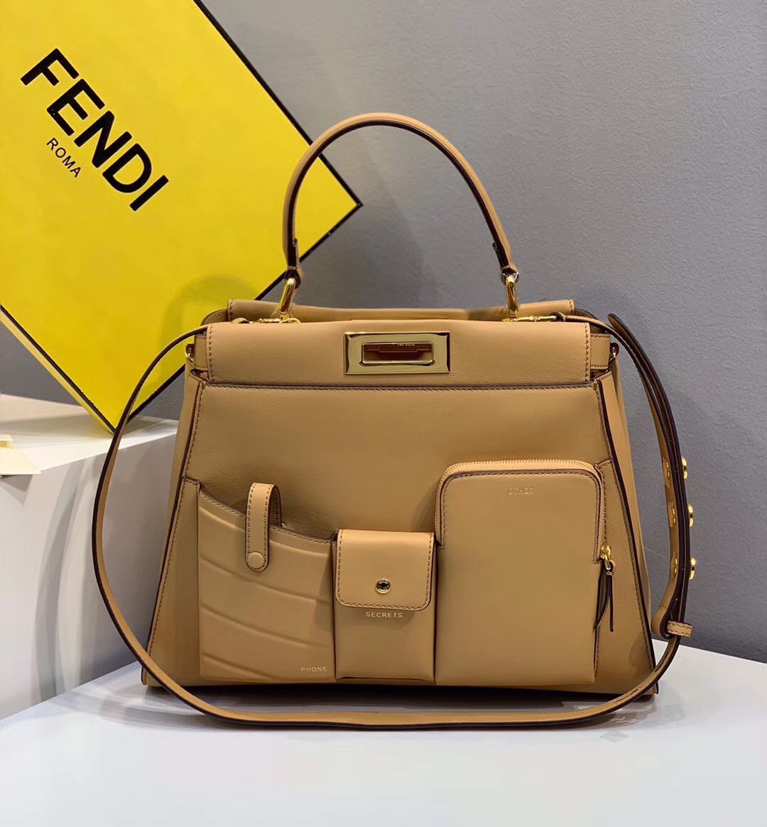 t’s true; the Fendi Peekaboo Pocket Bag is the casual chic for the normal days. The pockets that are crafted around the exterior are very useful but the minimalistic look has been sacrificed. The shape as well as the interior remained unchanged. The front of the bag is decorated with 3 exterior pockets of different sizes that can hold your phone as well. There is also a zip pocket for storing more important stuff. With this Peekaboo Pocket Bag, you can boast your street style to the next level.