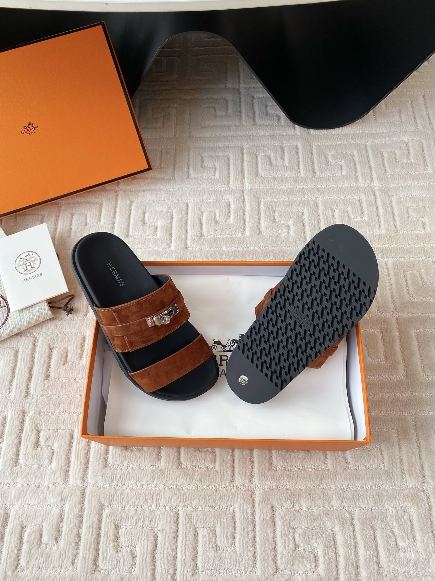 Hermes Men's Jackson Sandal in Brown Suede Leather
