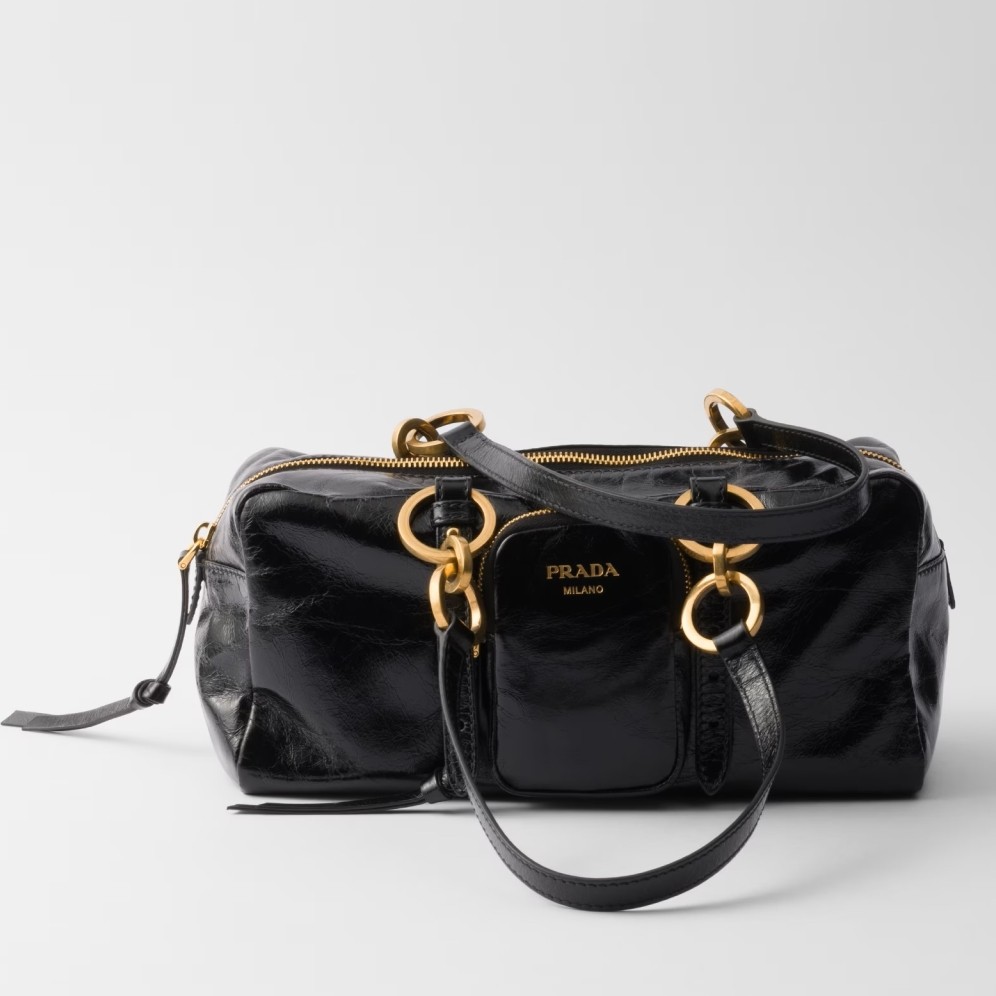 A new interpretation of the top-handle bag features a soft geometric shape and is made of shiny leather with a vintage finish. Its retro charm is emphasized by the antiqued metal hardware and the archive-inspired zipper pocket.Why not embrace the Dangle design's aged look by keeping it as an heirloom? Because Prada never goes out of style.
