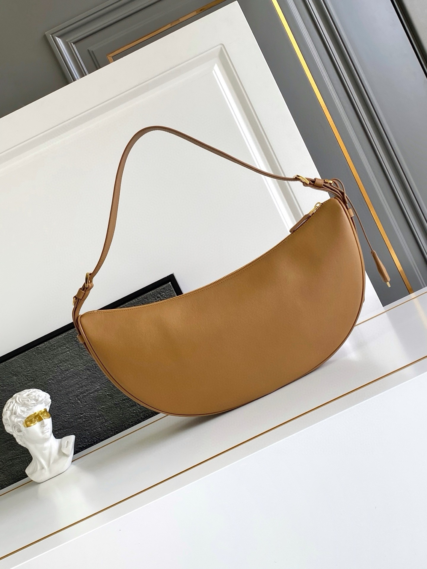 This leather bag with a soft, lightweight design offers a new interpretation of the iconic crescent silhouette. Sinuous lines and oversized volumes define the roomy and versatile accessory that can be worn as a cross-body or shoulder bag thanks to the adjustable handle. The enameled metal triangle logo adds its signature touch to the refined, contemporary bag.