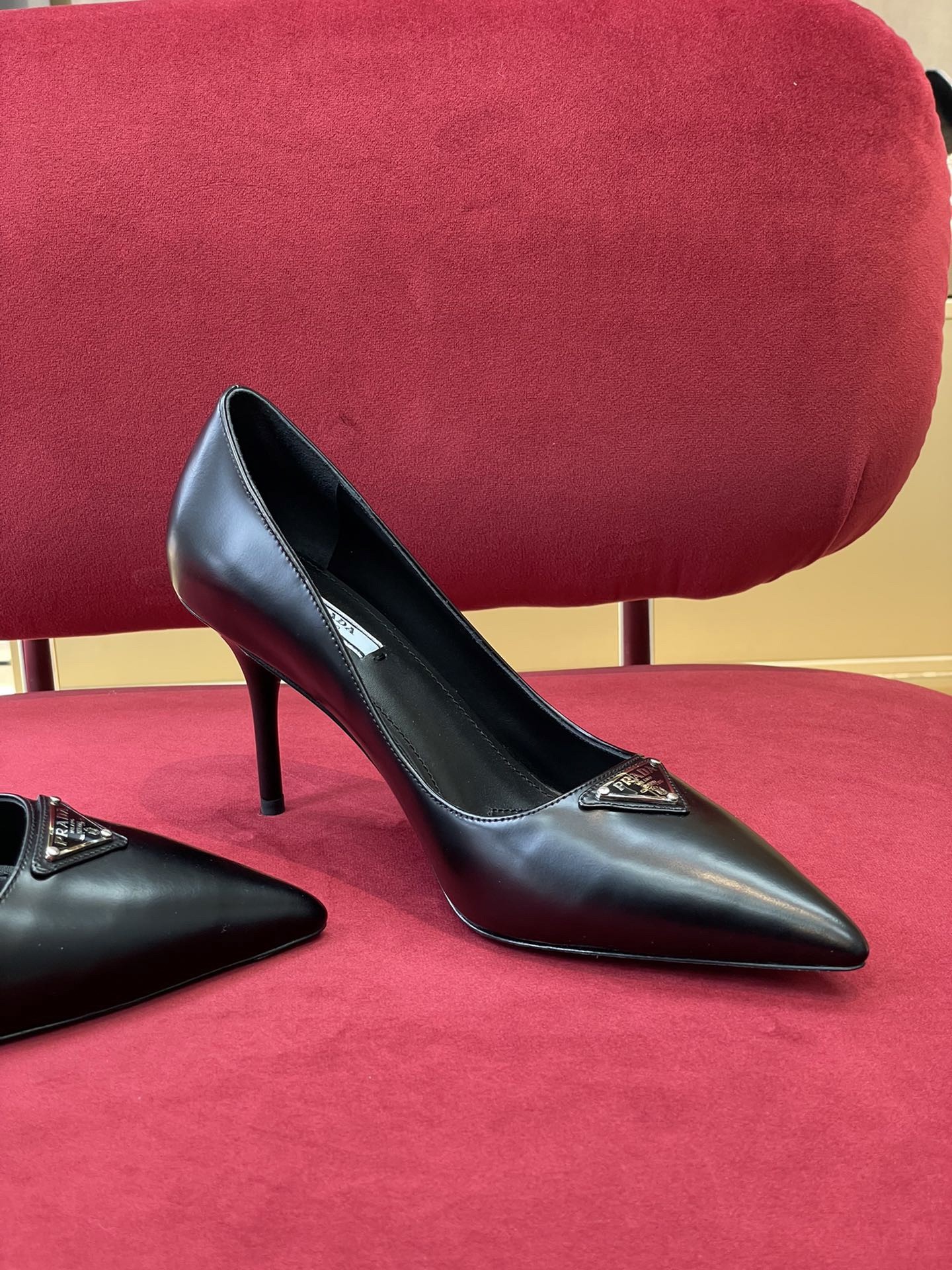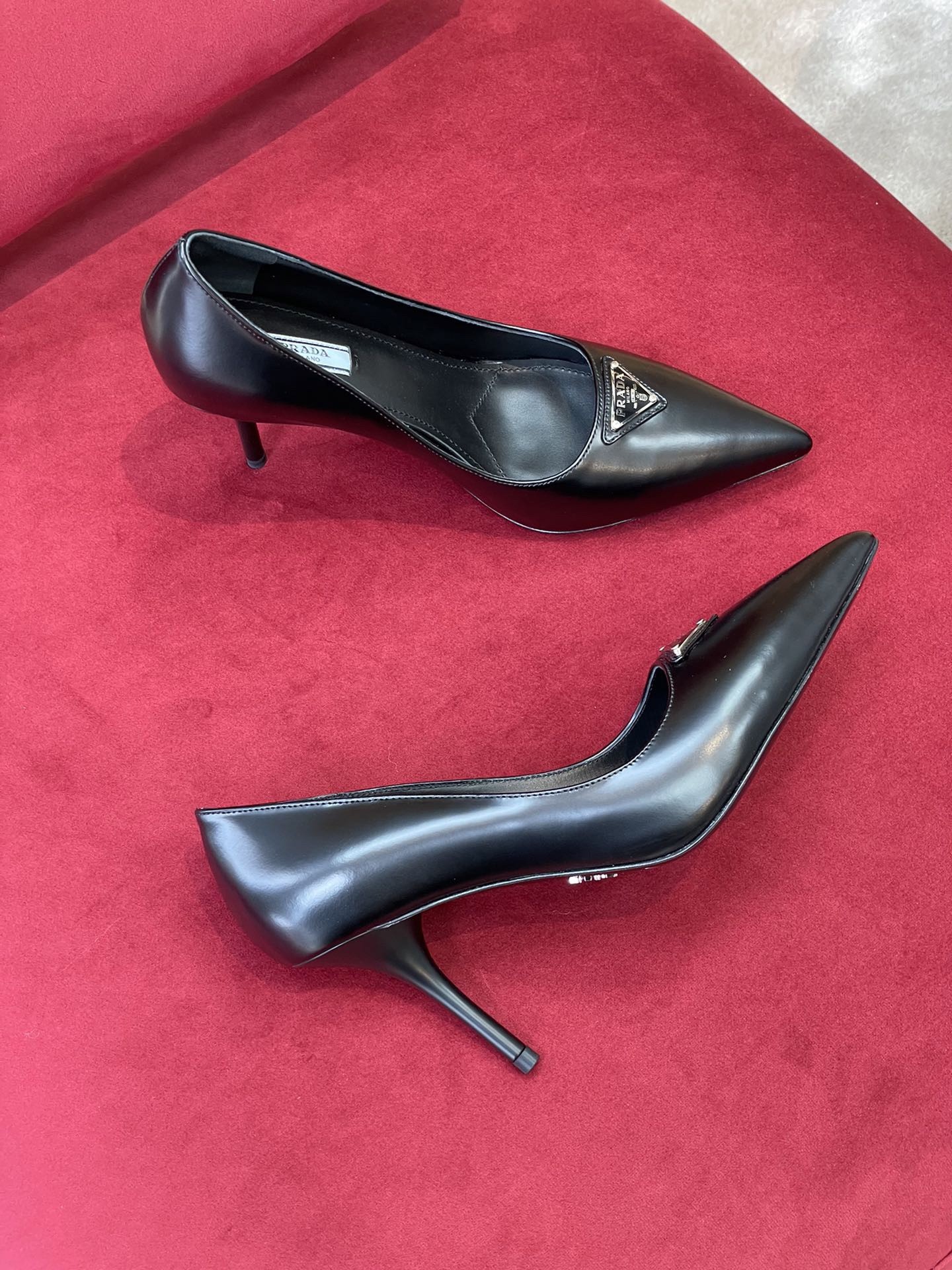 Prada's iconic triangle logo decorates these pumps with sleek allure. Traditionally used for fine classic footwear, since the 90s brushed leather has been reinterpreted in Prada collections on contemporary designs for a hybrid result that reflects the brand's duality.