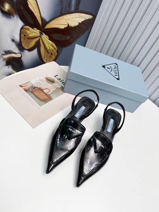 Modernist-inspired geometric shapes reimagine a classic style of Prada collections: the slingback, which is enhanced with original elements like the typical stitched apron on loafers, a pointy toe, and heel that reinterprets the classic lines of the triangle. Full of '90s references, the shoe is made of brushed leather, an iconic material of the brand.