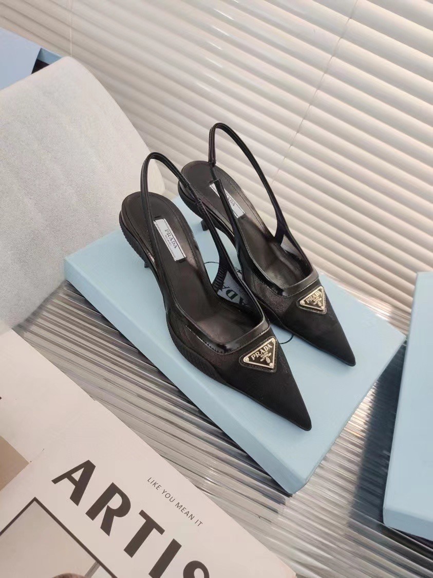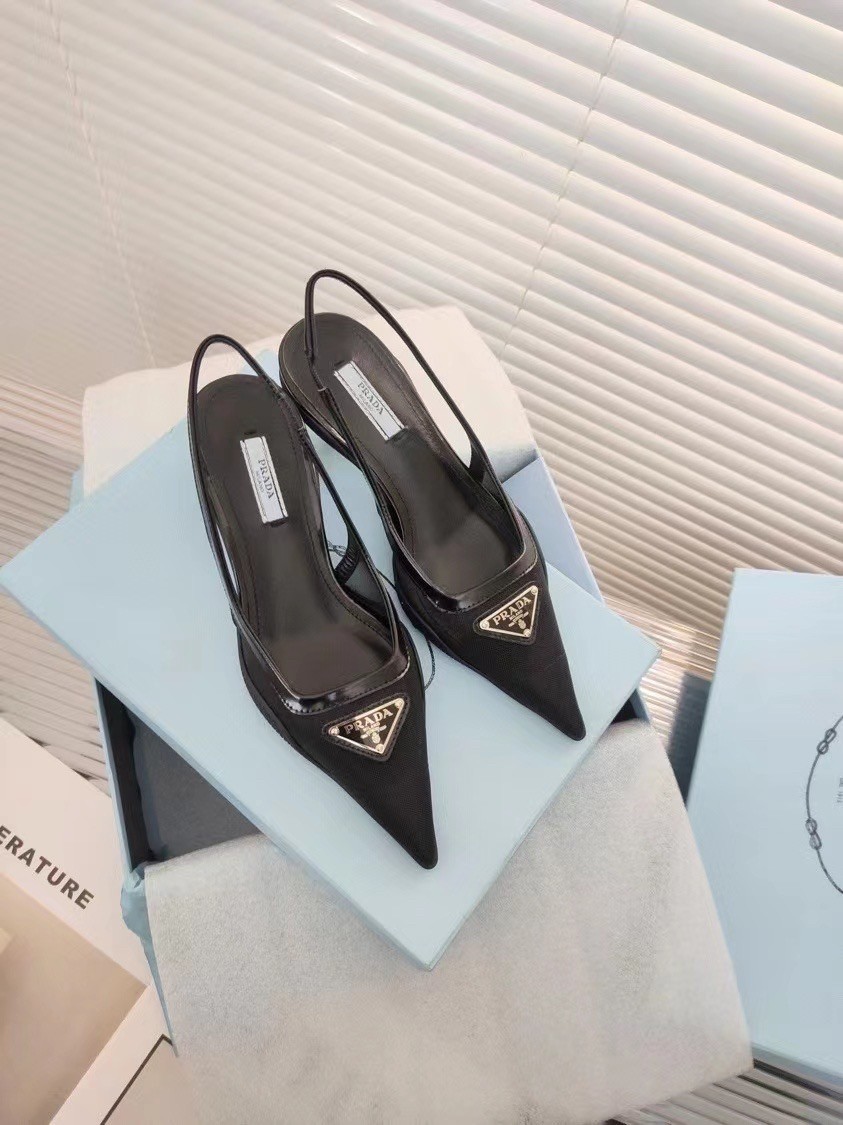 Revisiting a design from Prada archives Prada of the nineties, the rubber sole hugs the mesh upper of these slingback pumps, creating a delicate contrast of materials that blends the feminine silhouette and sporty references. The comma heel, inspired by styles from the same decade, is a distinctive touch of recent collections. The iconic enameled metal triangle logo decorates the shoe.