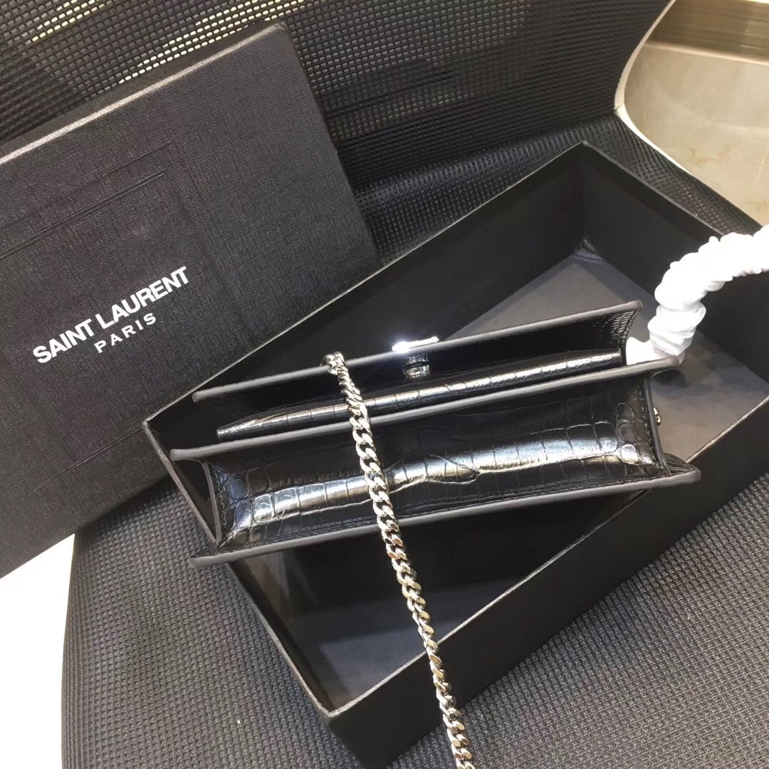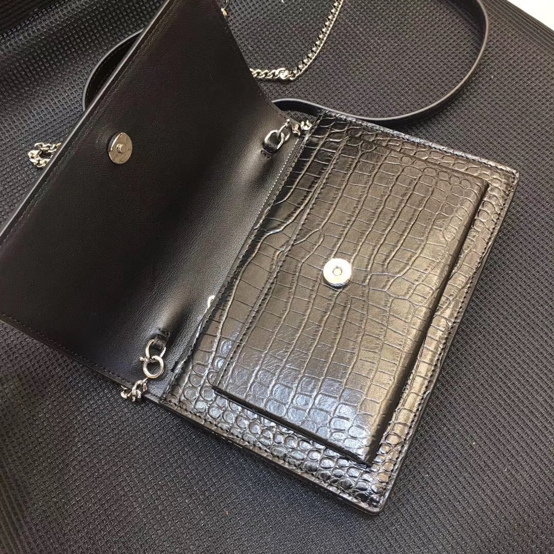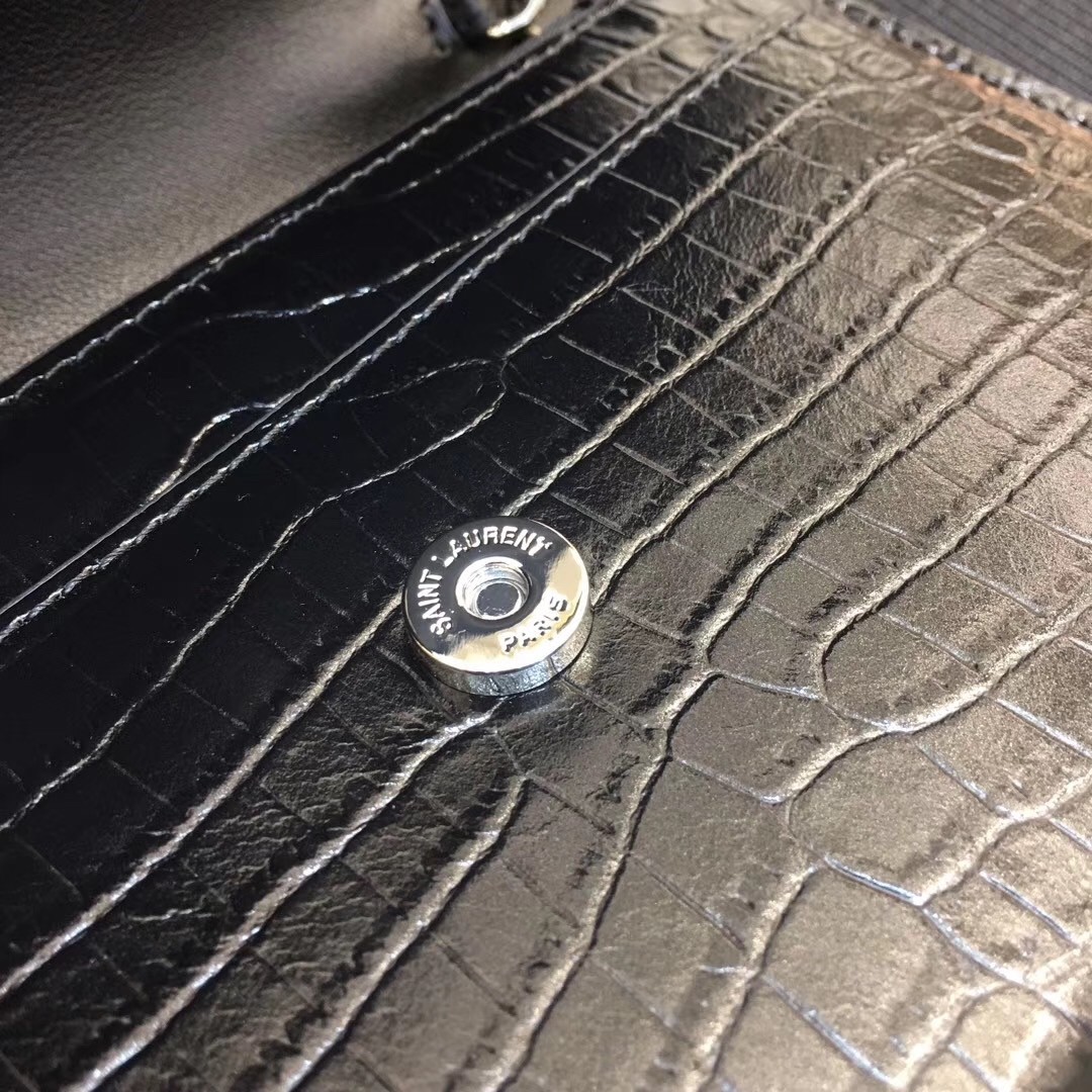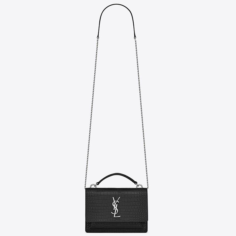 A slick sidekick for days spent in the city, Saint Laurent's Sunset chain wallet offers a compact silhouette in croc-embossed leather. Styled with a monogram-embellished flap front concealing a gusseted pocket, the well-organised interior keeps cards, phones and other essentials safely housed. Complemented with polished gold-tone hardware, a chain shoulder strap slings it chicly across the body.