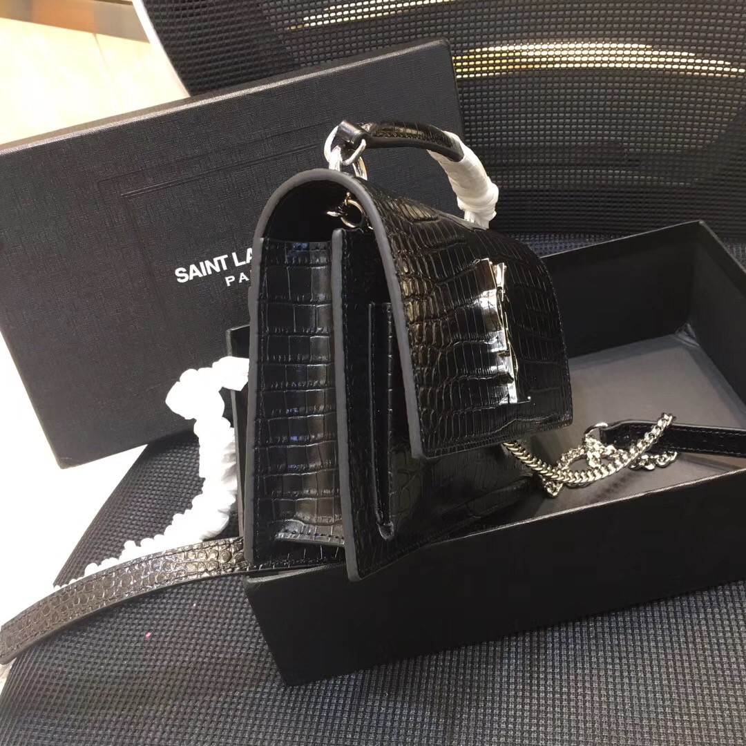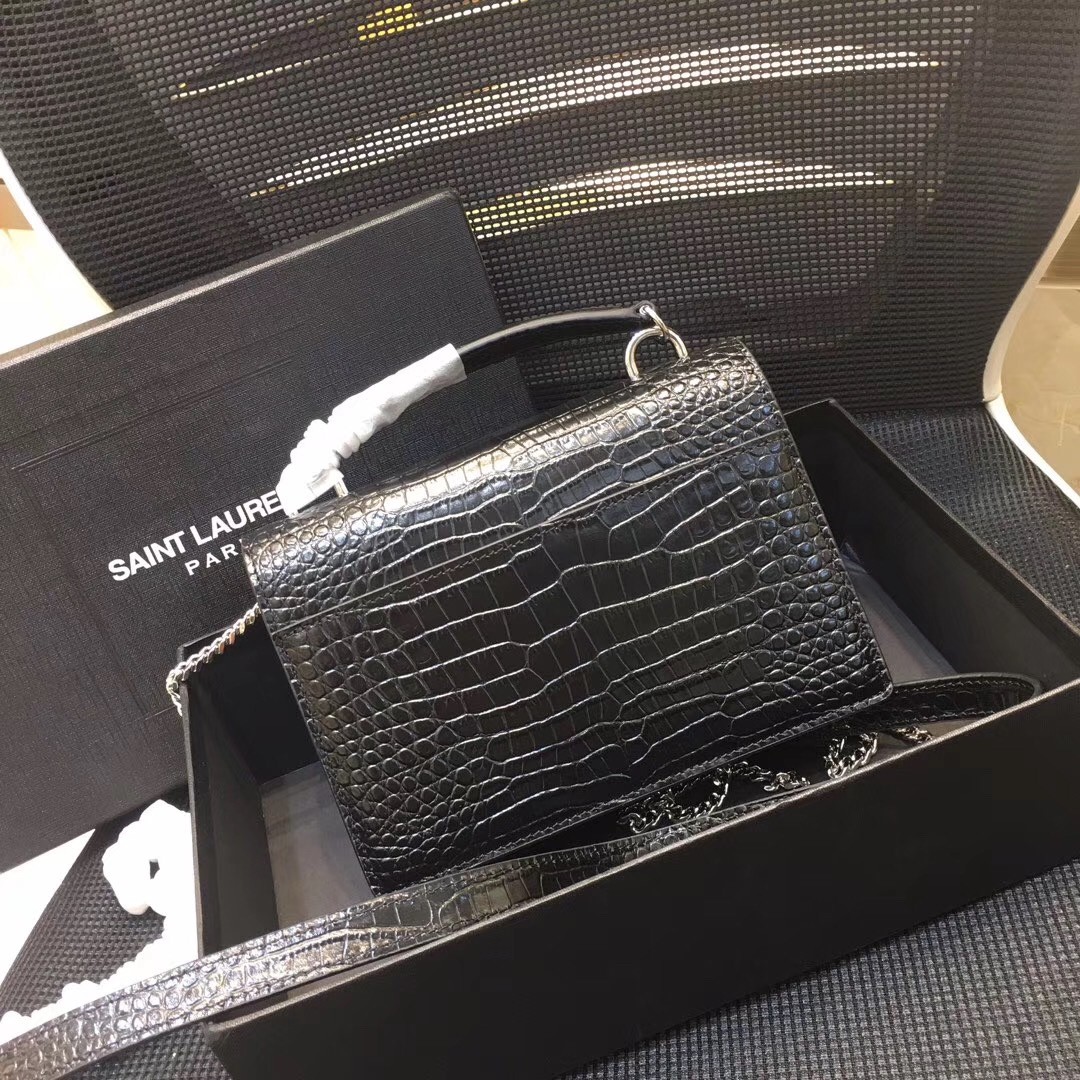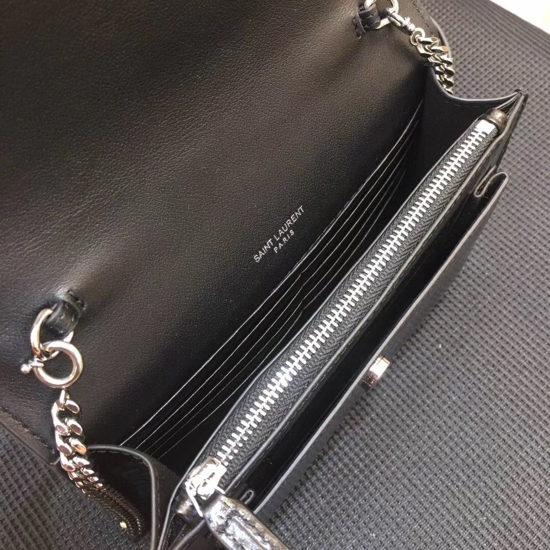A slick sidekick for days spent in the city, Saint Laurent's Sunset chain wallet offers a compact silhouette in croc-embossed leather. Styled with a monogram-embellished flap front concealing a gusseted pocket, the well-organised interior keeps cards, phones and other essentials safely housed. Complemented with polished gold-tone hardware, a chain shoulder strap slings it chicly across the body.