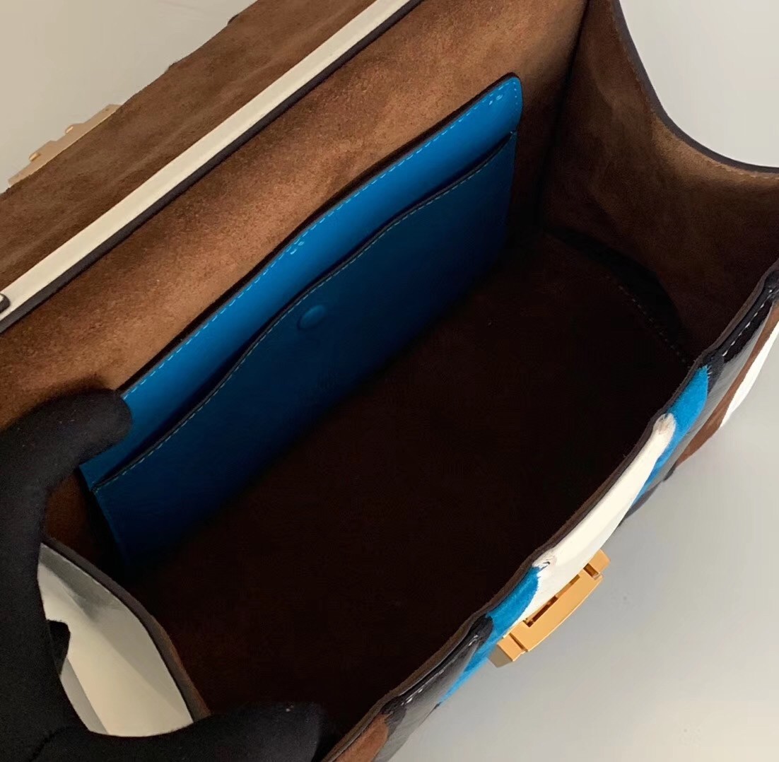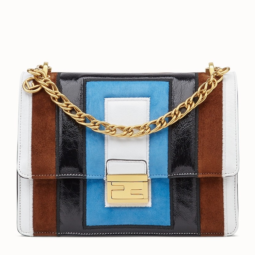 Fendi’s AW19 collection put the focus on retro archival prints and there’s a definitive Art-Deco theme to its designs, like the updated Kan U shoulder bag. Covered with color-blocked stripes, it’s made from leather and suede with the iconic FF gold-toned logo sitting at the centre. The spacious compartment holds two slip pockets that are just big enough for your cards.