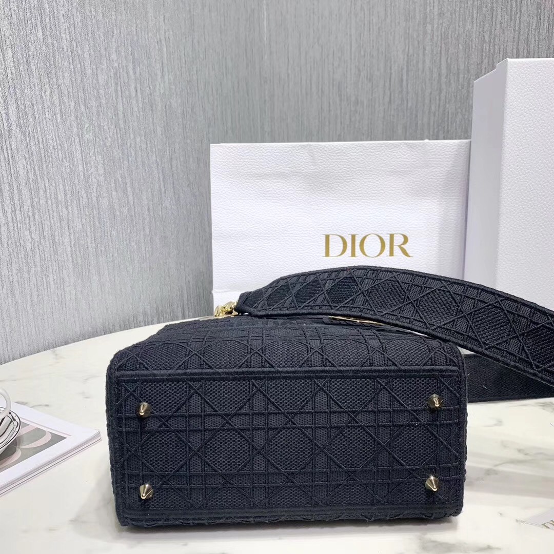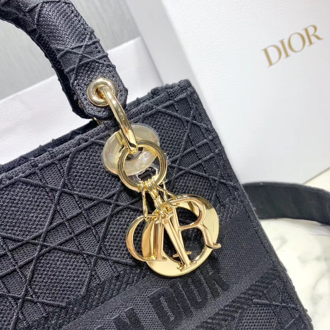 The Lady D-Lite handbag epitomizes Dior's vision of elegance and beauty. A sleek, feminine bag, it's timeless yet modern. Crafted in fully embroidered Cannage canvas with a 'Christian Dior' signature on the front, its supreme finishing instantly stands out. The pale gold-tone signature 'D. I. O. R.' charms embellish its silhouette. This medium style has a large fully embroidered, removable shoulder strap.