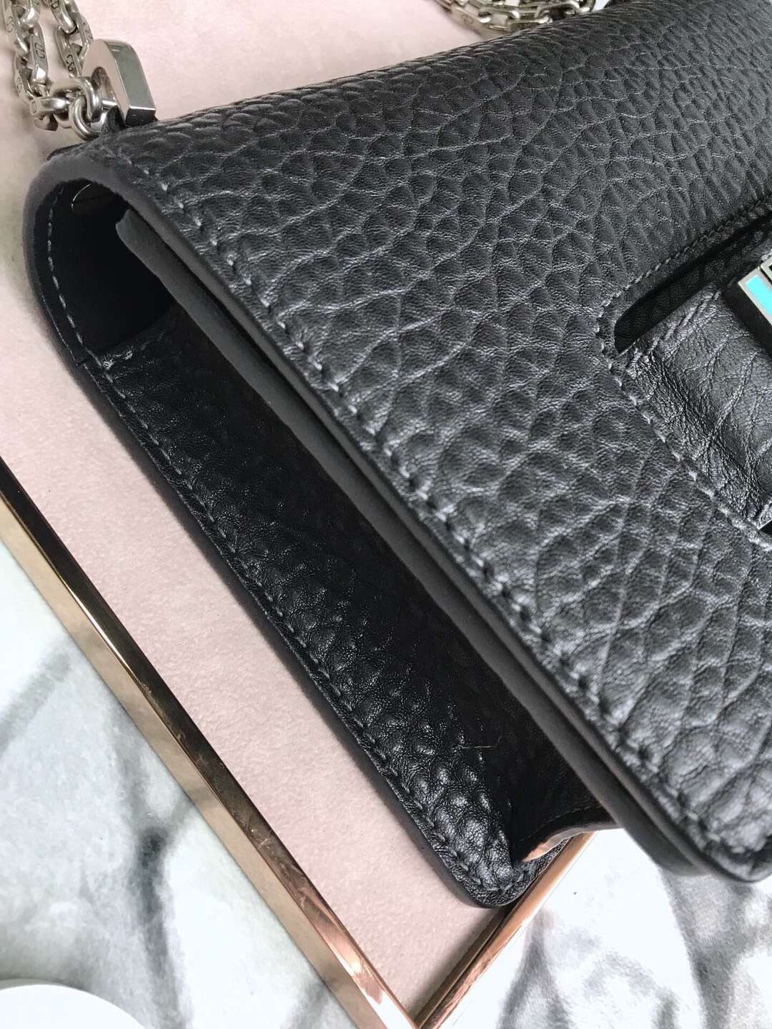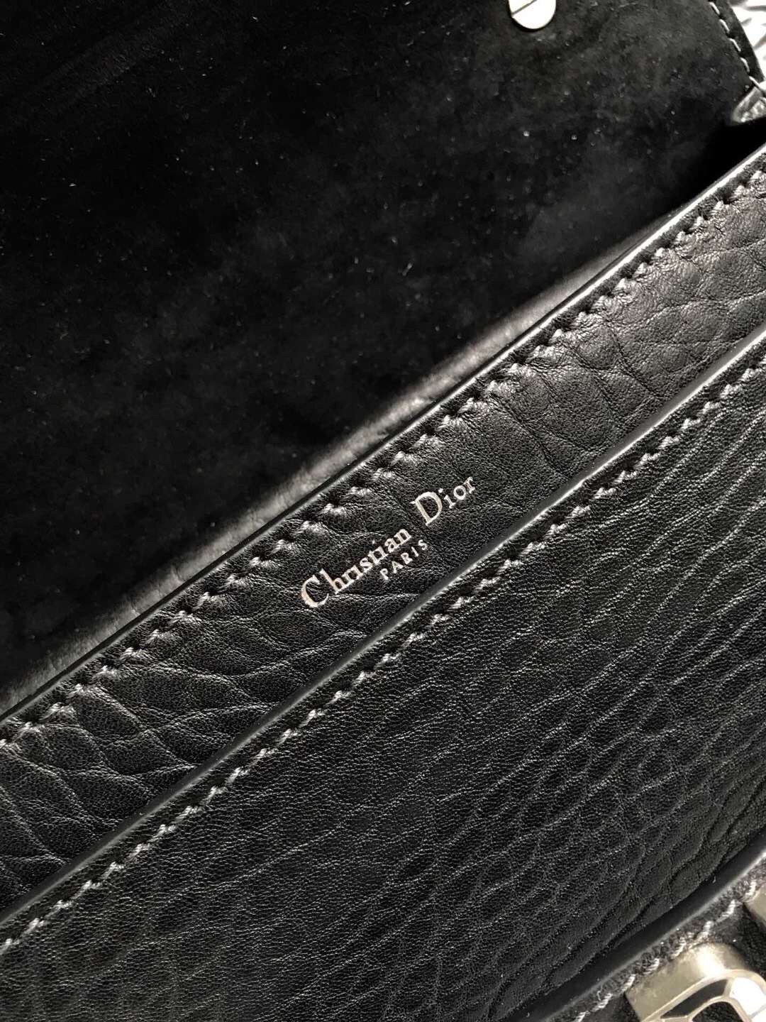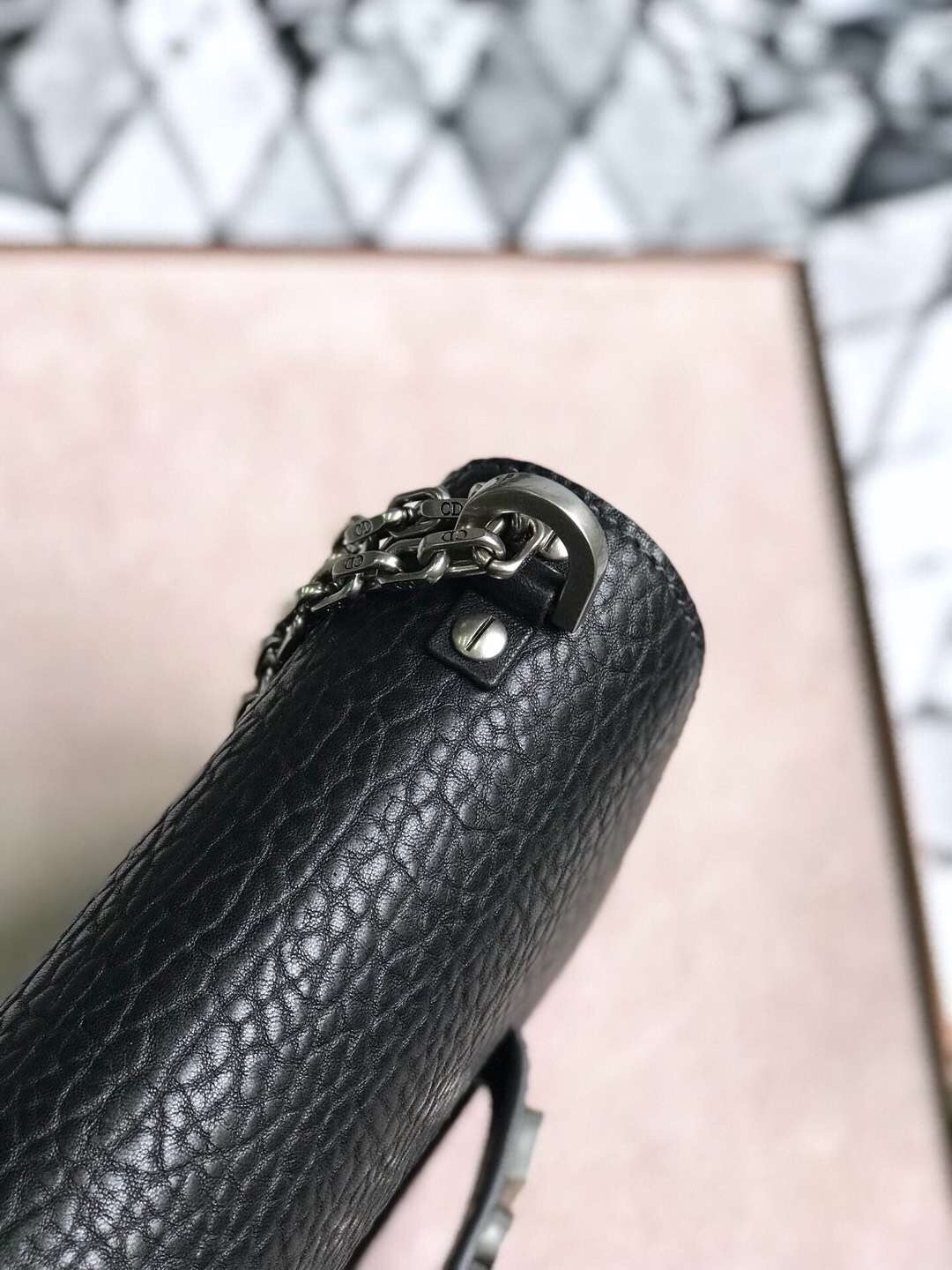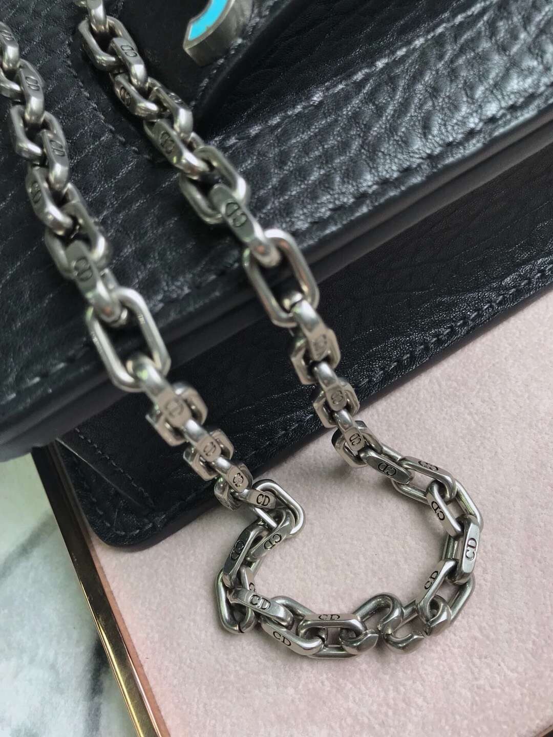 The J’Adior line is inspired by the vision of a woman with a strong personality. The J’Adior flapbag is made from black, Canyon grained lambskin, which offers a pronounced and irregular texture reminiscent of the desert landscapes of the American West, an inspiration for the Cruise 2018 collection. The J’Adior signature is decorated with a mosaic of turquoise resin stones, white howlite, and onyx. Carry it by the handle or play with its sliding and removable chain.