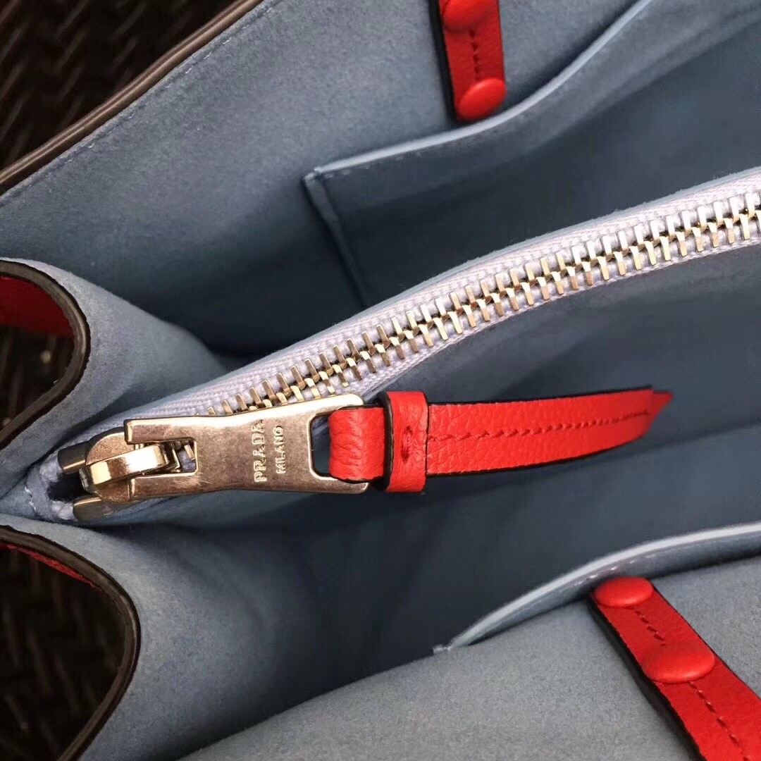 This Prada Etiquette tote is defined by one-tone calf leather with the Prada Etiquette logo in a contrasting color. The long handles allow it to be worn as a shoulder bag and the zippered inside has two pockets.