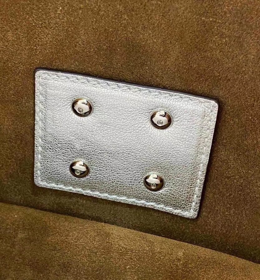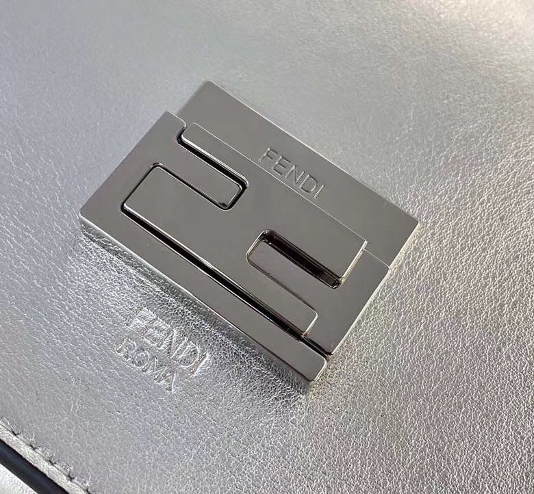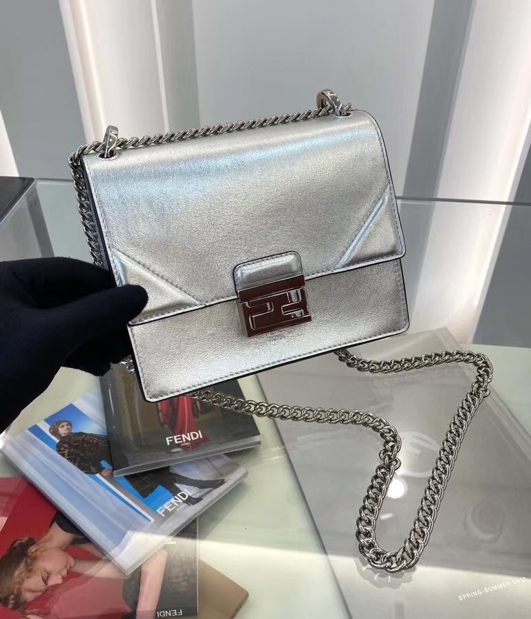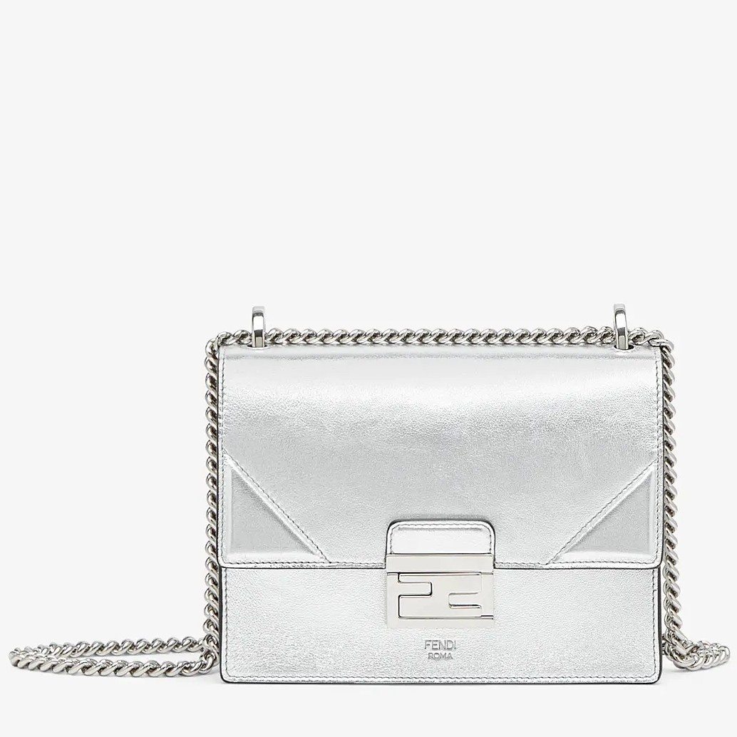 Silver isn't always second best, in this case we think it gets the top spot. Presented in shiny silver-tone leather, this small Prints On Kan U crossbody bag from Fendi is compact yet mighty. Keep perfectly organised with the internal pocket. Featuring a chain shoulder strap, a foldover top with clasp closure, a main internal compartment, an internal patch pocket and silver-tone hardware.