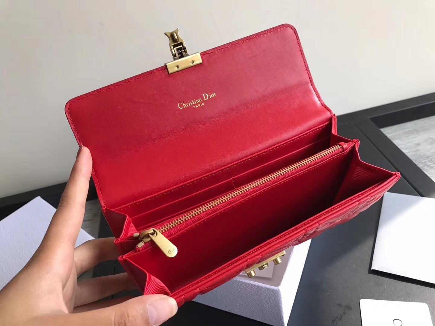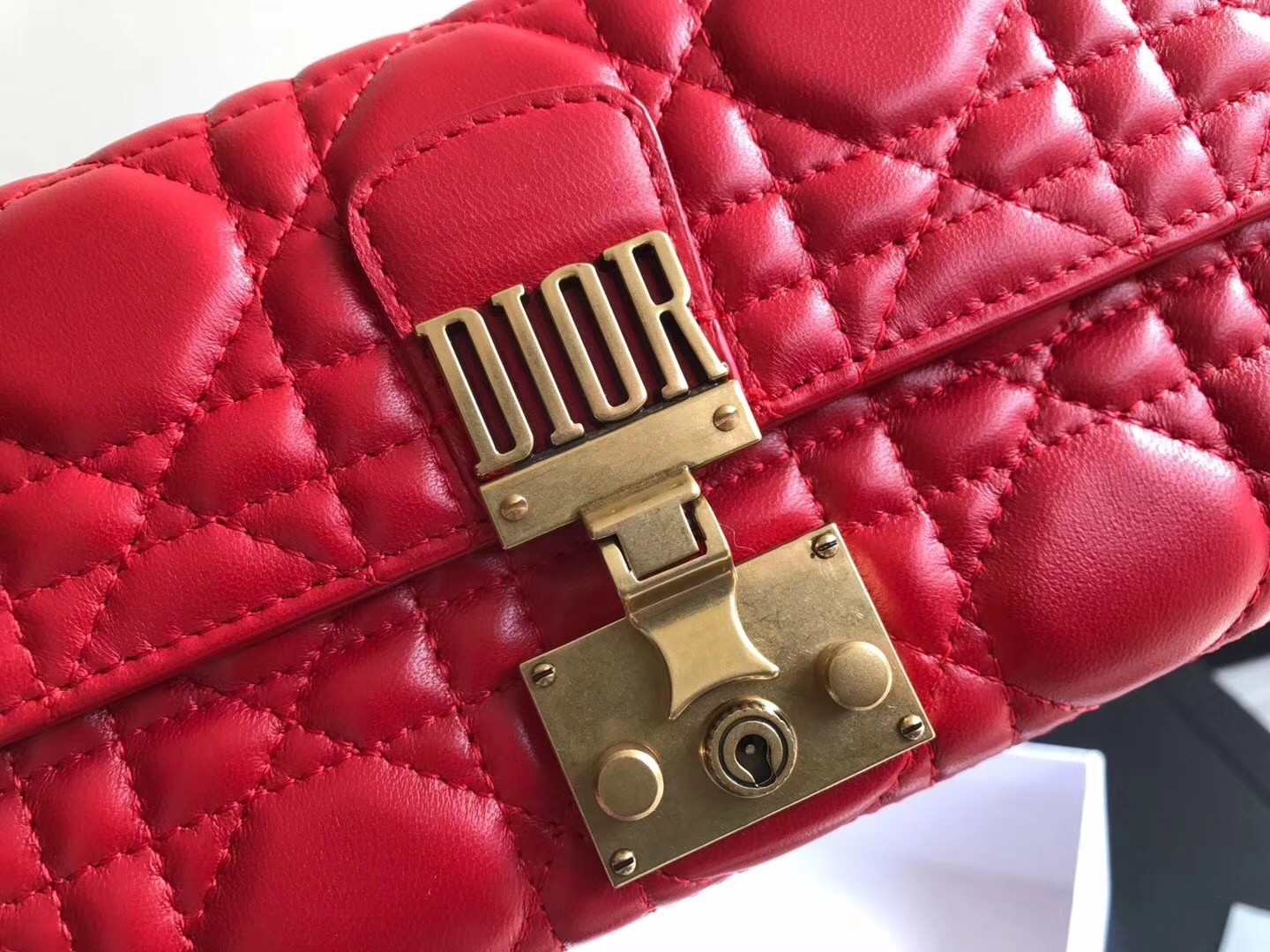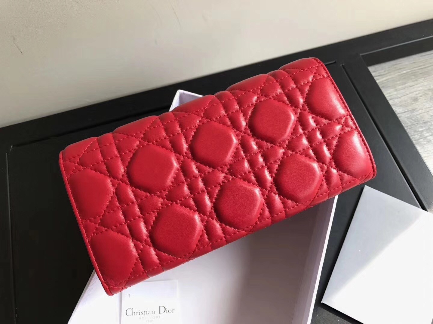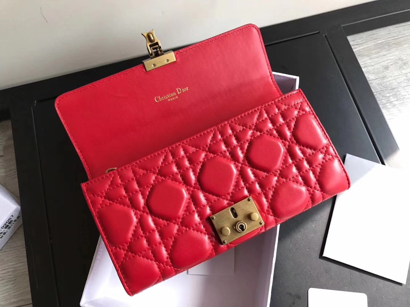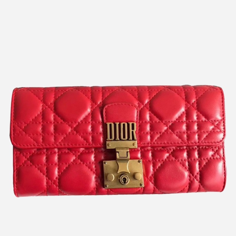 Made from genuine lambskin leather in Dior’s iconic Cannage topstitching, this DiorAddict Continental wallet features elegance and sophistication embodying the life lived by bohemians. Its Cannage leather is perfectly complemented and contrasted by its gold-tone hardware and is further highlighted by its new ‘DIOR’ clasp in aged gold-tone metal.