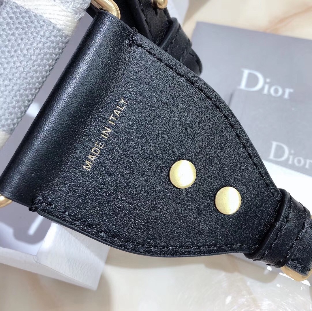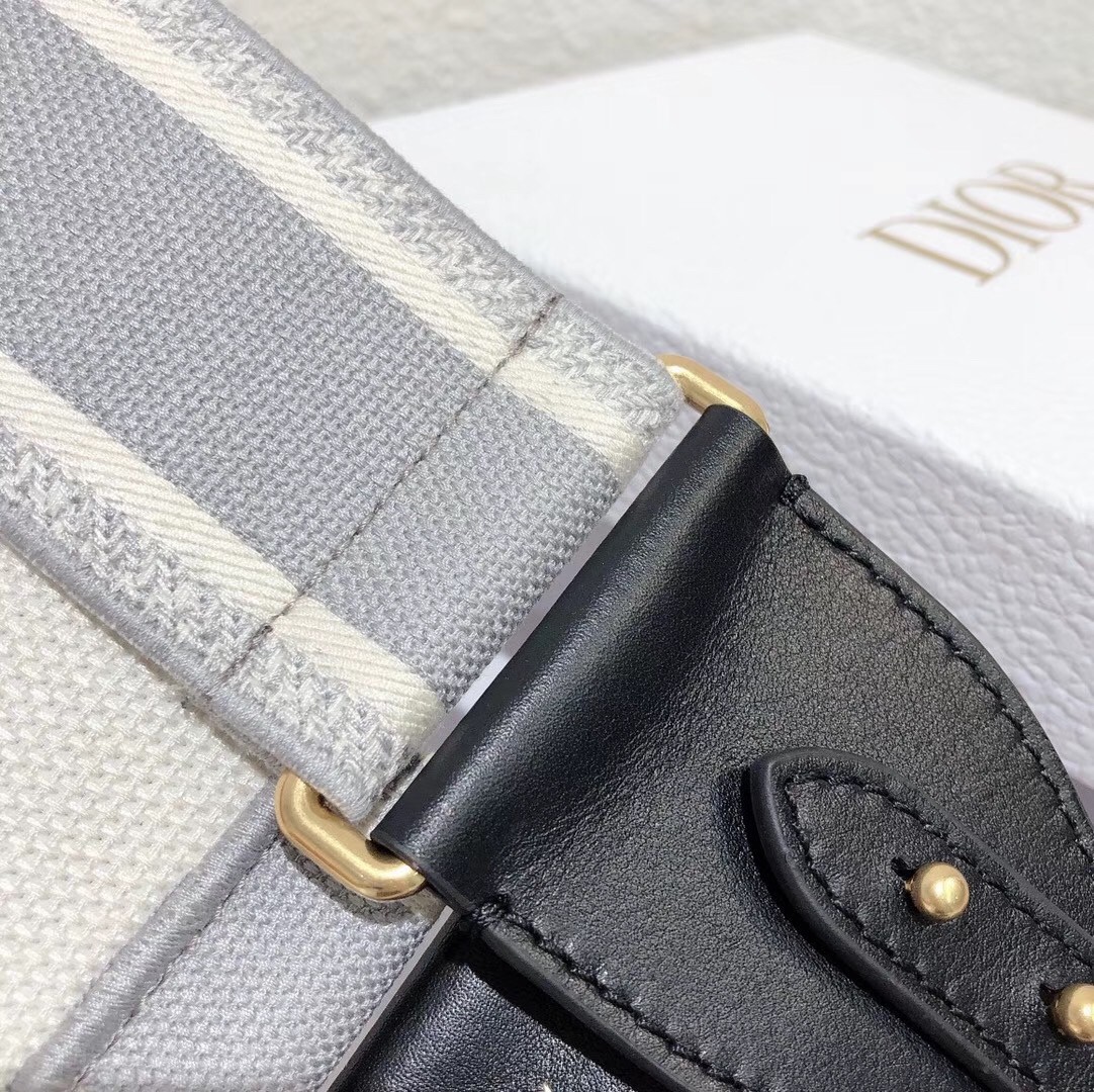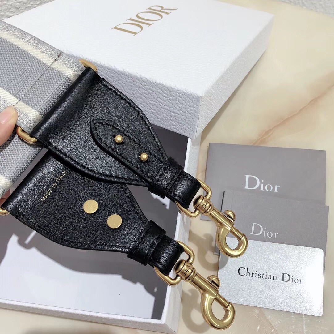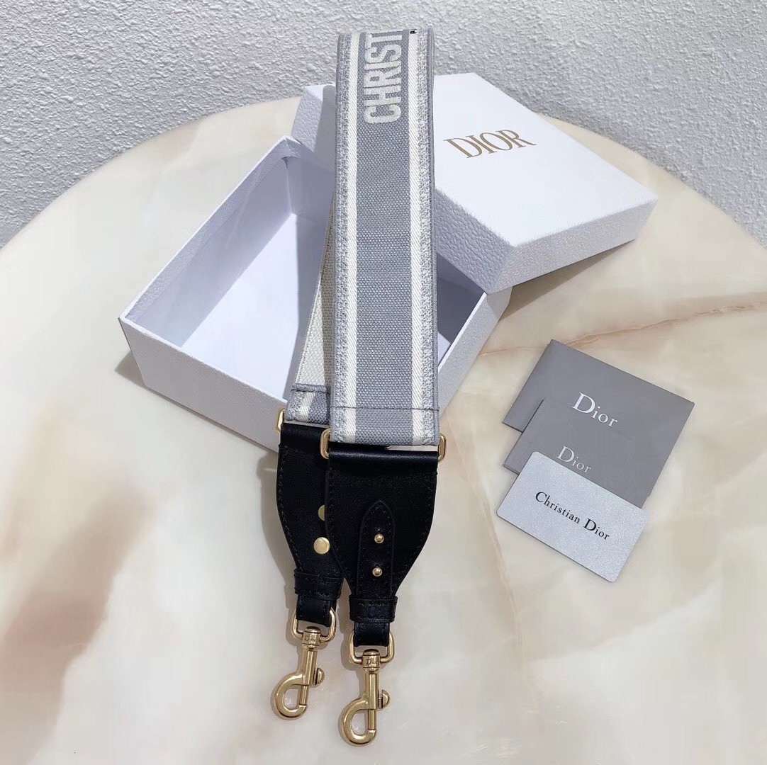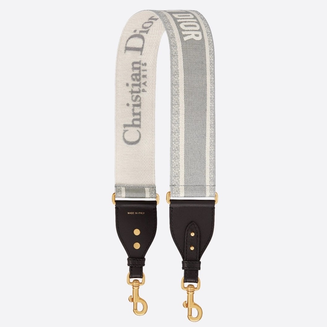 The gray embroidered strap is characterized by a bold 'Christian Dior' signature. Crafted using a fully embroidered technique, the strap is a way to customize and create a personal touch on the bag of your choice. The strap is finished with antique gold hooks to attach to the bag. Try wearing it crossbody with the Saddle bag to spotlight the strap.