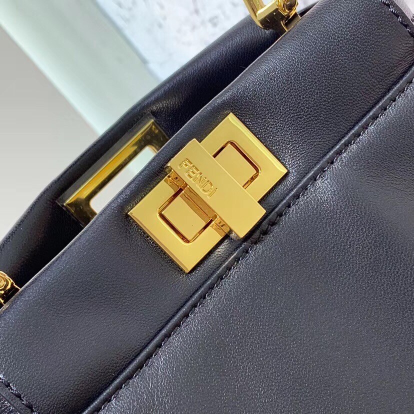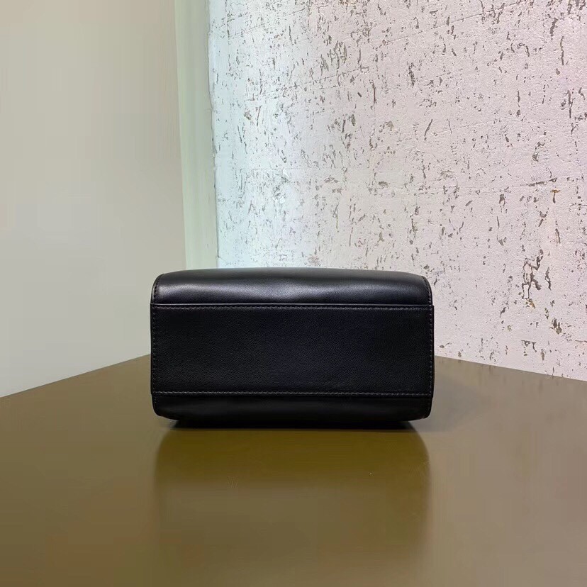 Small handbag made with two compartments divided by a stiff partition. Twist lock on both sides. Single handle and lined interior. The adjustable and removable chain shoulder strap with leather insert allows it to be worn on the shoulder or cross-body. Made of black nappa leather. Partition lined with tone-on-tone nappa leather.
