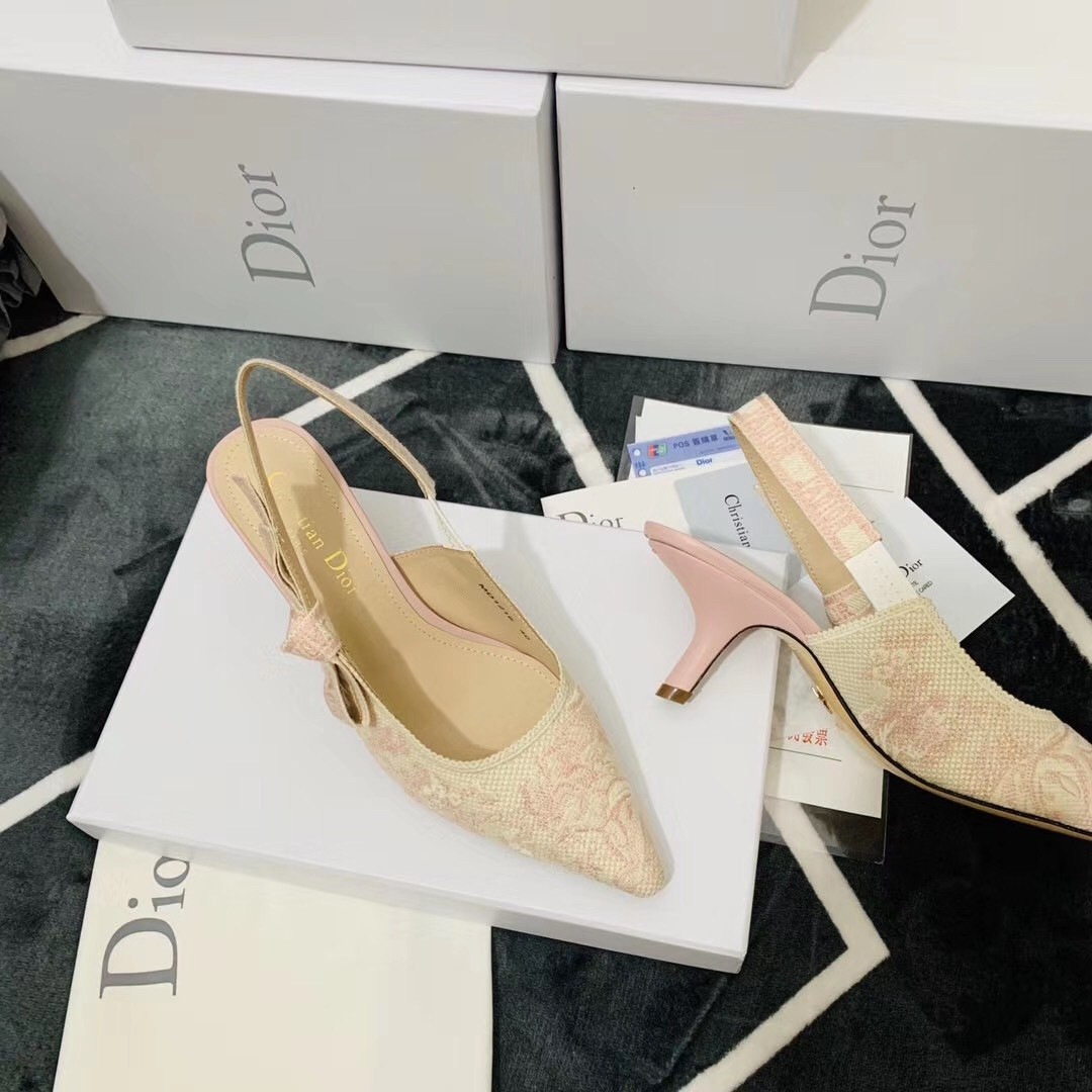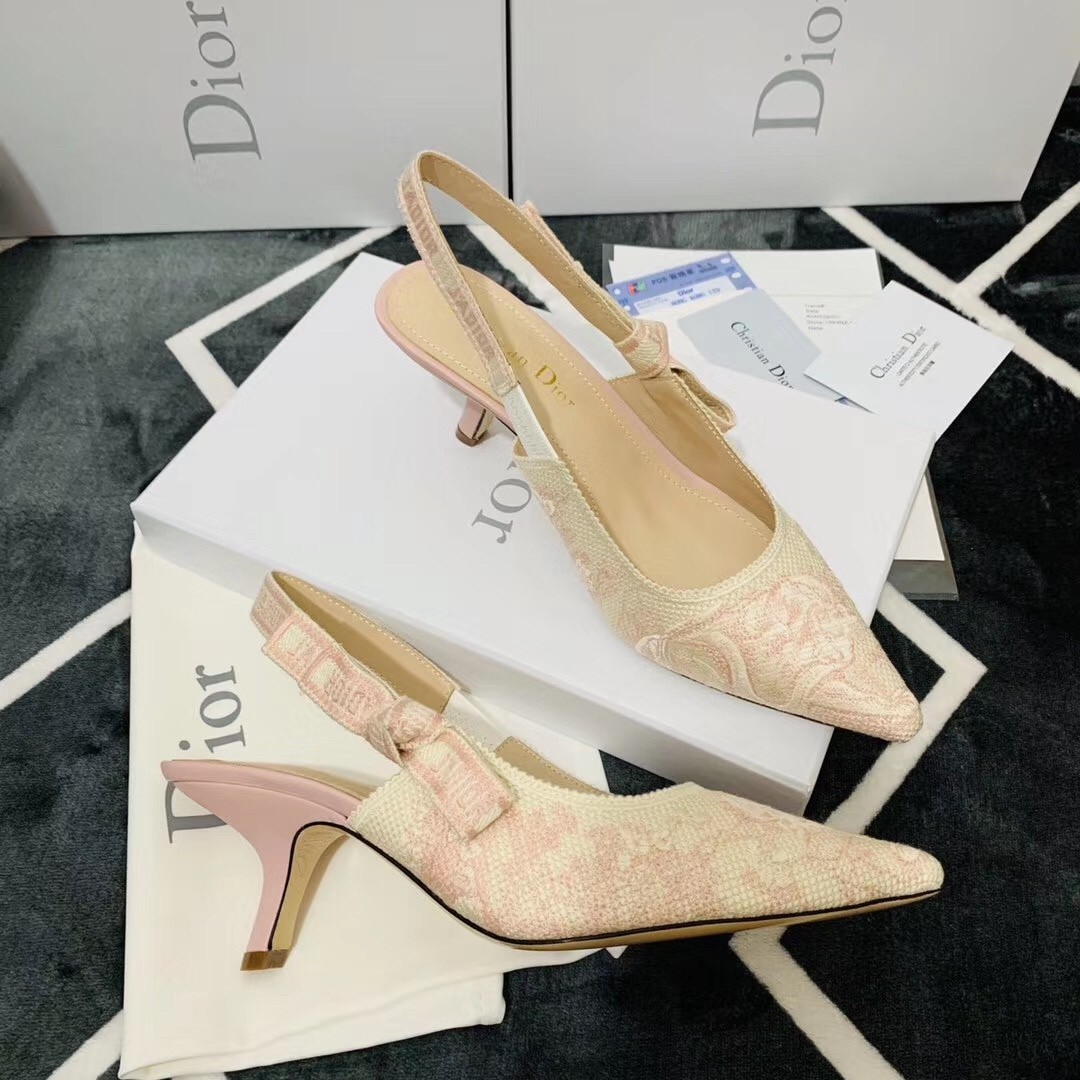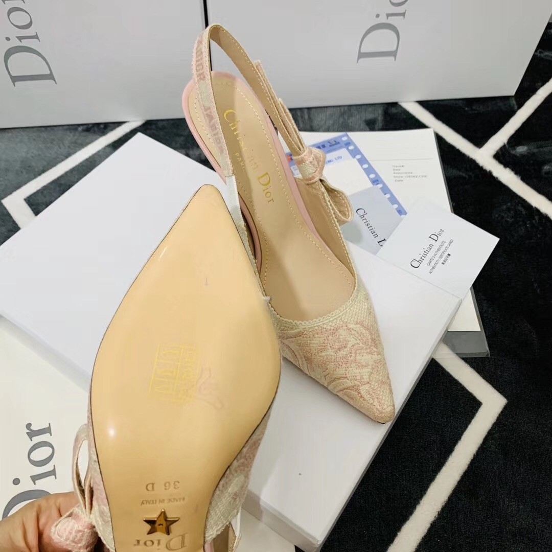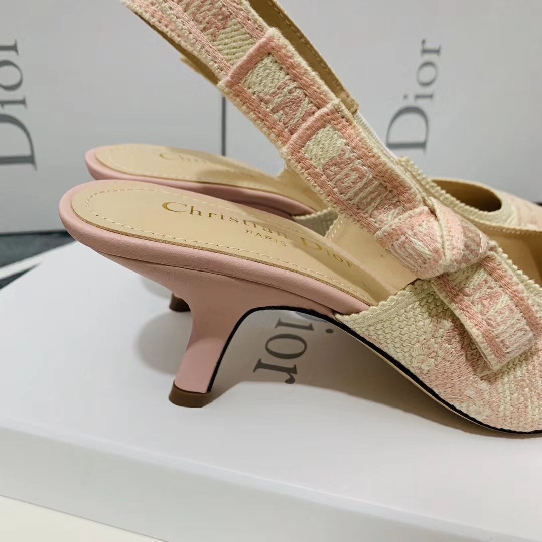 The J'Adior slingback pump presents an elegant and sophisticated aesthetic. Crafted from a light pink Toile de Jouy fabric, the low-cut upper combines with a 6.5 cm comma heel to create a strong silhouette. Signature Dior details adorn this emblematic style with the new two-tone 'J'Adior' embroidered cotton ribbon slingback strap and flat knot bow. Each pair is a veritable homage to the Christian Dior couture savoir-faire.