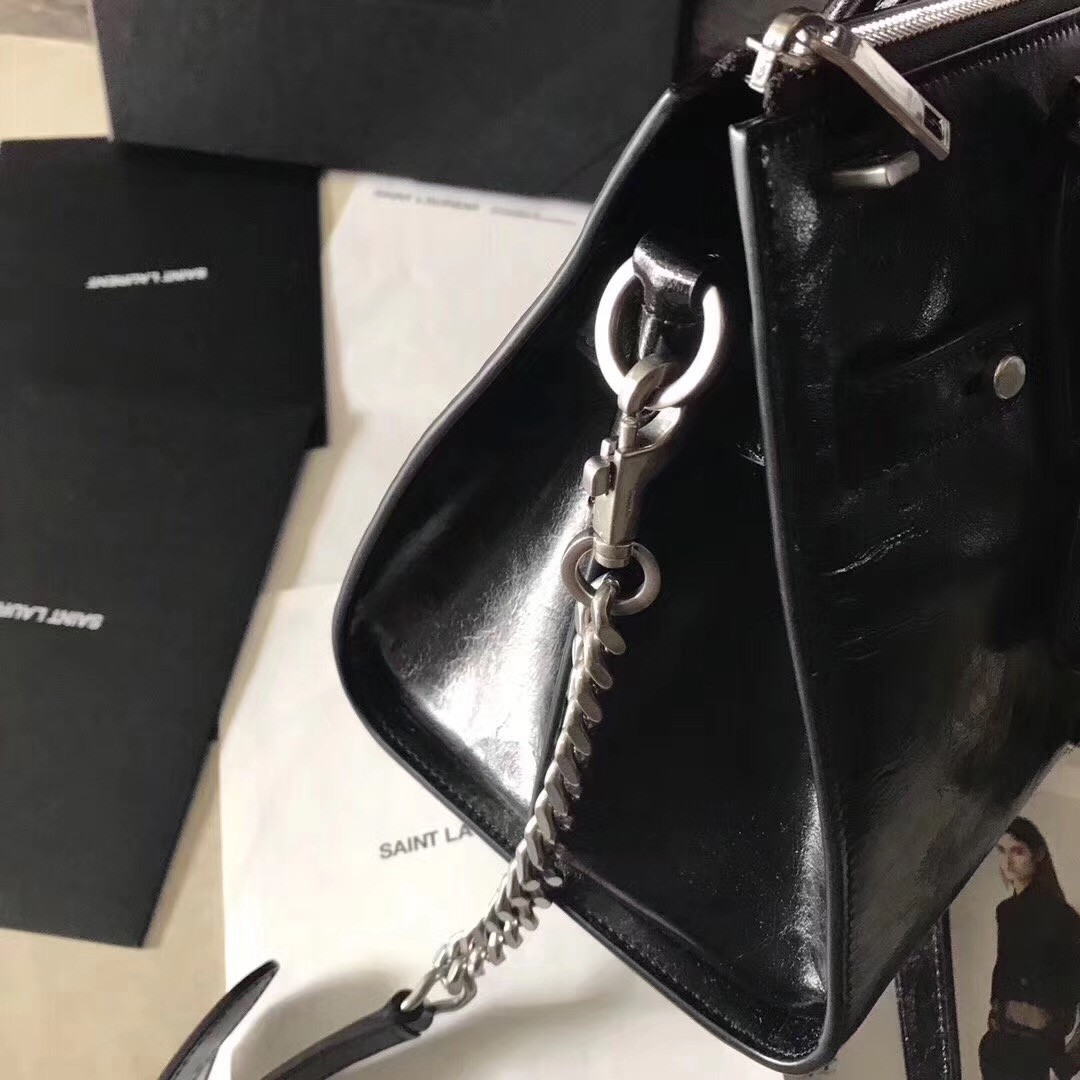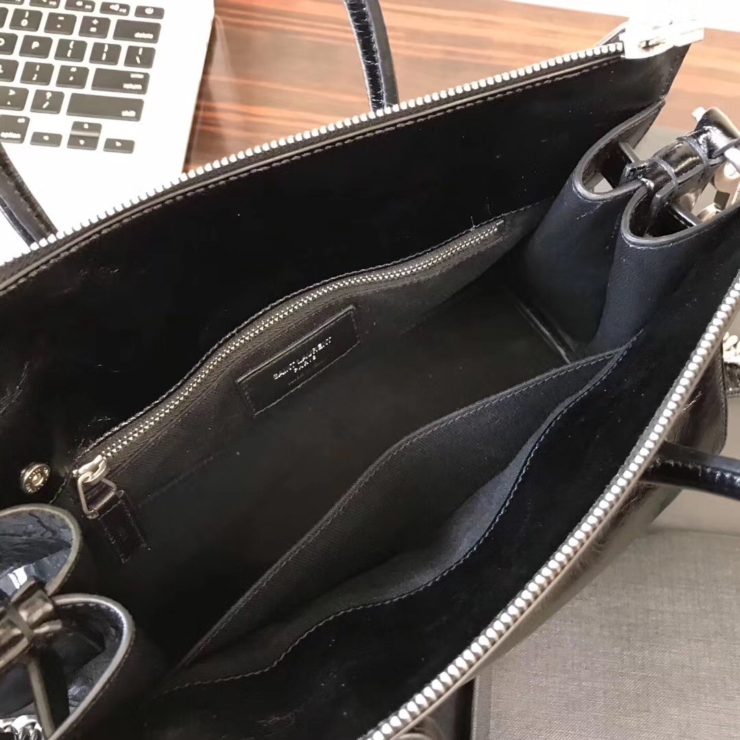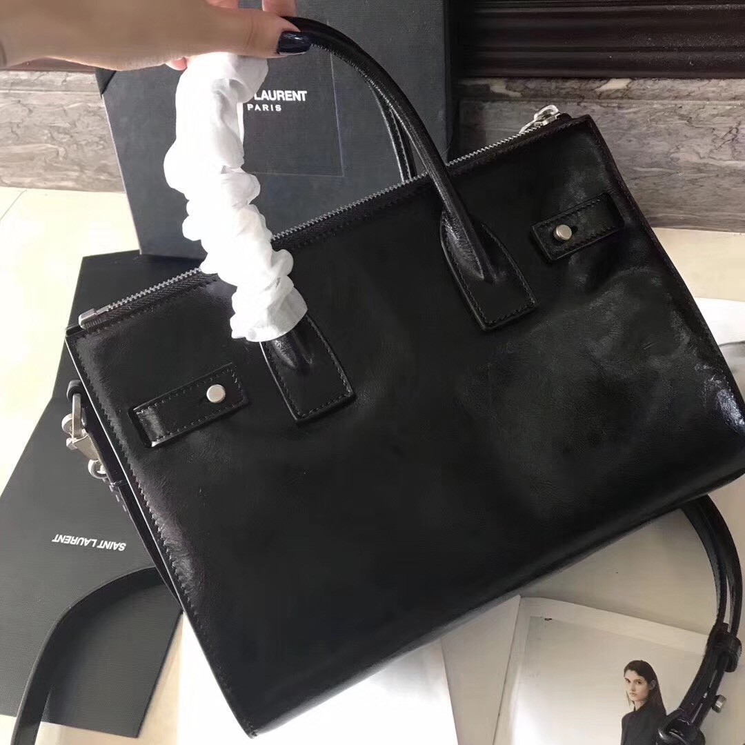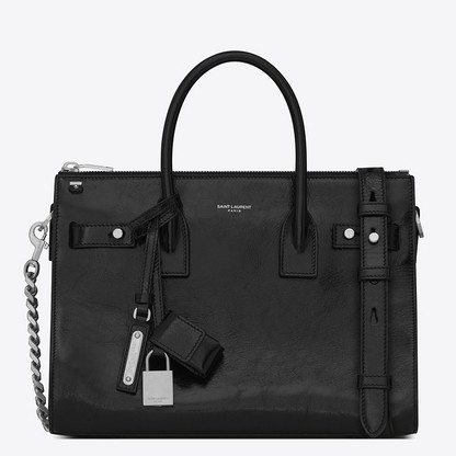 Saint Laurent is the rebranded version of the house of Yves Saint Laurent with creative director Hedi Slimane at the helm. Now considered a "Signature" Saint Laurent bag, this Sac de Jour tote features a sleek shape, accordion sides, tubular leather handles and an embossed Saint Laurent signature at the center. The fine textile interior boasts several pockets for storage. The beauty in this bag is surely in its simplistic nature.