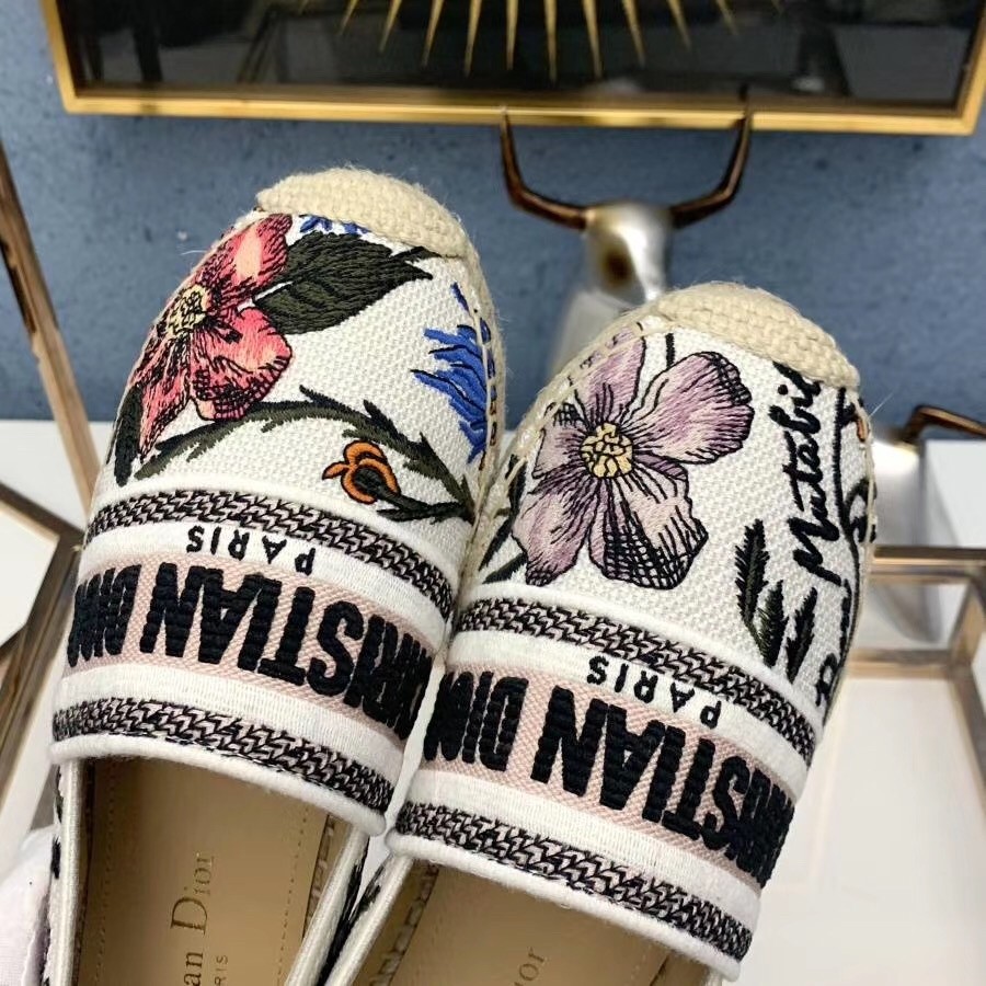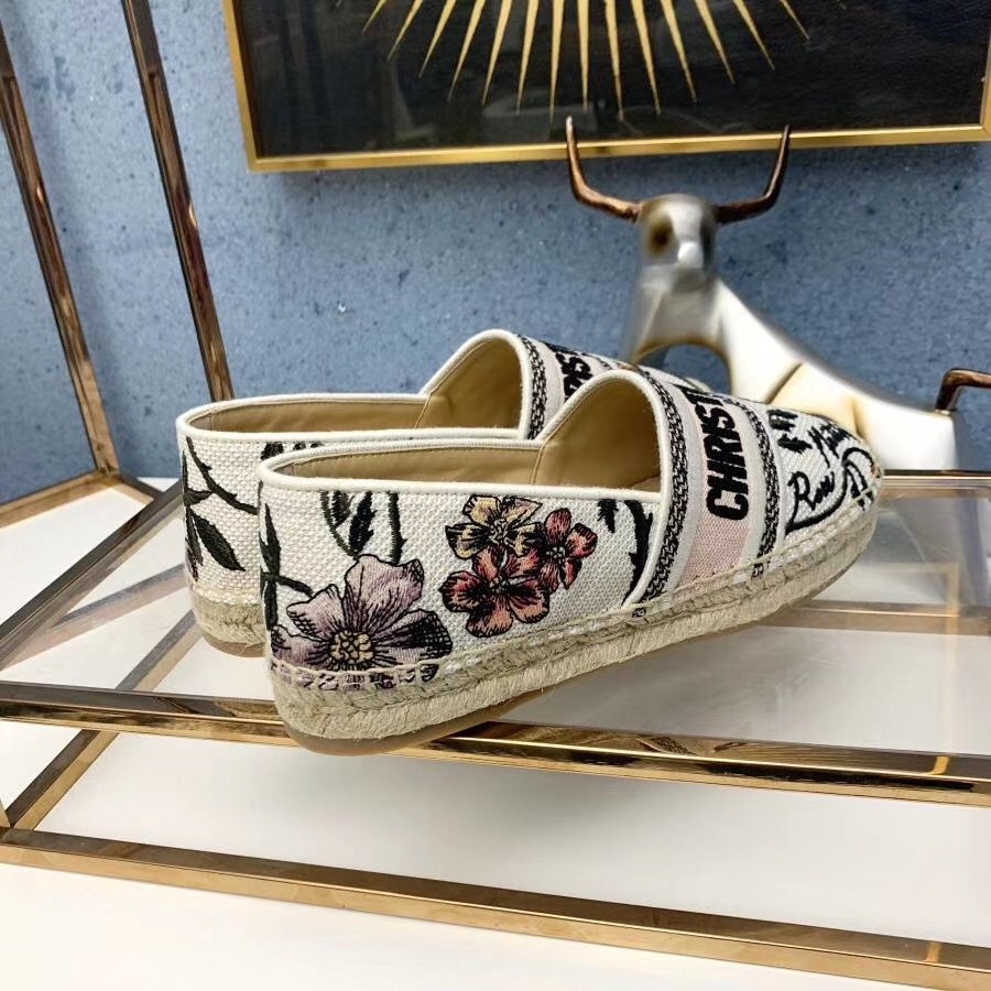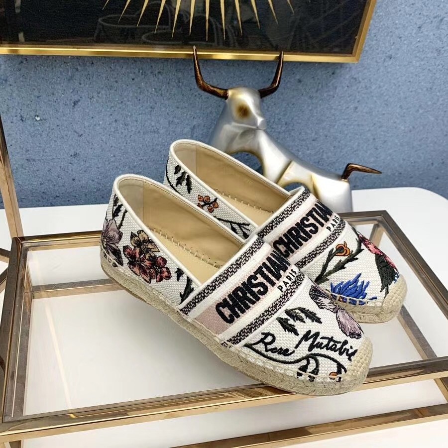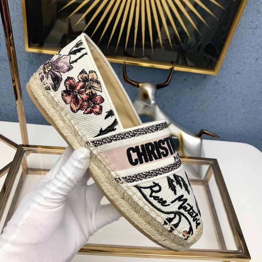 The Dior Granville espadrille has a relaxed feel. Portraying many classic design elements of the House, the shoe’s upper is fully embroidered with the 'Christian Dior' signature and the Rosa Mutabilis print. The sole is entirely handmade, using artisanal rope and traditional craftsmanship techniques, making it an emblematic summer staple.