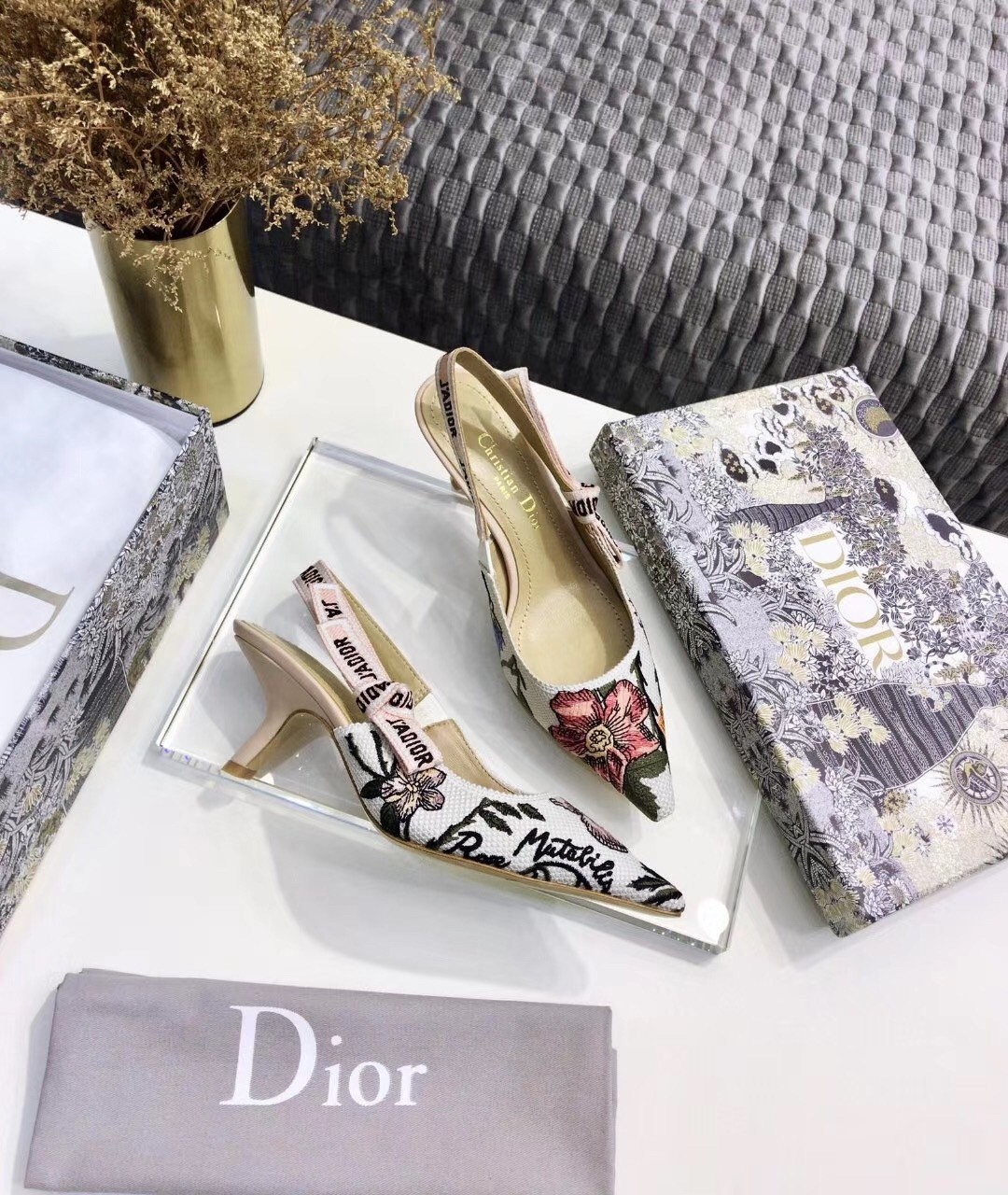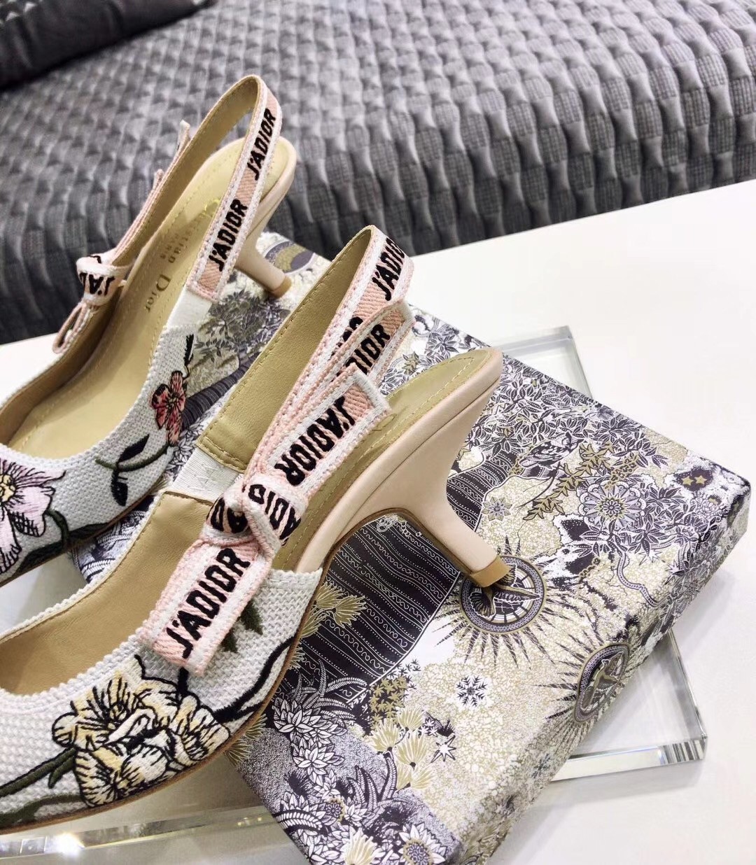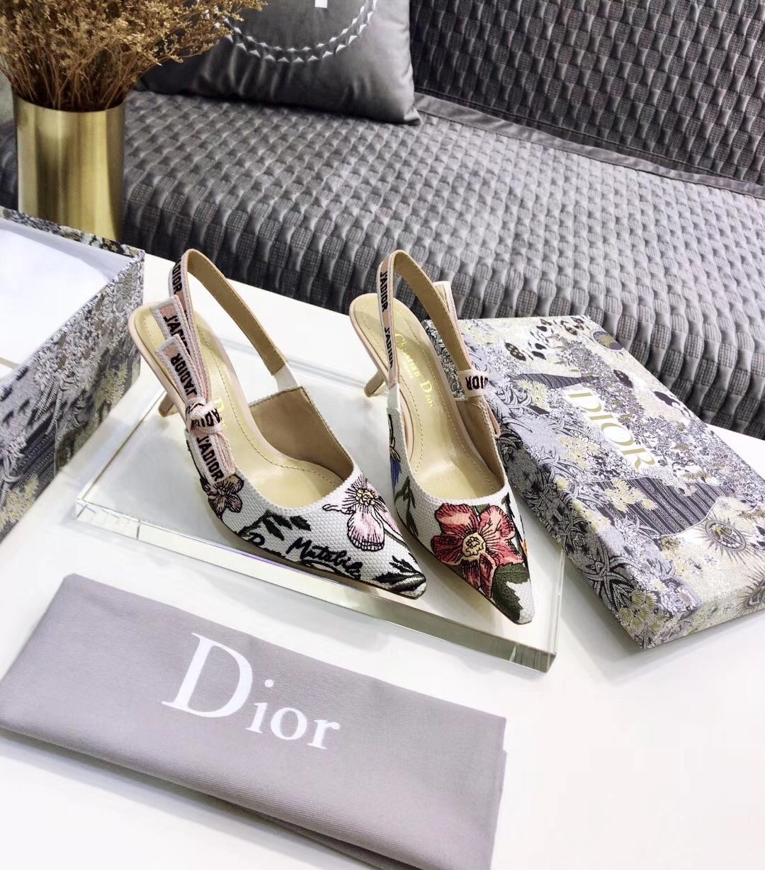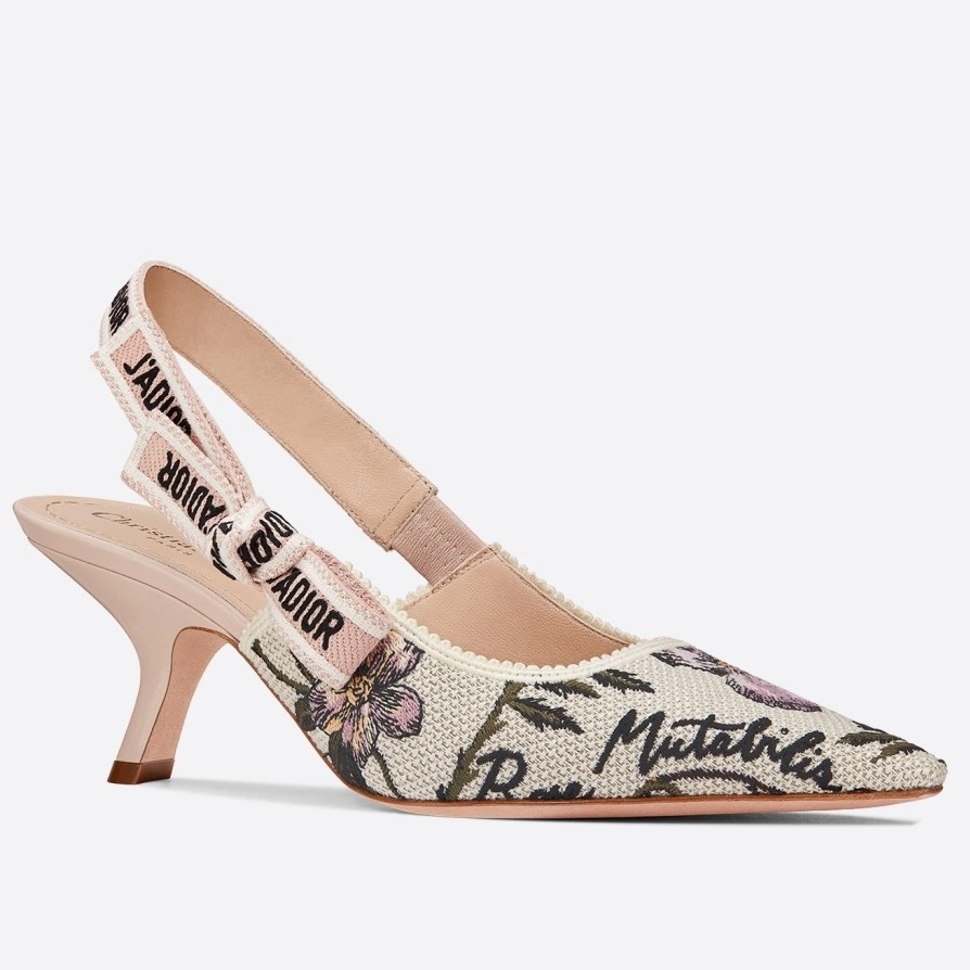 The J’Adior slingback pump presents an elegant and sophisticated aesthetic. Crafted from this season's new Rosa Mutabilis embroidered cotton, the low-cut upper combines with a 6.5 cm comma heel to create a strong silhouette. Signature Dior details adorn this emblematic style with a tricolor 'J’Adior' embroidered cotton ribbon slingback strap and flat knot bow. Each pair is a veritable homage to the Christian Dior couture savoir-faire.