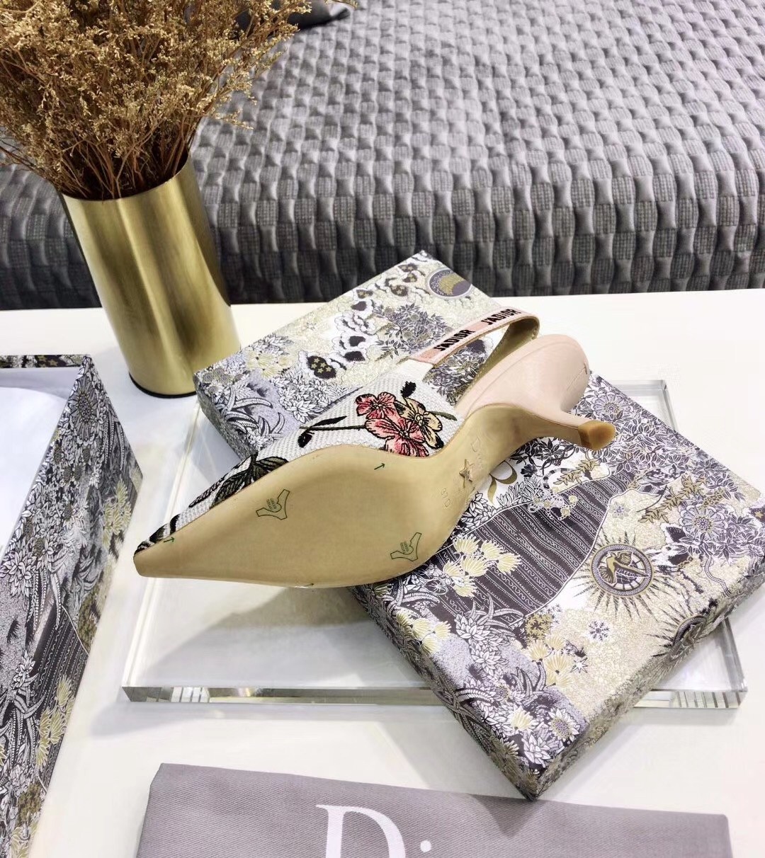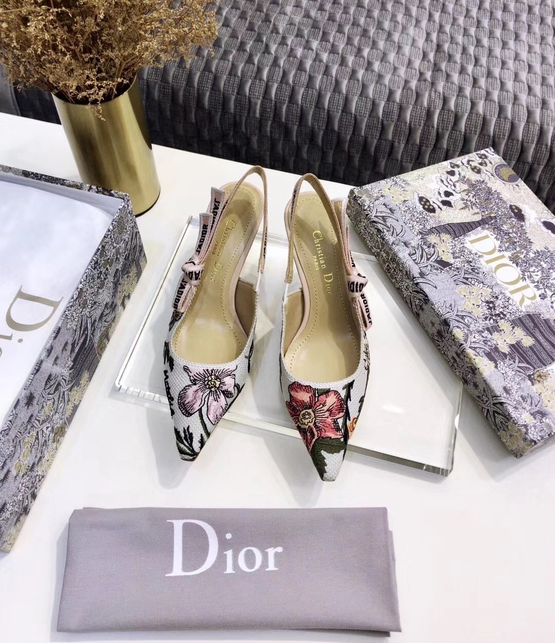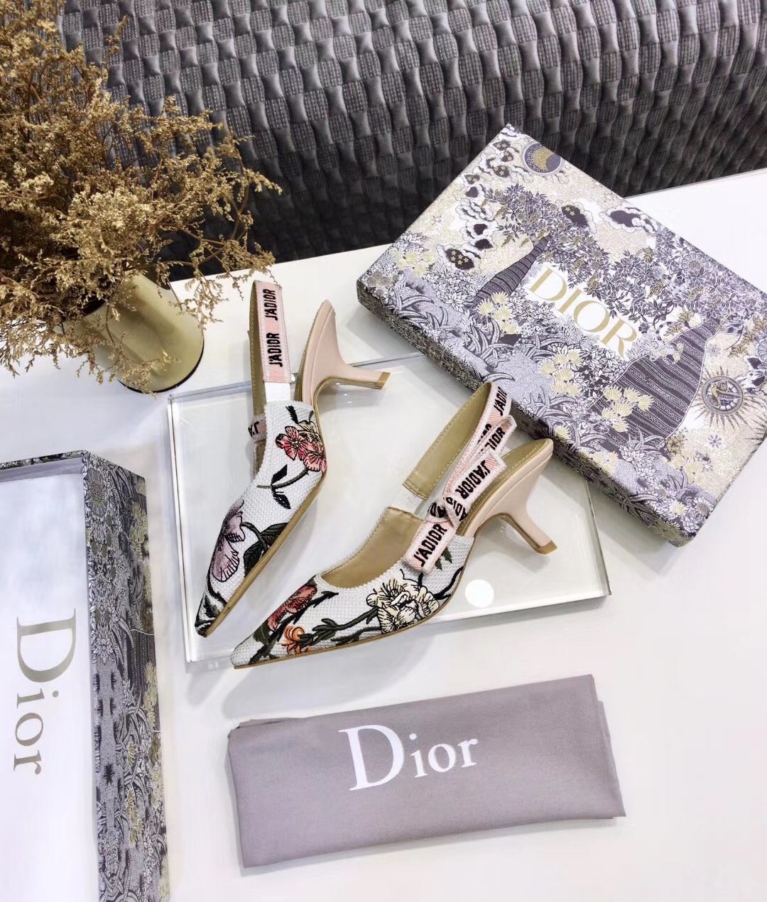 The J’Adior slingback pump presents an elegant and sophisticated aesthetic. Crafted from this season's new Rosa Mutabilis embroidered cotton, the low-cut upper combines with a 6.5 cm comma heel to create a strong silhouette. Signature Dior details adorn this emblematic style with a tricolor 'J’Adior' embroidered cotton ribbon slingback strap and flat knot bow. Each pair is a veritable homage to the Christian Dior couture savoir-faire.