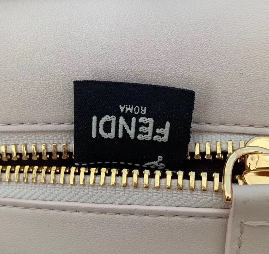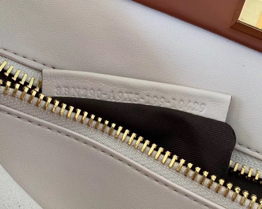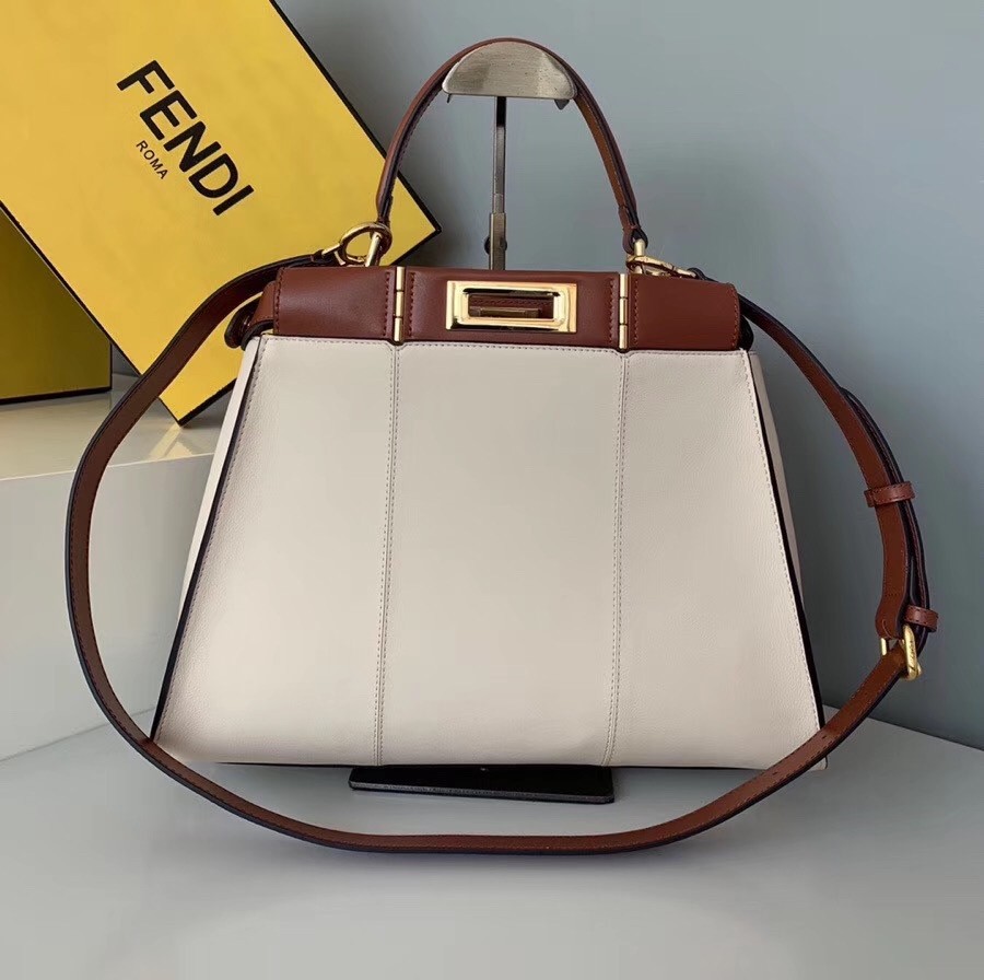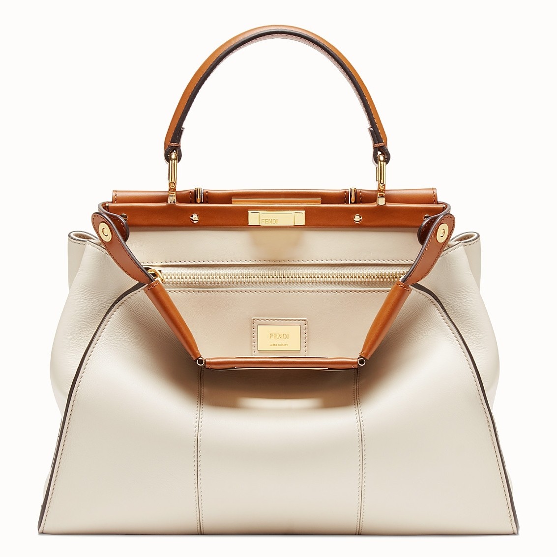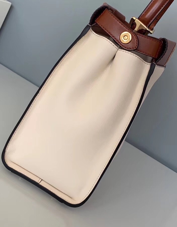Medium handbag made with two compartments divided by a stiff partition. Twist lock on both sides. Lining with zip pocket. Single handle and an adjustable, detachable shoulder strap. Made of white calfskin. Two-tone contrasting details. Gold-finish metalware.