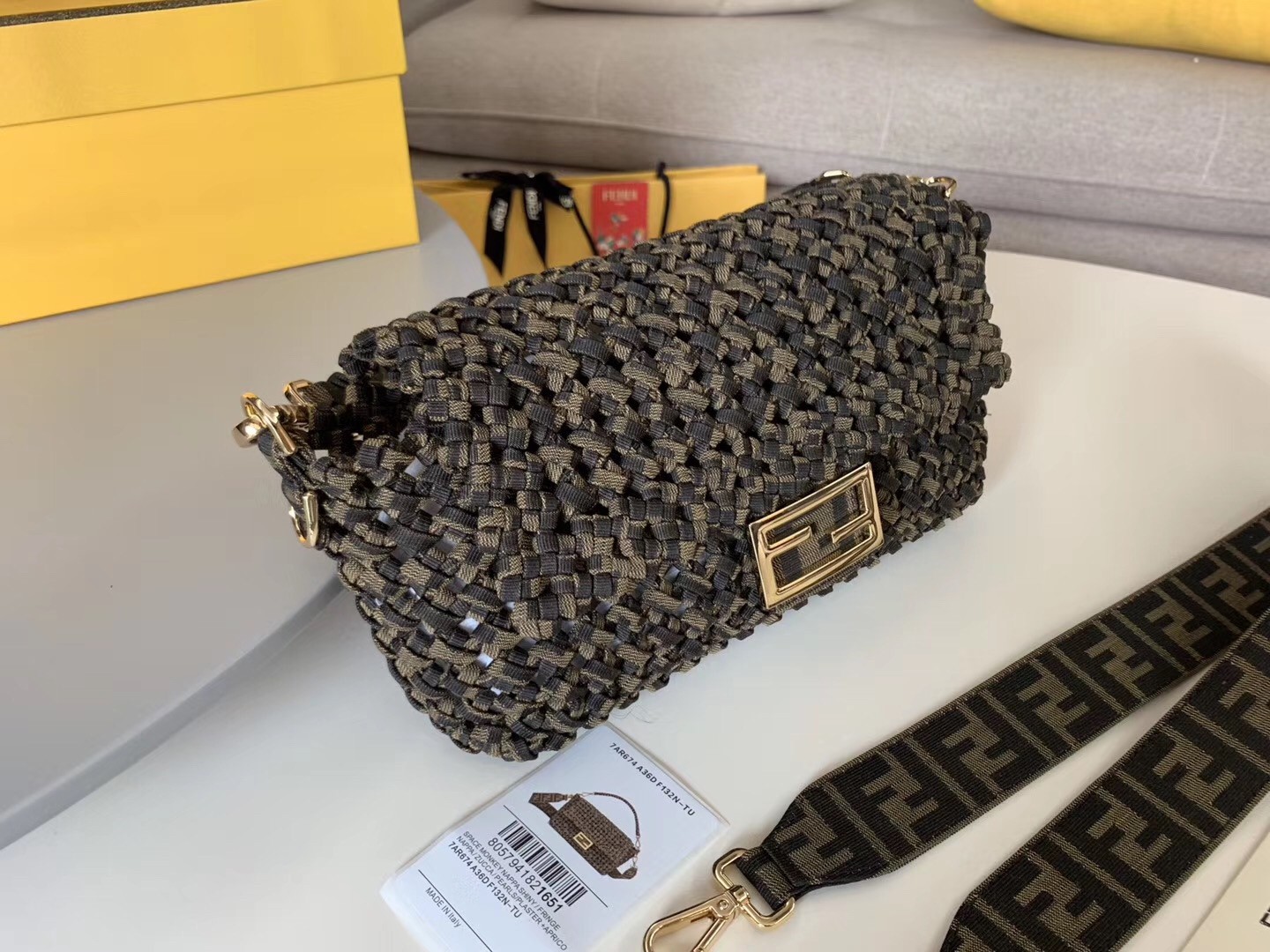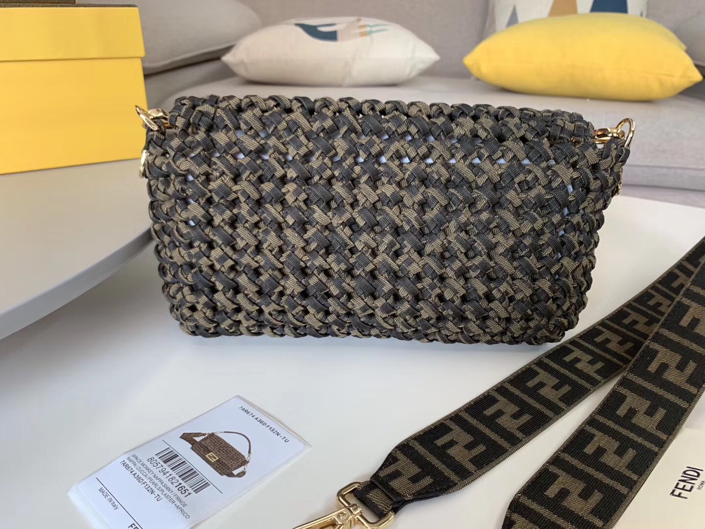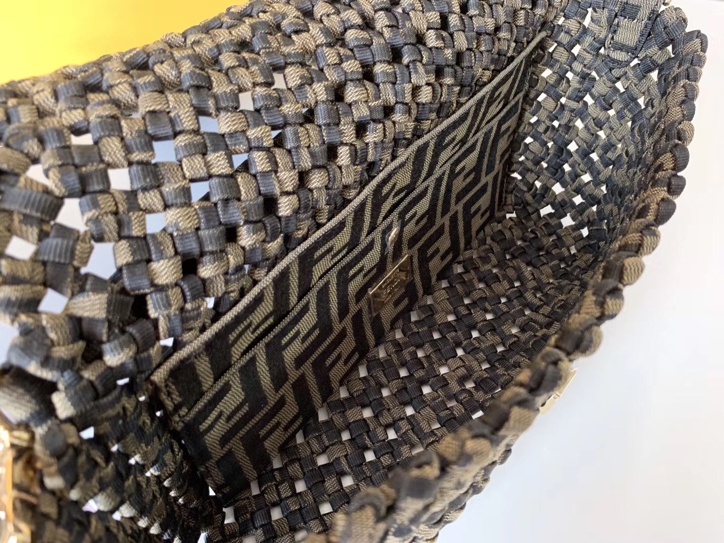 Iconic Baguette bag in medium size, with flap and FF fastening with magnetic clasp. Unlined with zip pocket. Can be carried by hand or worn cross-body thanks to the handle and shoulder strap, both detachable. Made with woven strips of FF jacquard fabric. Interior and shoulder strap trimmed in fabric with FF jacquard motif.