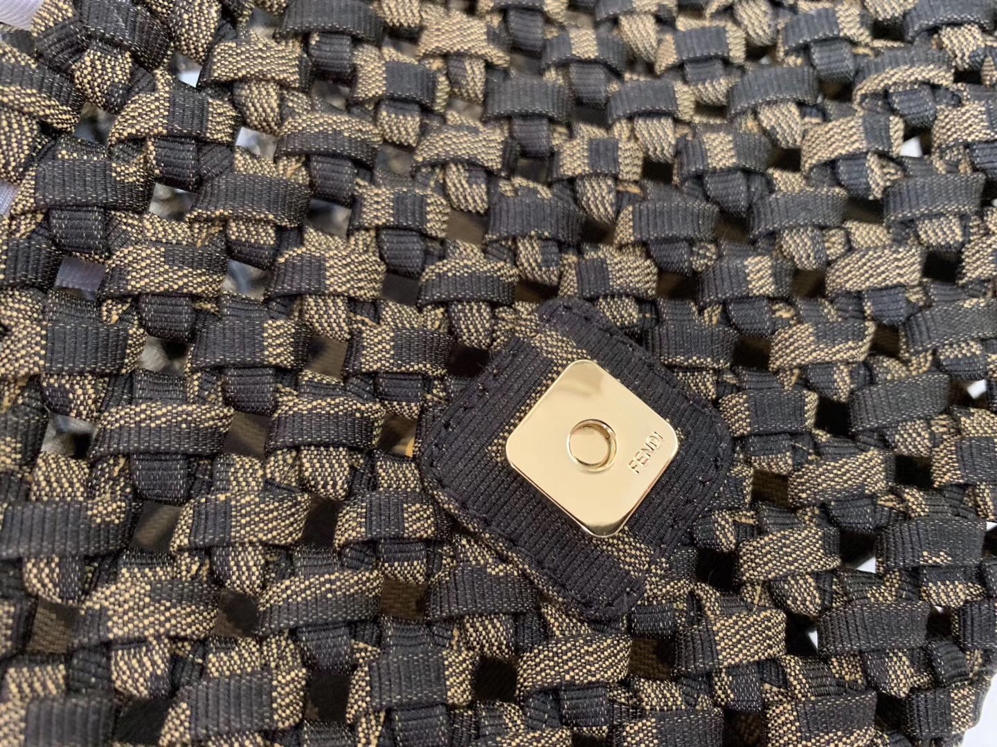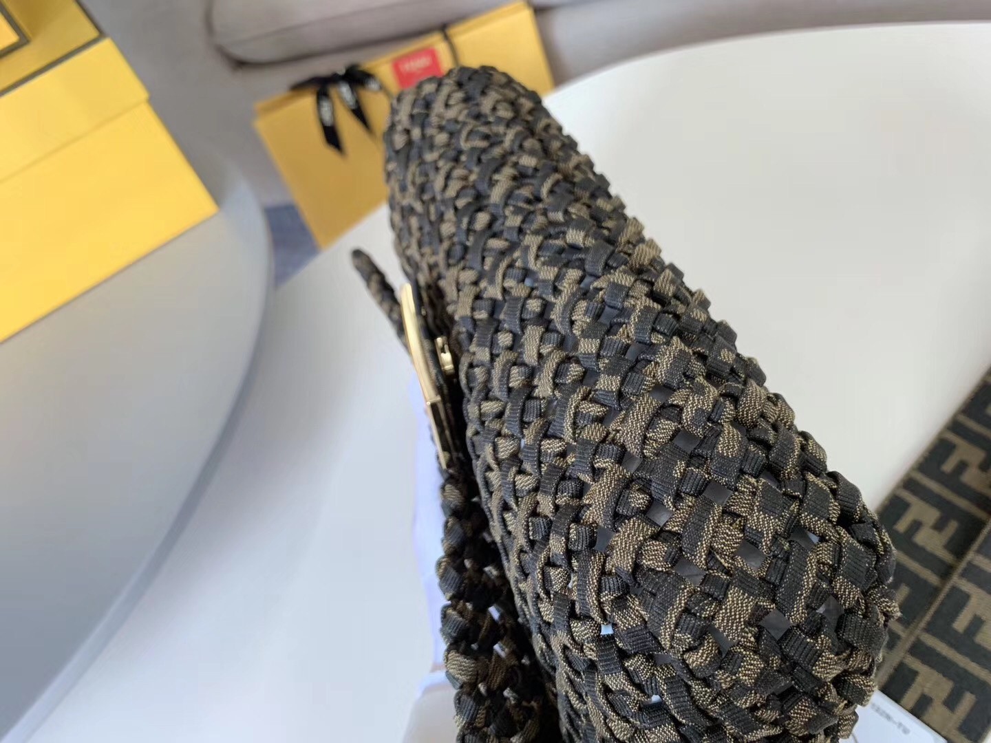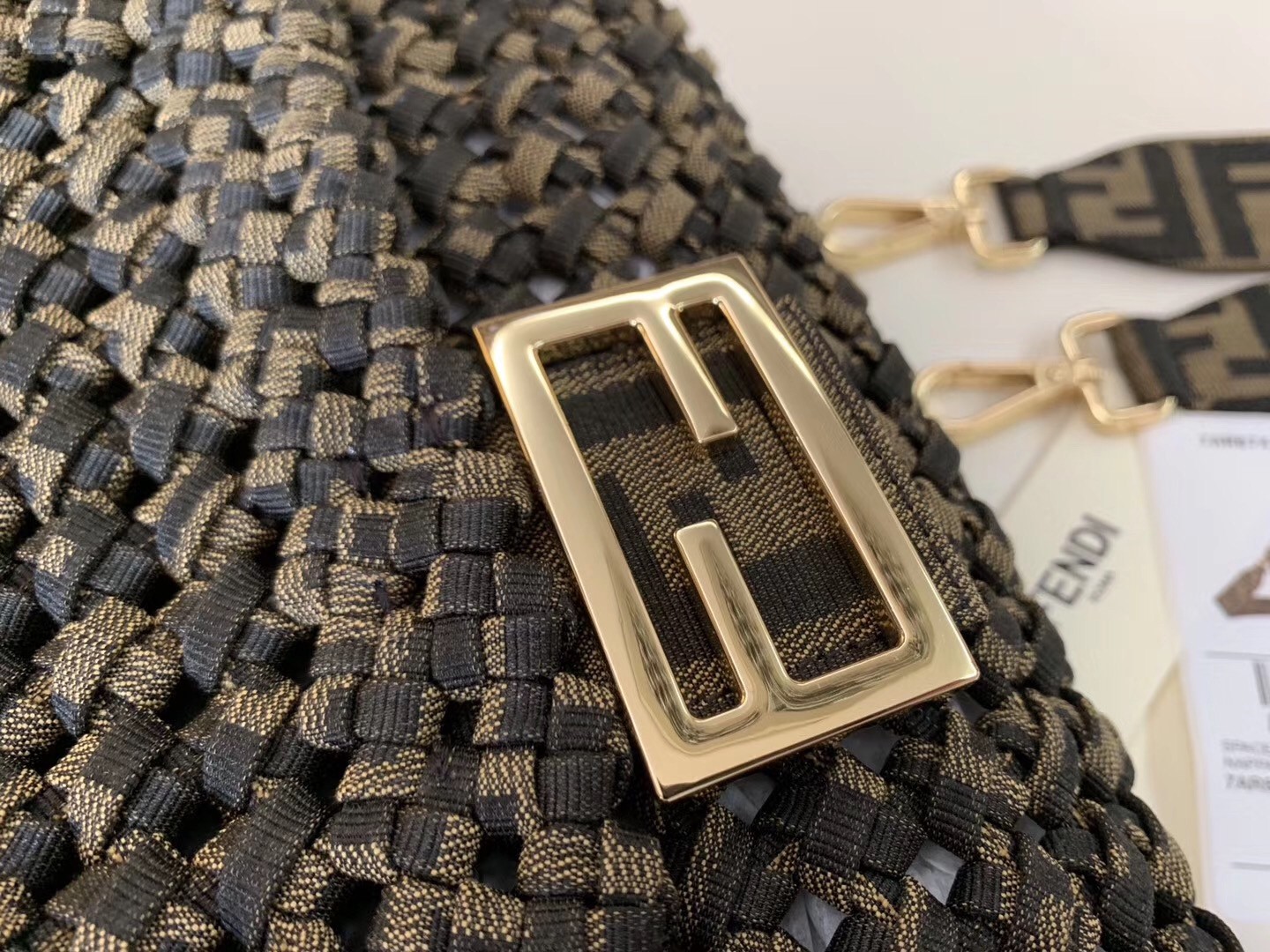 Iconic Baguette bag in medium size, with flap and FF fastening with magnetic clasp. Unlined with zip pocket. Can be carried by hand or worn cross-body thanks to the handle and shoulder strap, both detachable. Made with woven strips of FF jacquard fabric. Interior and shoulder strap trimmed in fabric with FF jacquard motif.