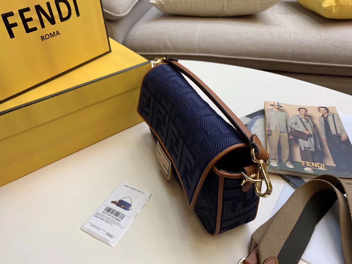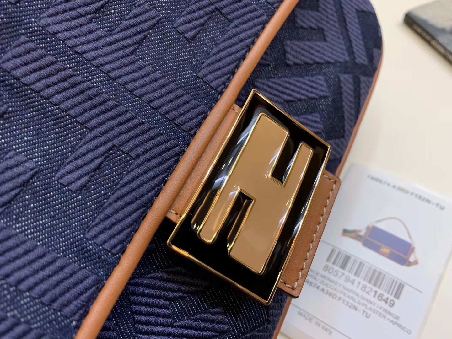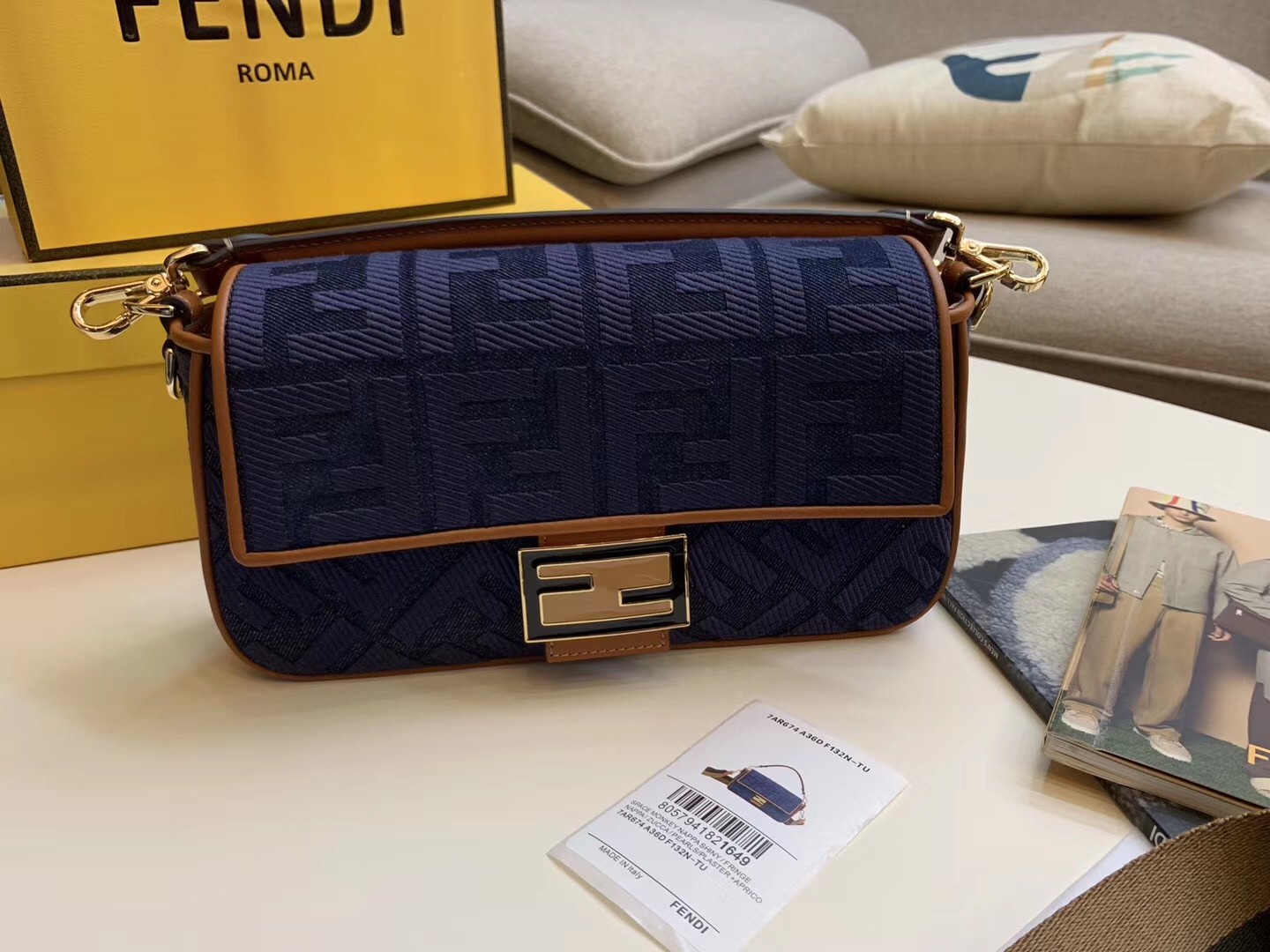 Iconic Baguette bag in medium size, with flap and FF fastening with magnetic clasp. Lining with zip pocket. Can be carried by hand or worn cross-body thanks to the detachable shoulder strap. Made of blue denim with embroidered FF motif. Finished with natural-colour leather details. Pequin webbing shoulder strap.