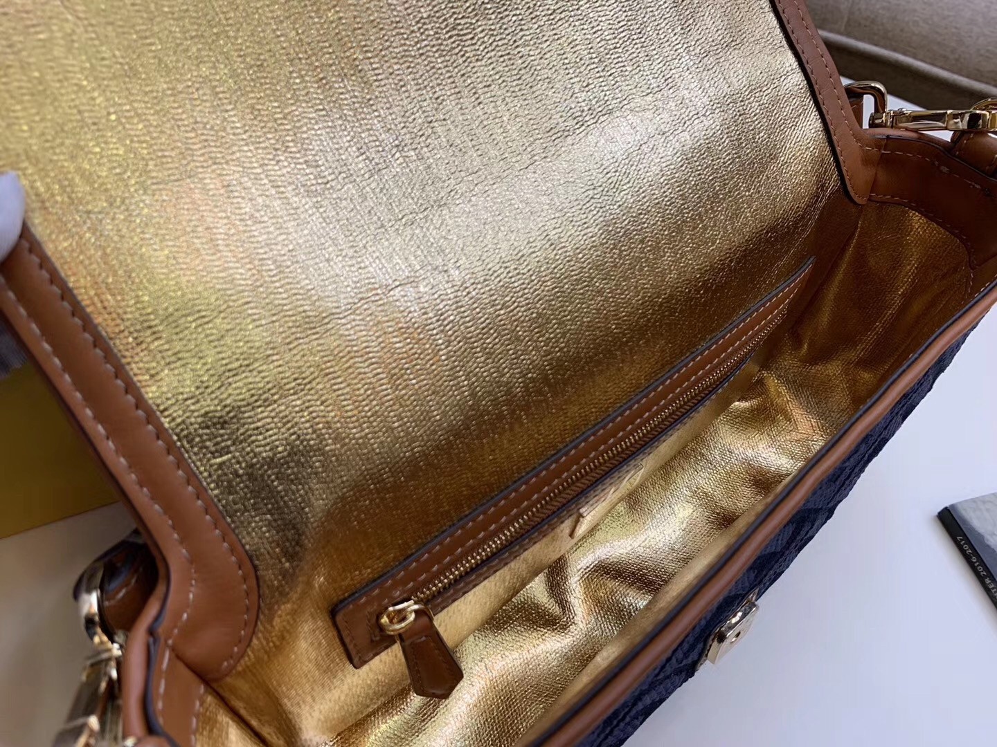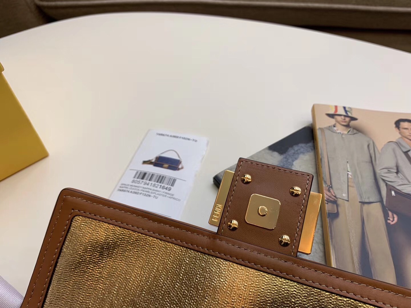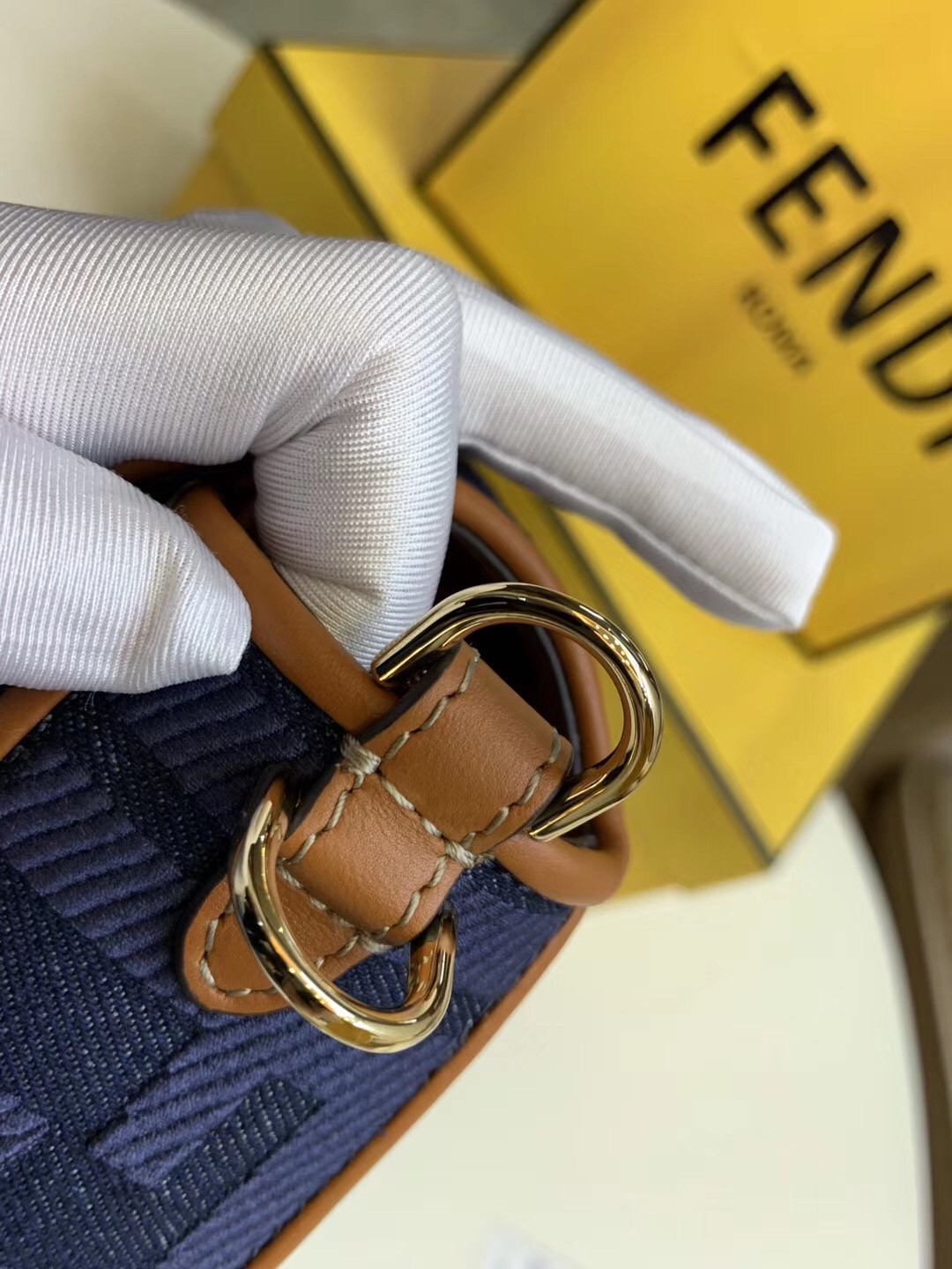 Iconic Baguette bag in medium size, with flap and FF fastening with magnetic clasp. Lining with zip pocket. Can be carried by hand or worn cross-body thanks to the detachable shoulder strap. Made of blue denim with embroidered FF motif. Finished with natural-colour leather details. Pequin webbing shoulder strap.
