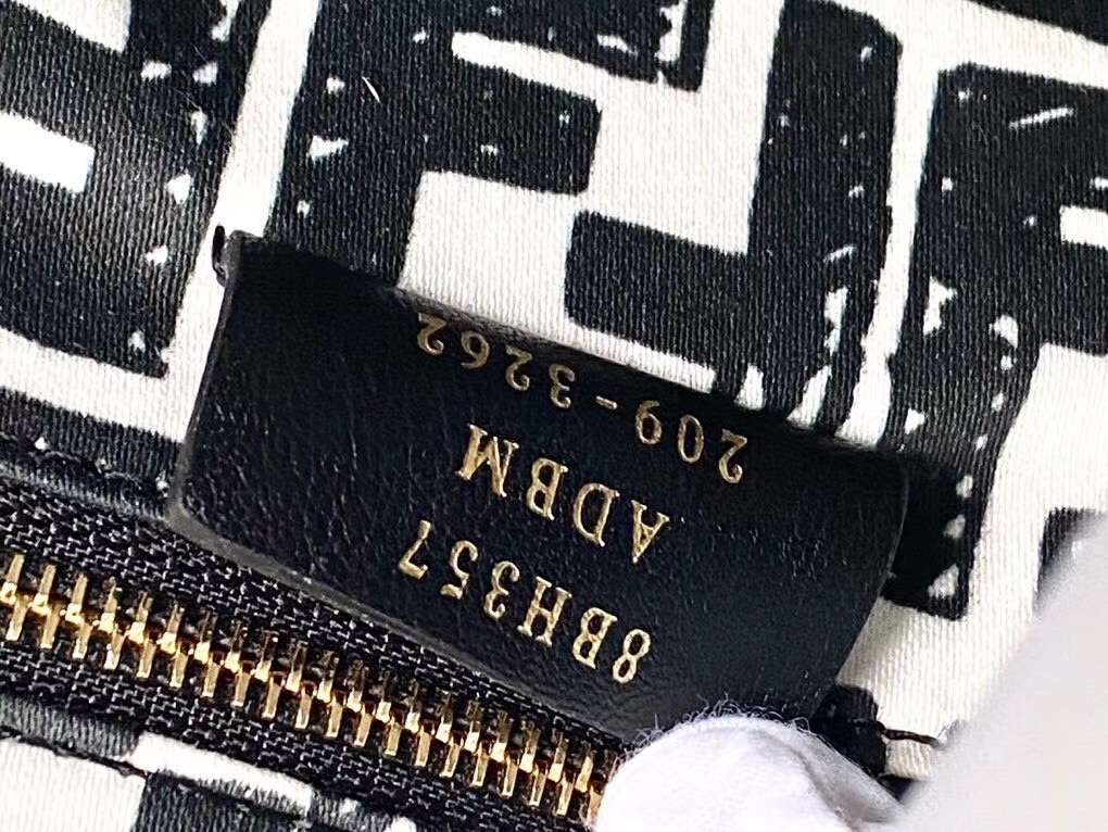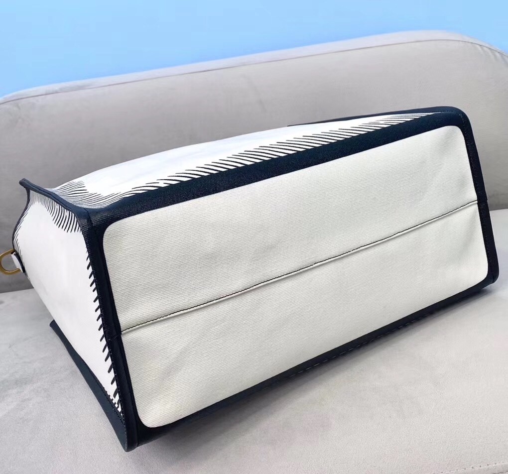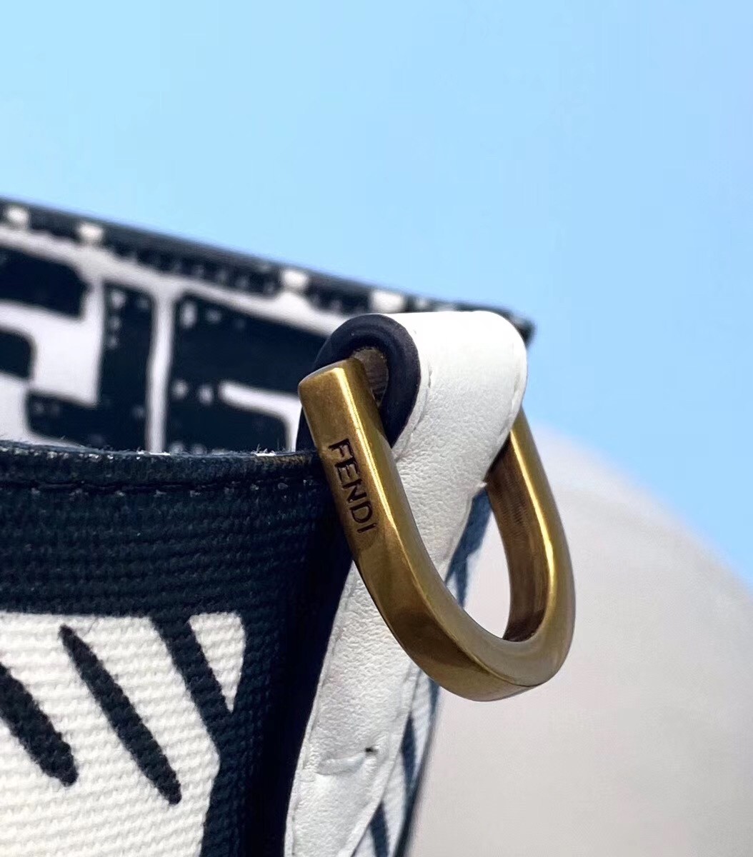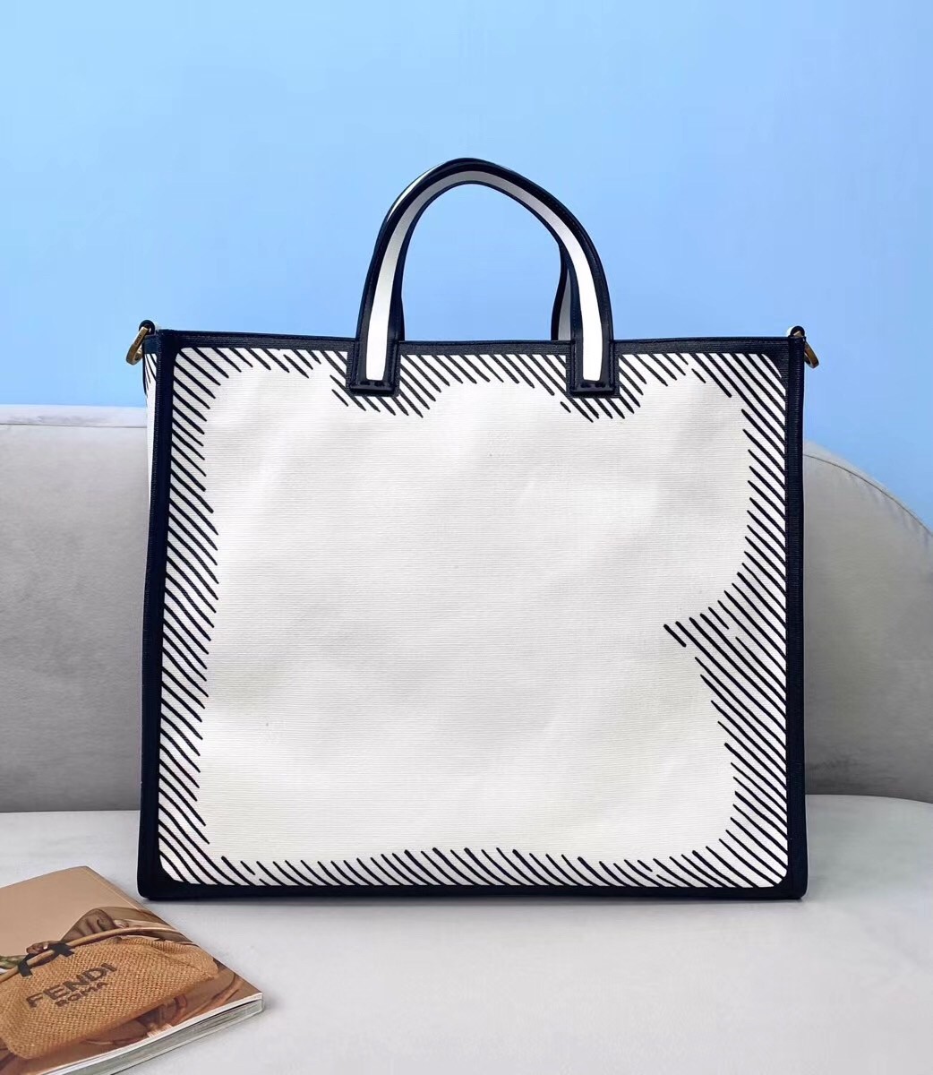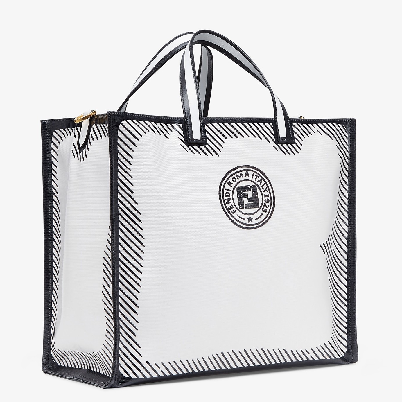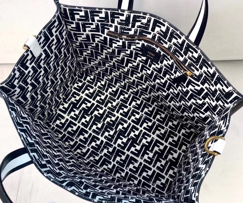 Shopper bag made of glazed, white fabric, decorated with edges and details marked by a contrasting graphic outline that gives a two dimensional effect and creates a black Fendi Stamp.Featuring a spacious internal compartment with FF motif, an inner zip pocket and gold-finish metalware. Can be carried by hand with the two handles, and two inner hooks allow you to attach a shoulder strap.